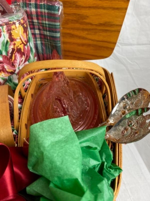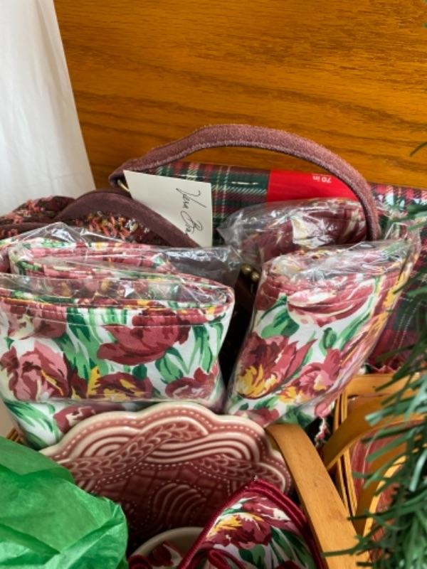 Longaberger Basket Wes tall lamp print and trivet with flower pot and Longaberger pink glass hand covered hen dish , salad serving set, vera Bradley Handbag and much more