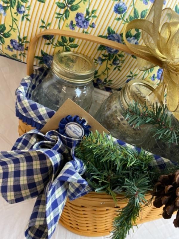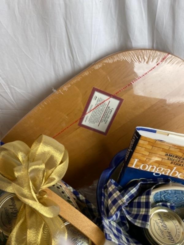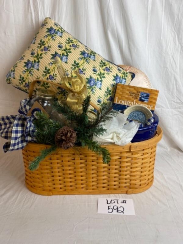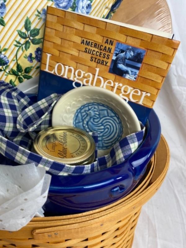 Longaberger Work load basket with lid , ( approx 22” long) rose trellis pillow , blue ribbon jar with basket , blue planter, book and blue rooster spoon rest