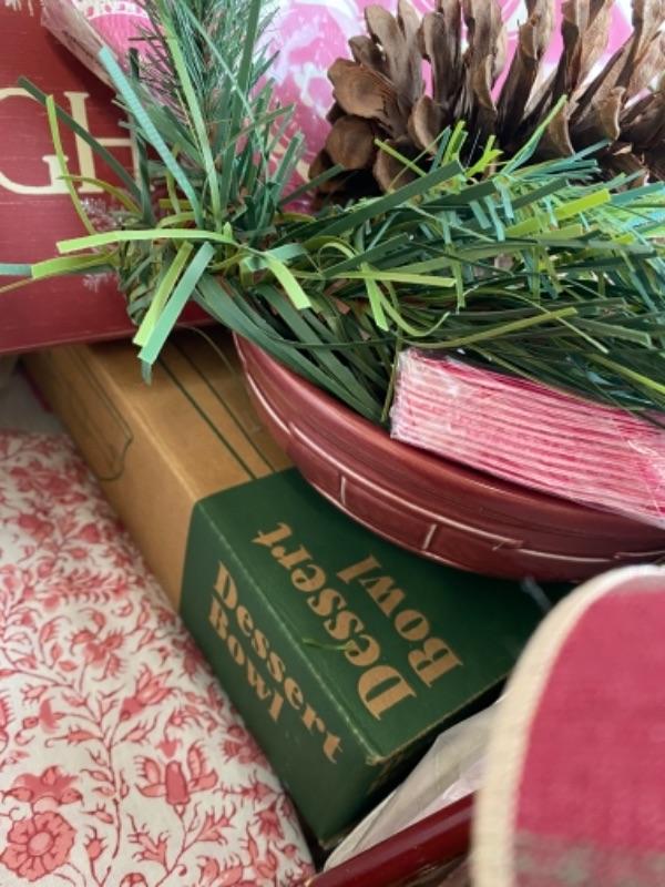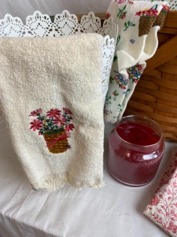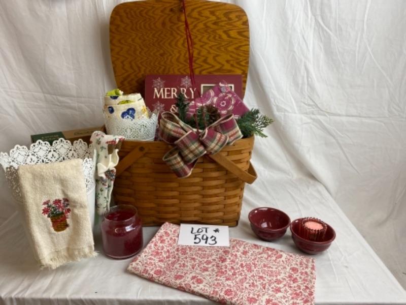 Longaberger large picnic basket with cereal bowl and ramekins, two white tin vases , candles, picture frame, table cloth