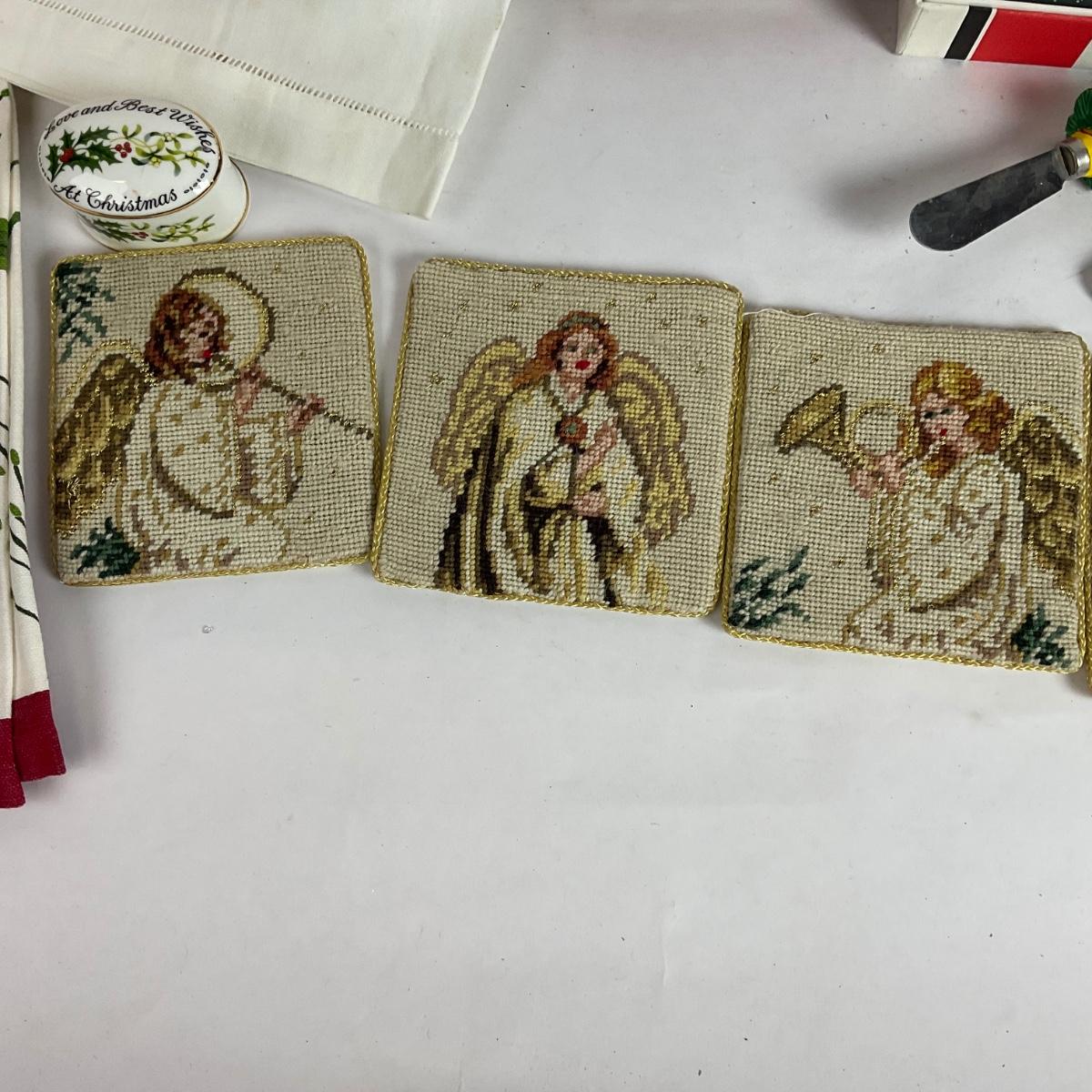 various Christmas themed coaster, needlepoint angel coasters, handtowels, silhouette, and more