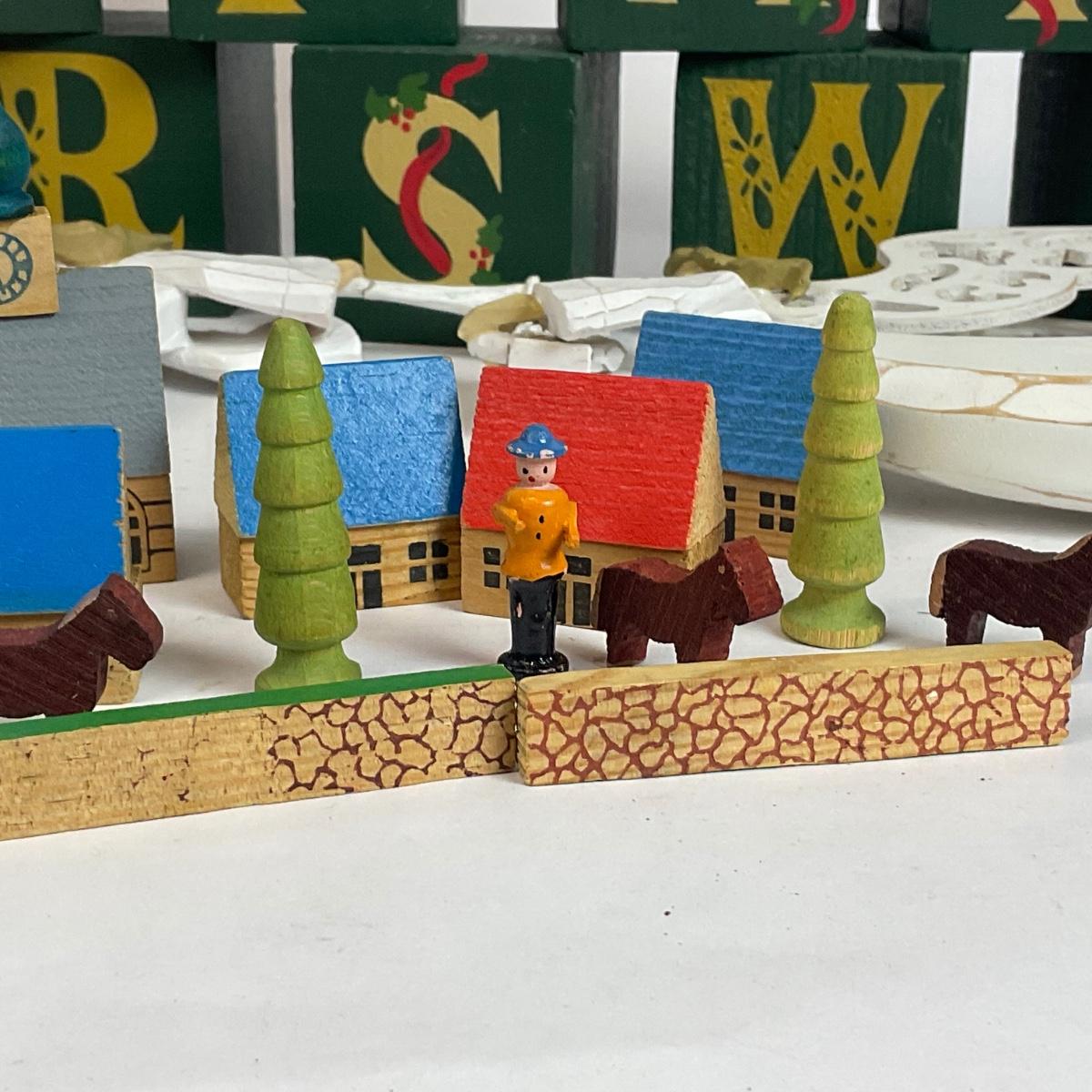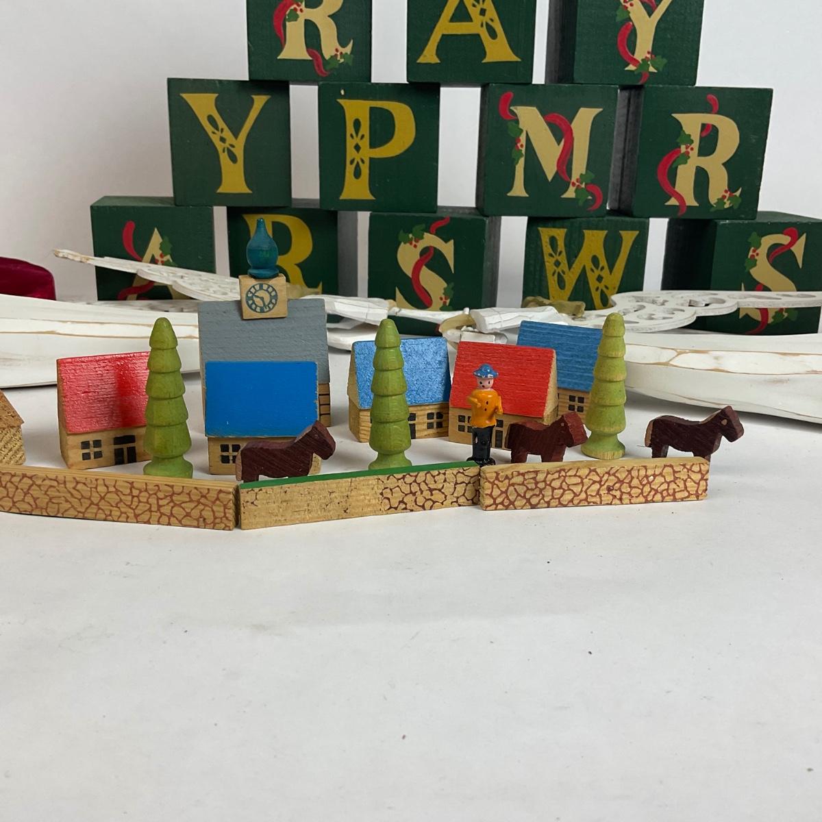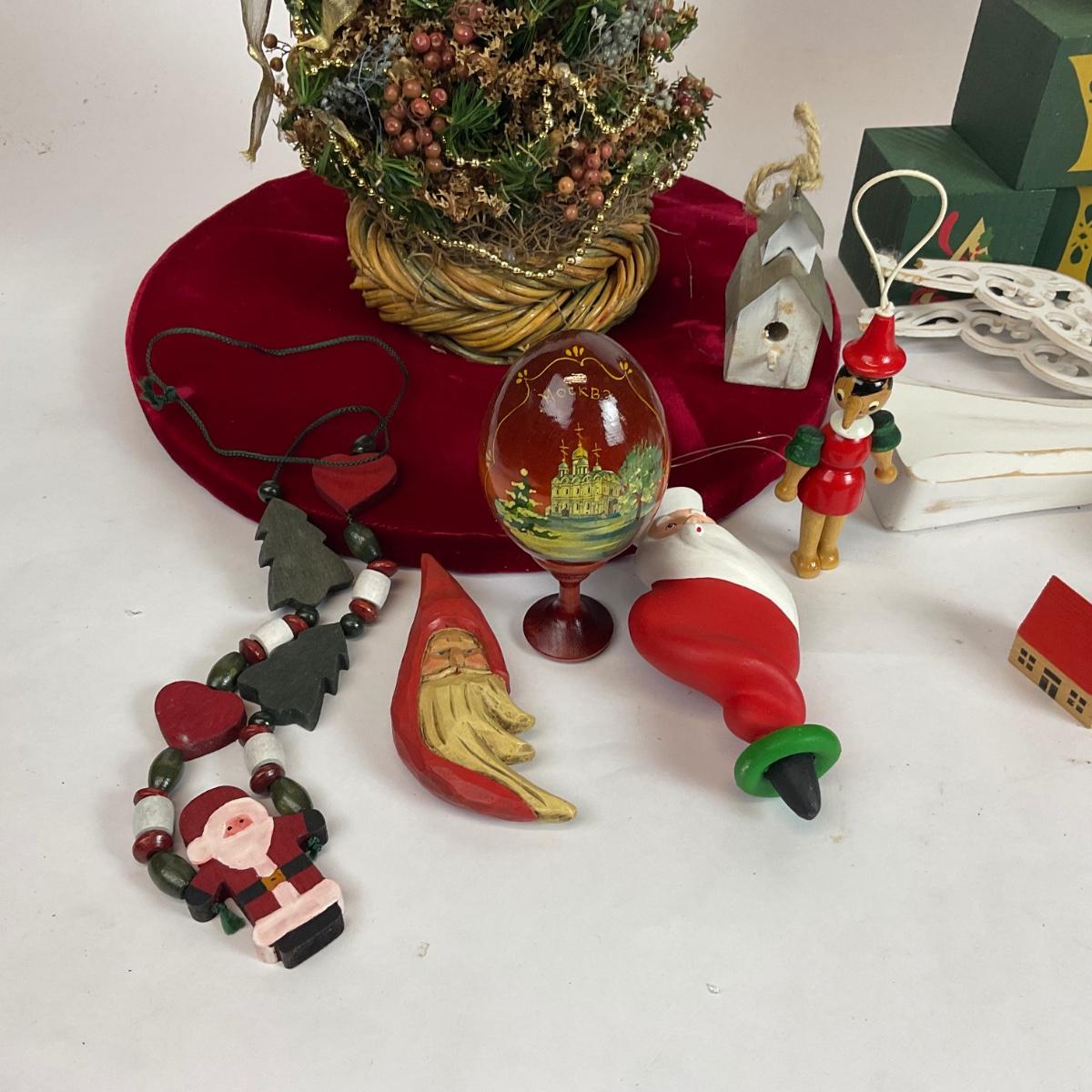 Z598 Wooden Christmas Decor Lot with Miniature Tree and Ornaments