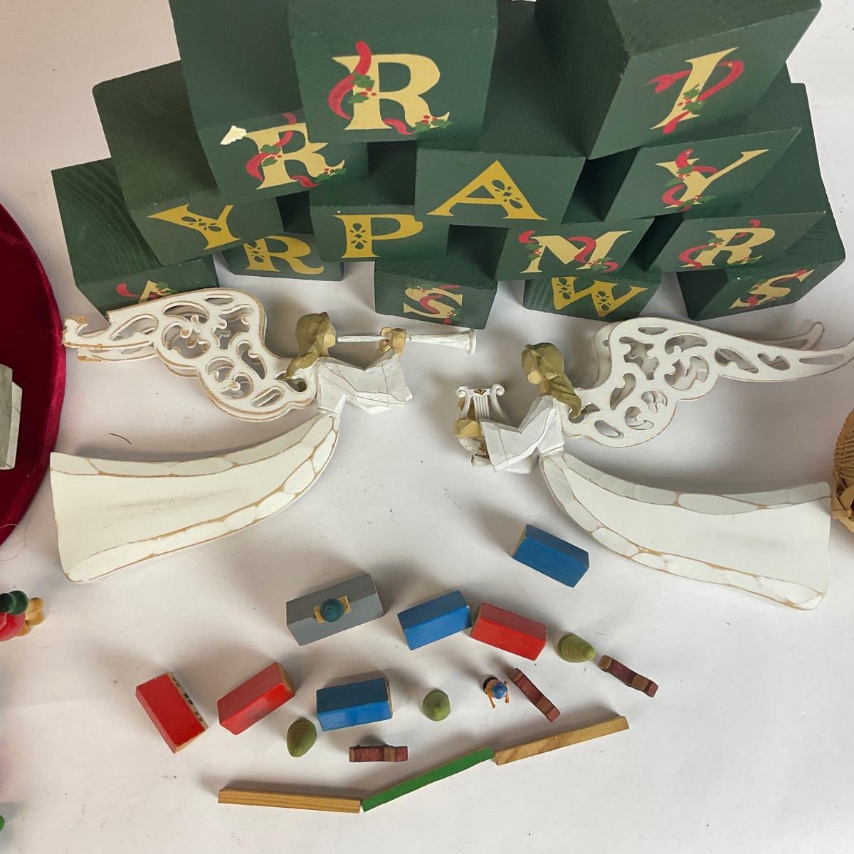 various Christmas decor with wooden angels and more