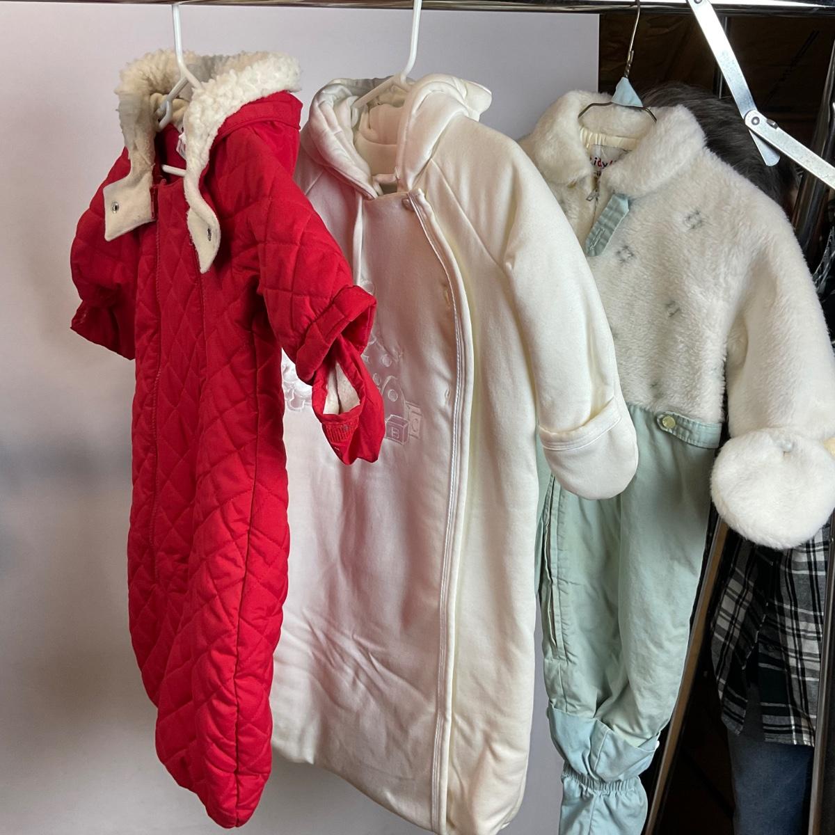 various one piece suits, wool coats, plaid jumper, snowflake sweater