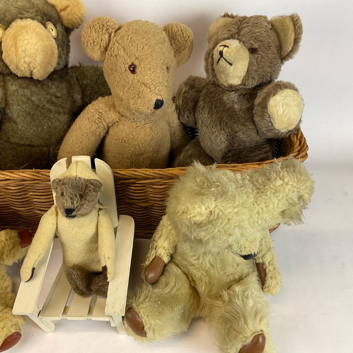 Z729 Lot of Vintage Large Teddy Bears with Wicker Basket