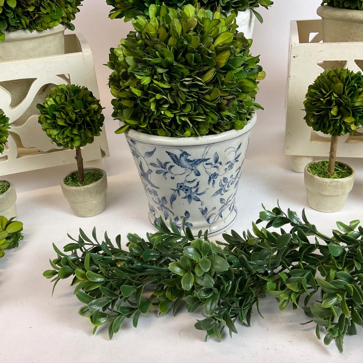 faux preserved green boxwood garland, with small planters and more tallest tree 13.5” x small topiary is 6” high