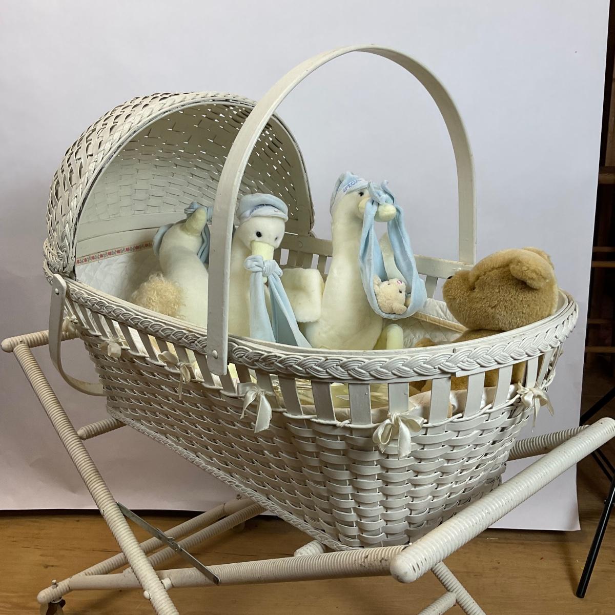 Z745 Vintage White Wicker Bassinet on Folding Stand with Accessories