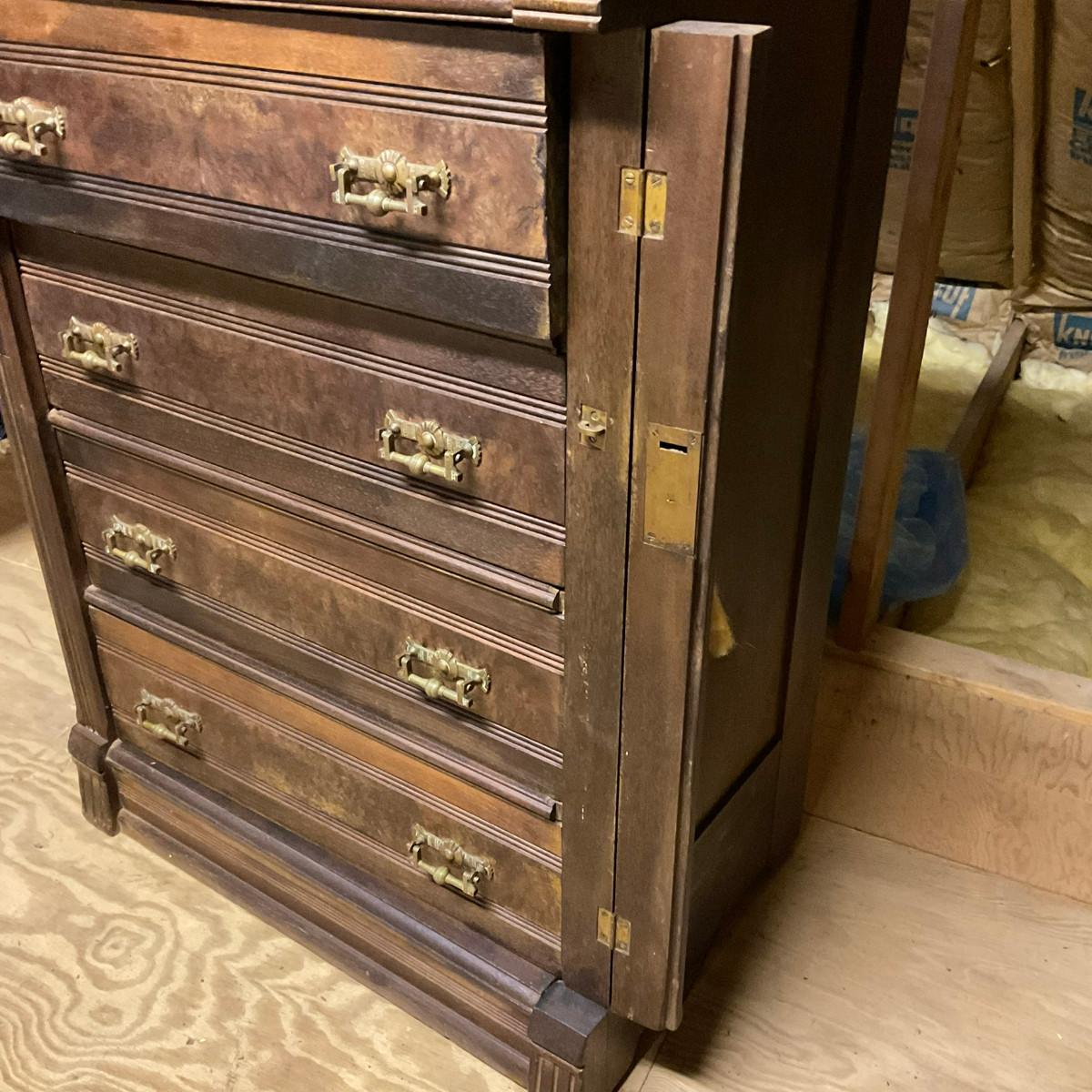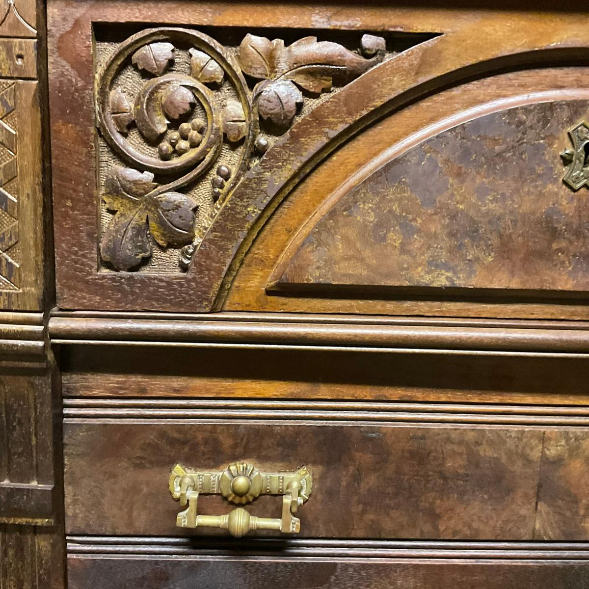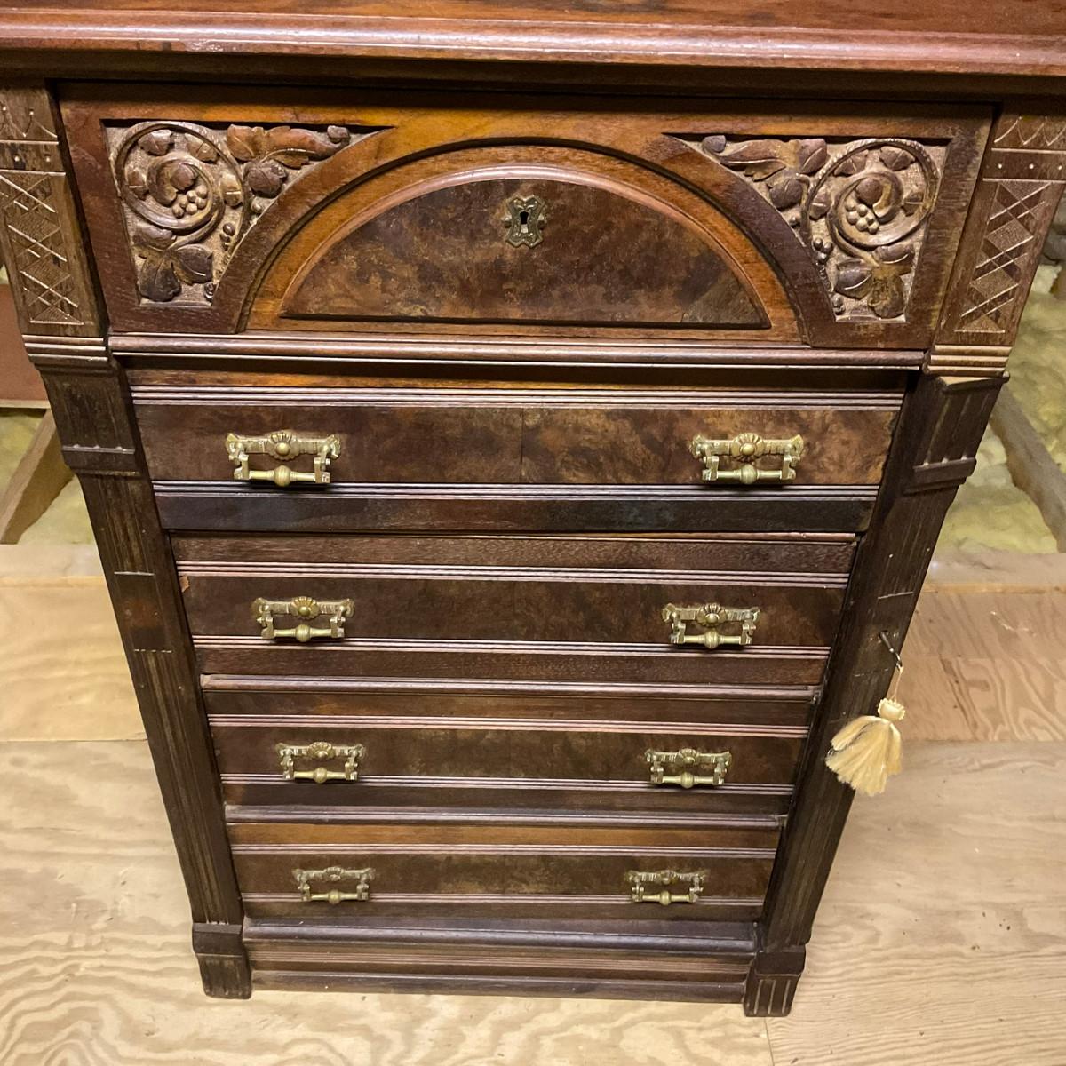 Burled drawer fronts, ornate carvings, original brass hardware, lock does work with key