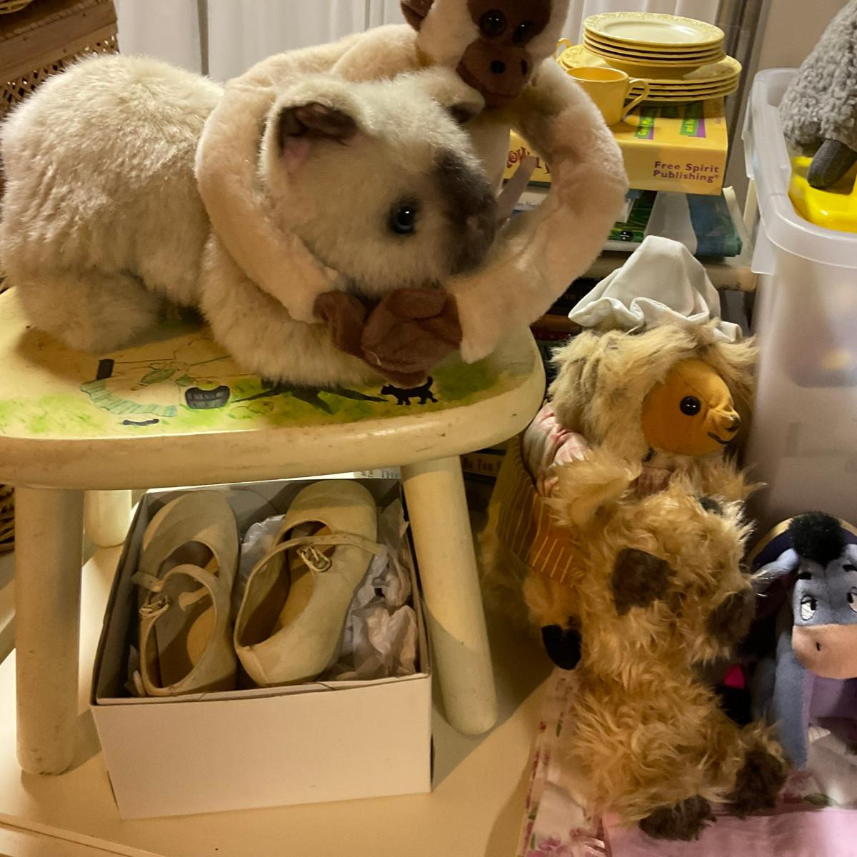 Stuffed animals, kid books, legos, stool, blanket, baby clothes, plastic tea cup and plates, blocks