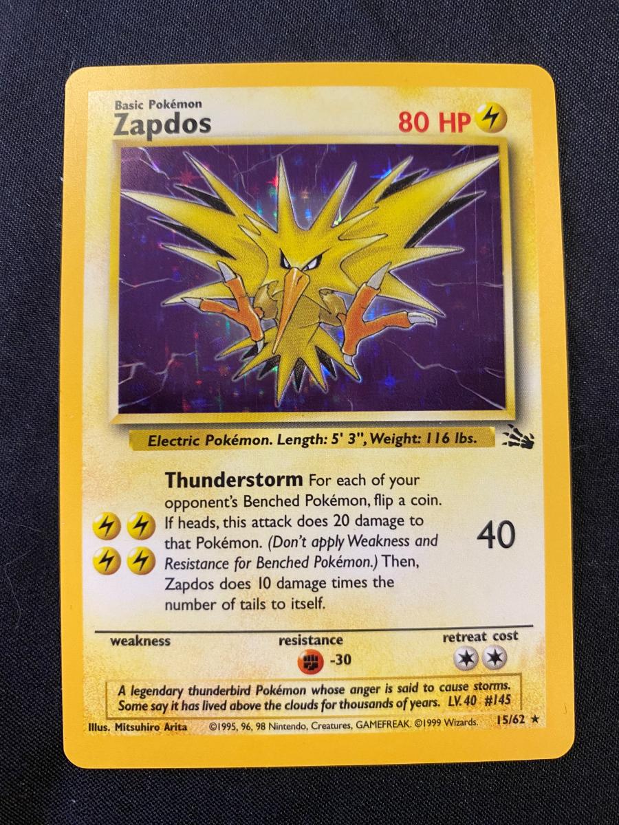 This is a Zapdos holographic card from the Pokemon TCG Base Set. The card number is 16/102, produced by Wizards of the Coast in 1999. This card features the classic holographic background and is labeled as a Basic Pokemon with 80 HP. Known condition: light play. Great for collectors or players looking to complete their Base Set.
