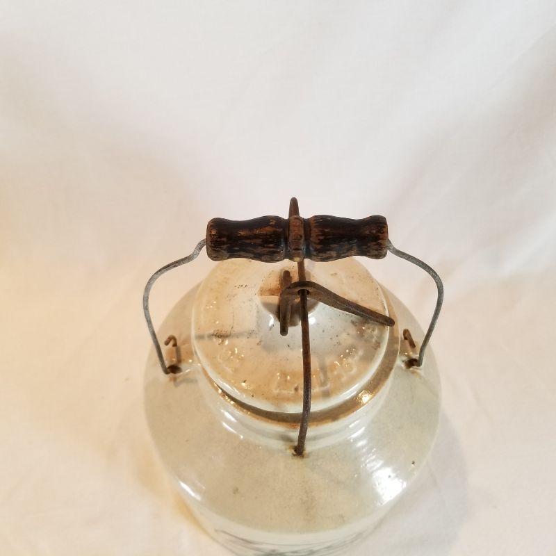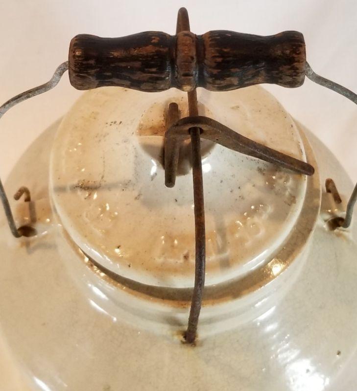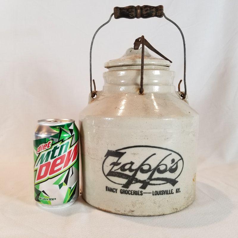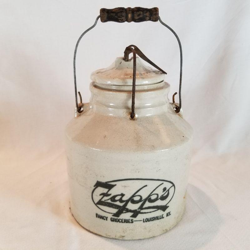 Excellent example of a vintage grocery store crock. This “Zapp’s” Fancy Groceries ““ Louisville, KY Crock with lid from the old Zapp’s grocery store locate at 234 W. Market in Louisville, KY. It boasts a nice wooden wire handle with hinged wire crockery lid. A real Louisville Historic Item.