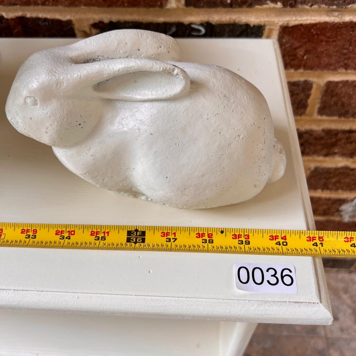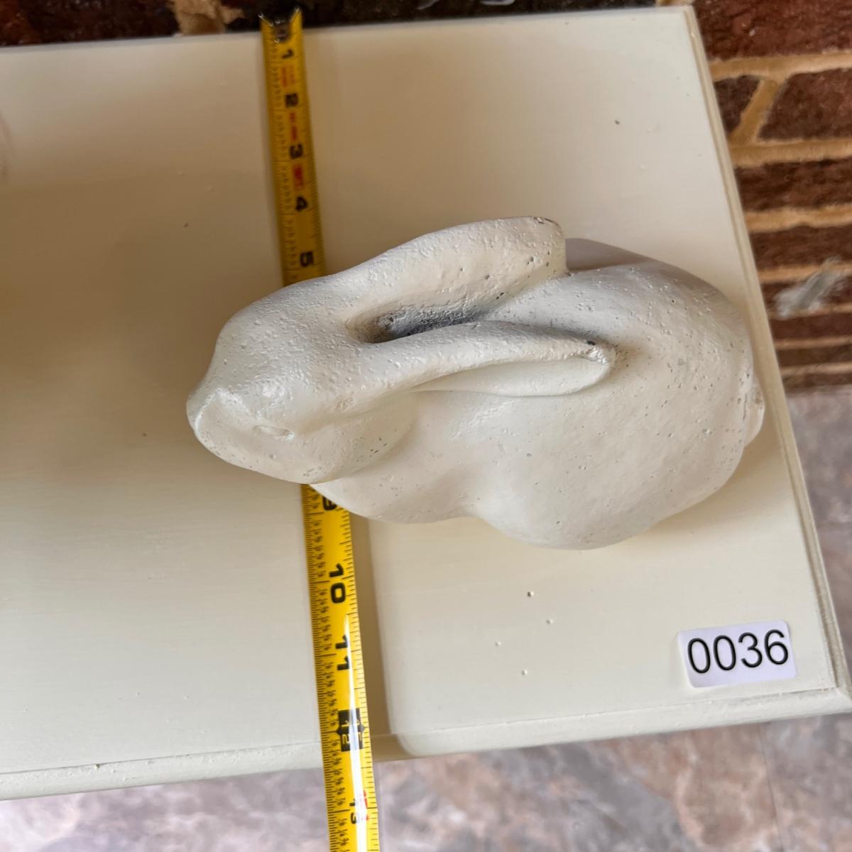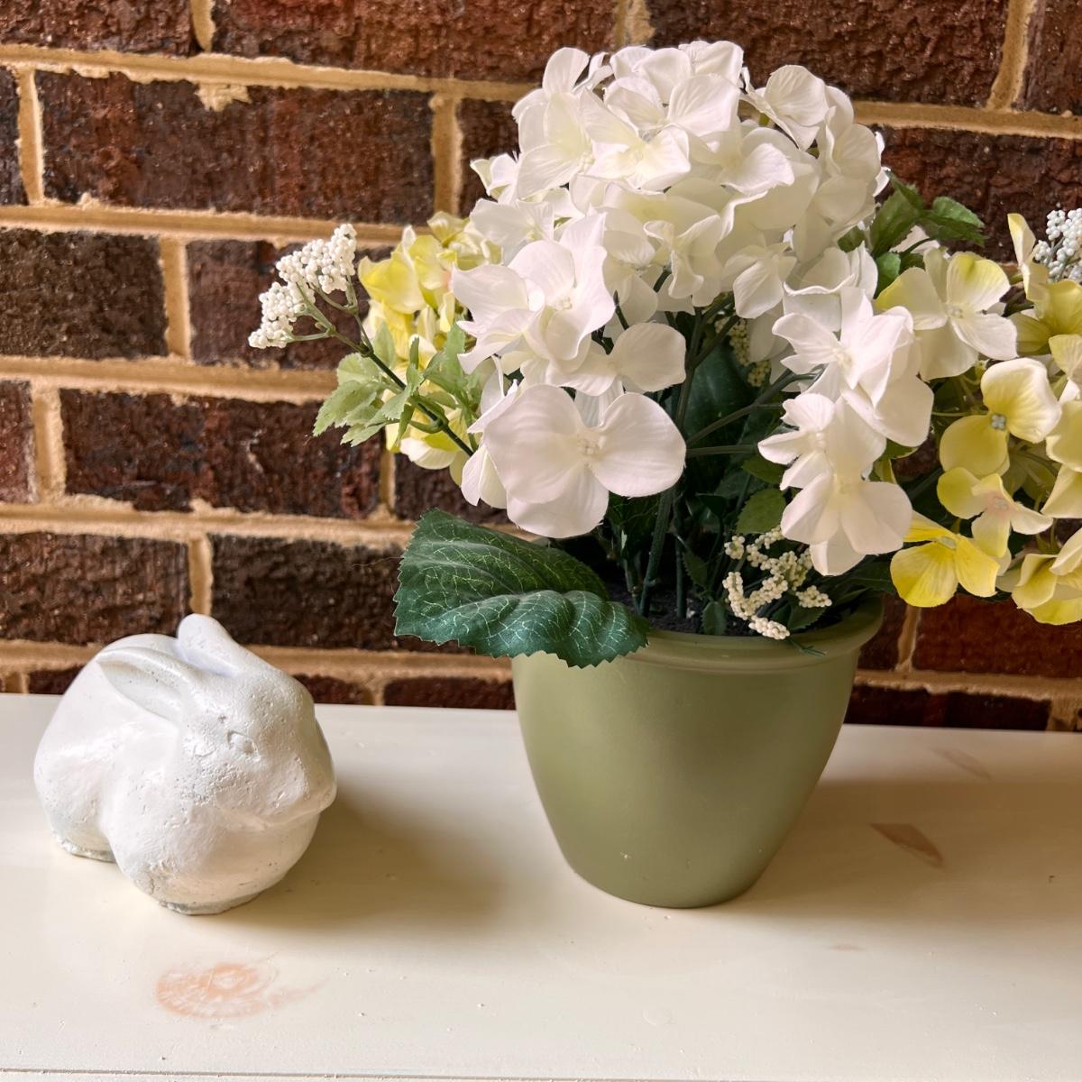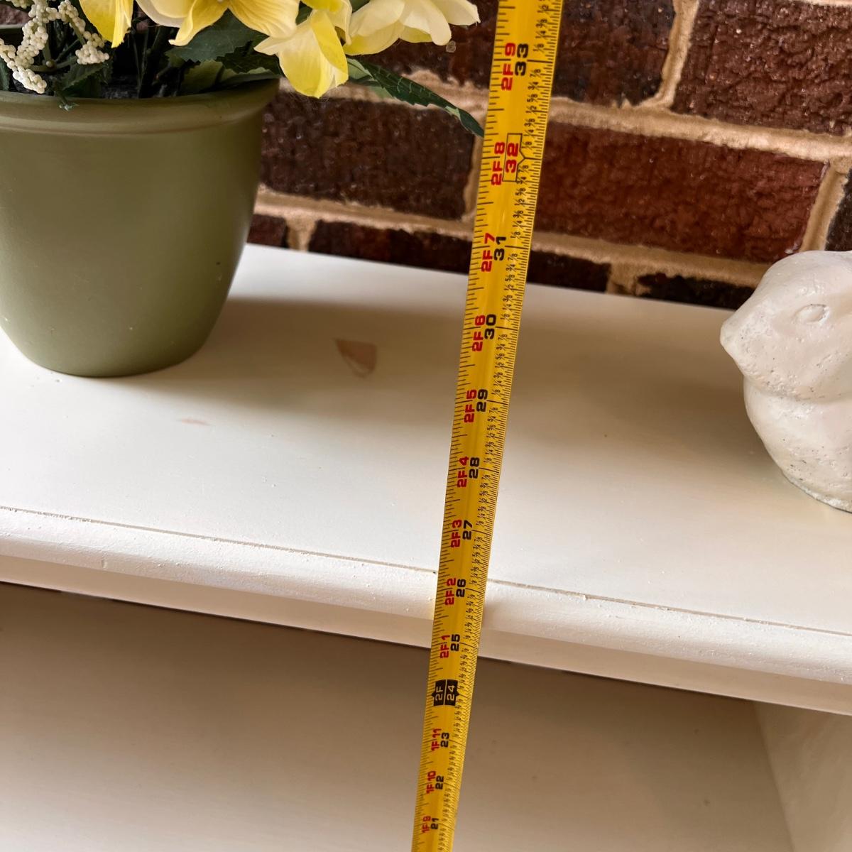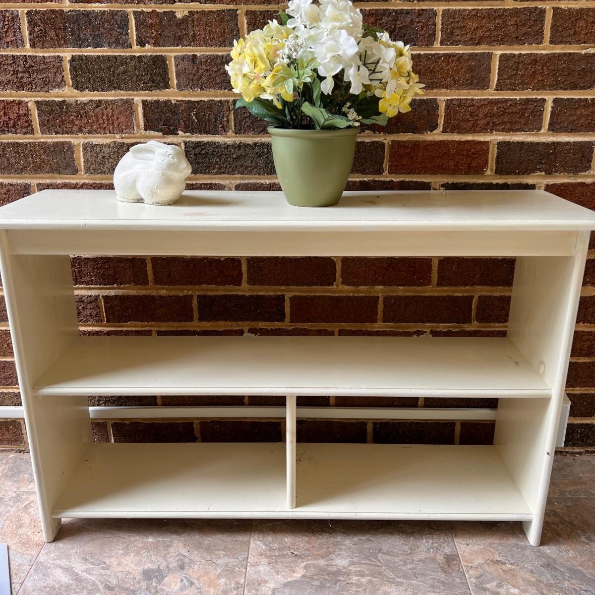 Wooden shelf painted white. Comes with ceramic rabbit and silk flower pot. In good overall condition. Some of the wood knots show through the white paint as shown in picture 2.