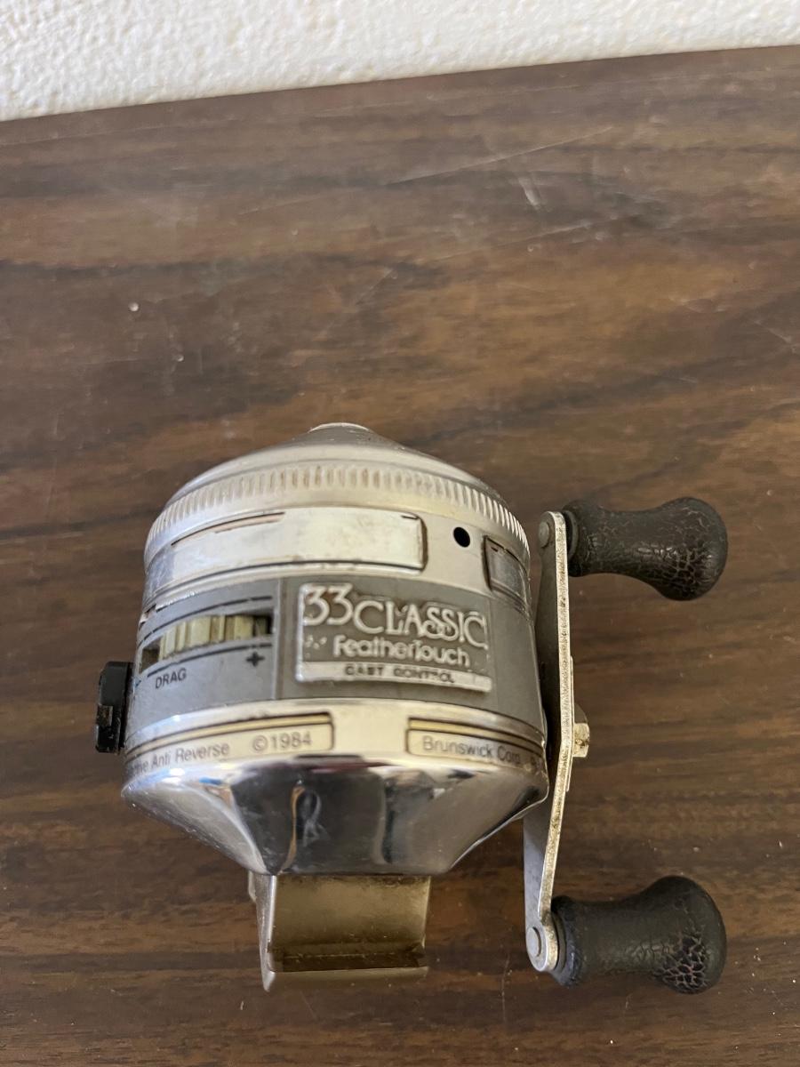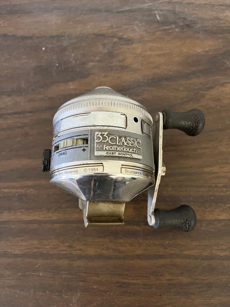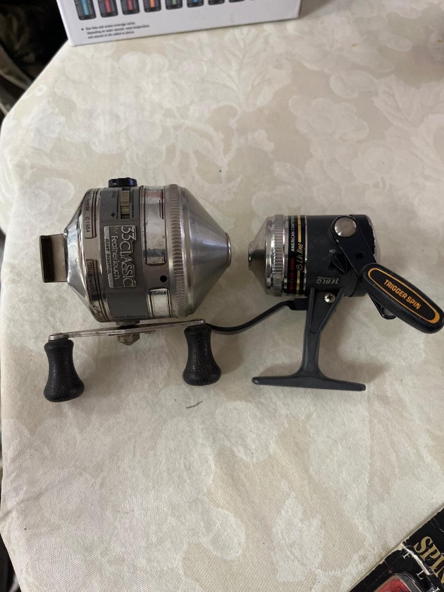 Lot includes a Zebco 33 classic fishing reel and a Zebco Feather Touch fishing reel and a spinner.