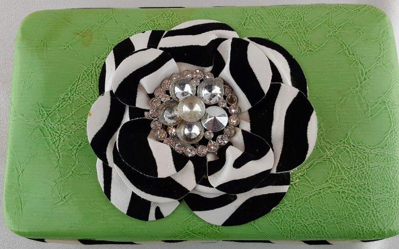 Lime colored clutch measuring 7.5in. by 4.5in. and 1.75in. deep. One rhinestone was upside down.