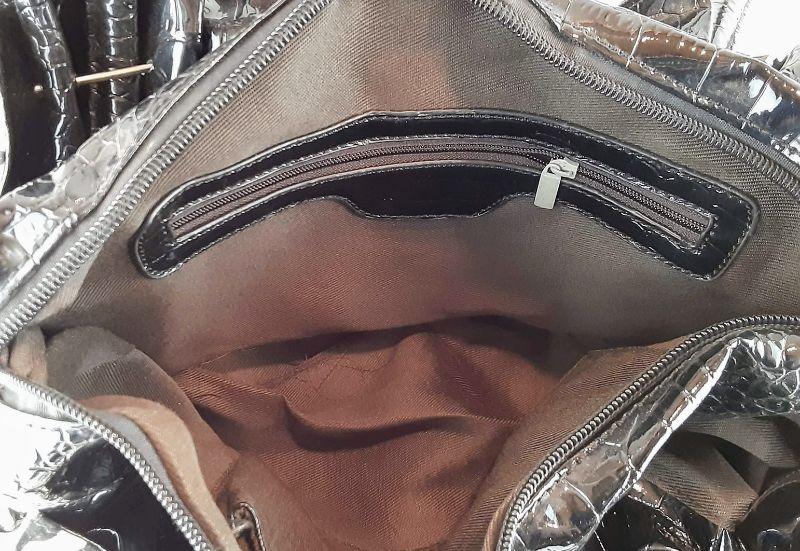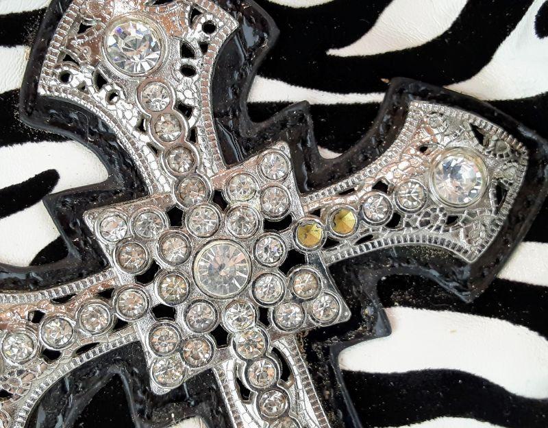 Fun purse with lots of pockets and storage. Measures 16in across and 17.5in tall including handles. There are two missing rhinestones on the cross.