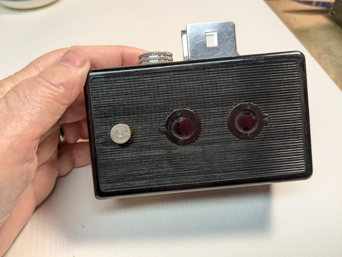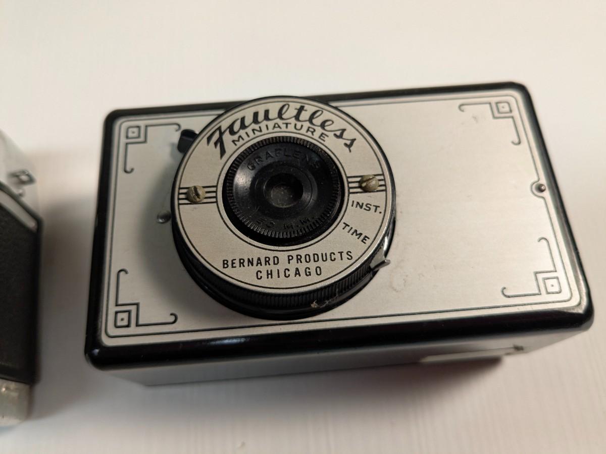 The Faultless Miniature camera was manufactured by the Bernard Products Company of Chicago Illinois. The camera was introduced in 1947. It was constructed of polished molded black plastic with an etched metal front plate. It has a folding direct eye level viewfinder and a fixed focus 50mm Graf lens. It uses 127 film.