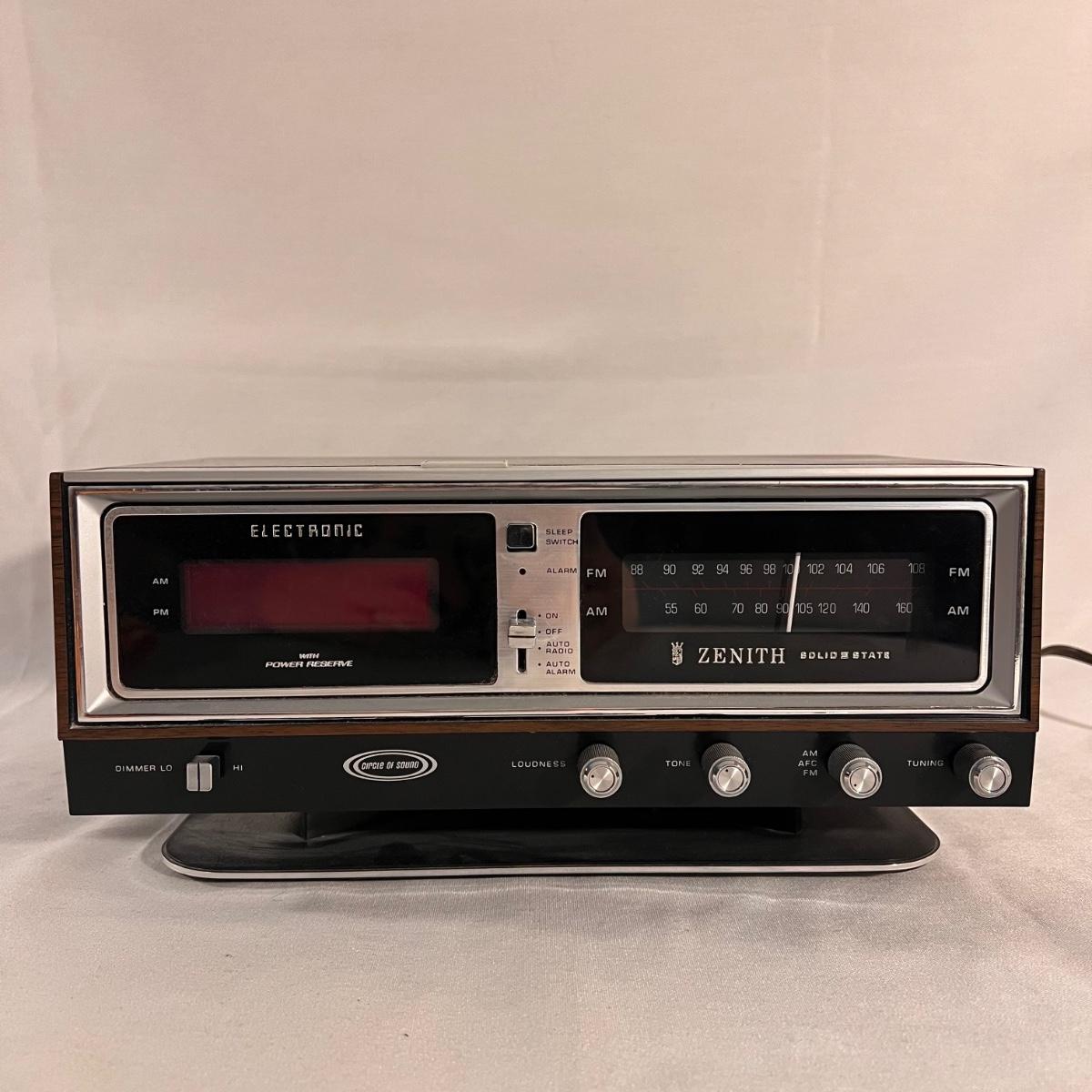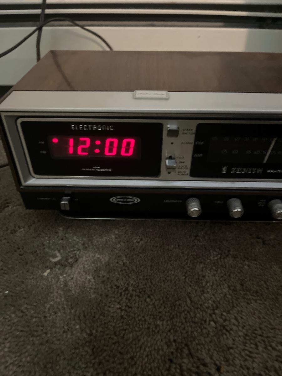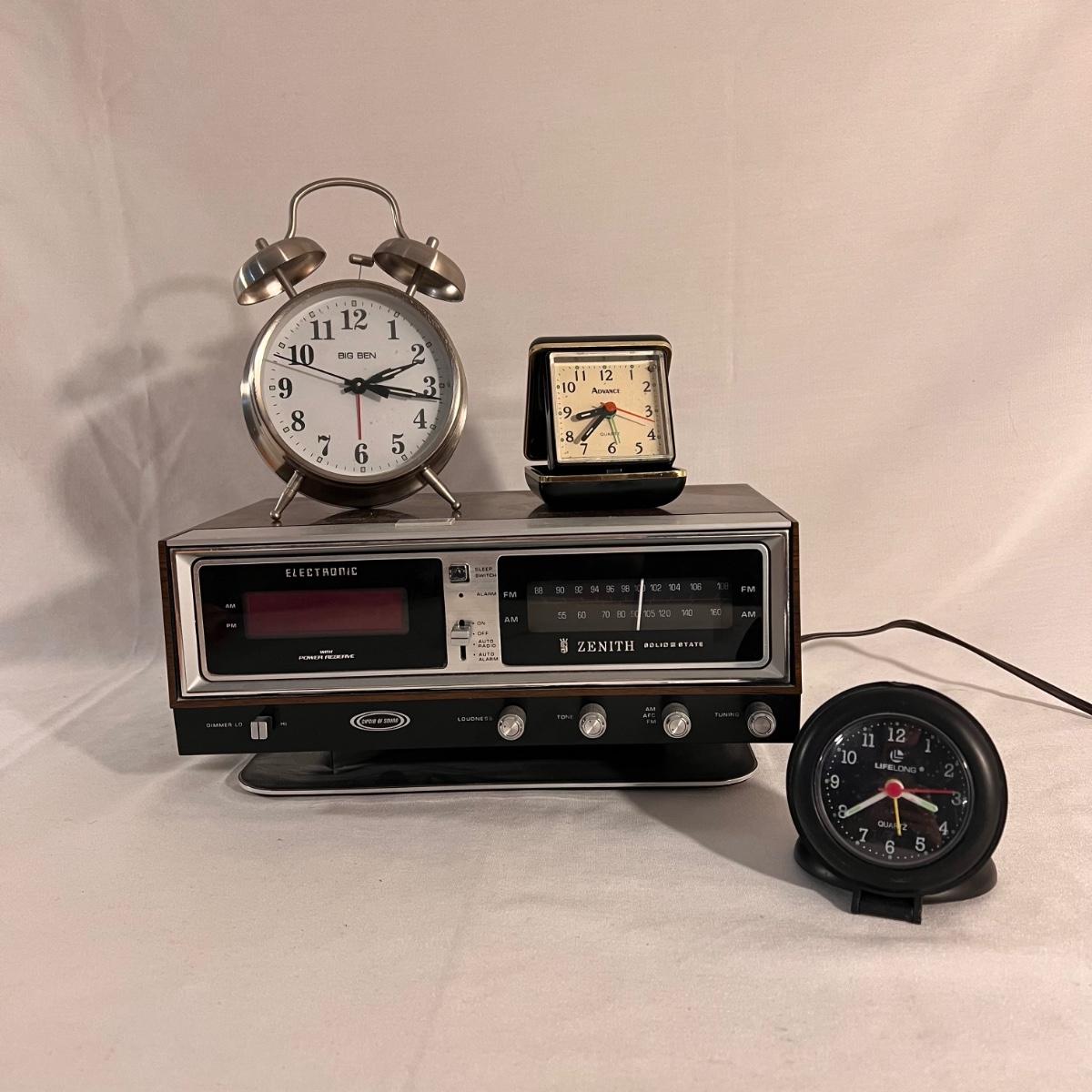 Lot includes one Zenith Solid State radio, one Advance compact clock, one Lifelong compact clock, and one Big Ben clock. Electric clock powered on when plugged in and the rest were not tested. The Zenith clock measures 11” x 6.5” x 5.5”H. Shipping available.