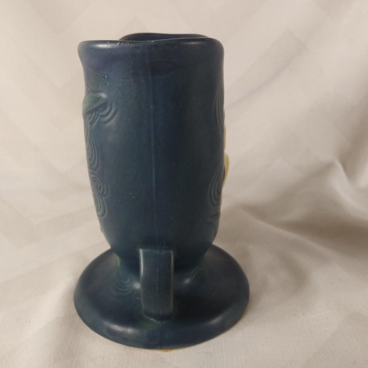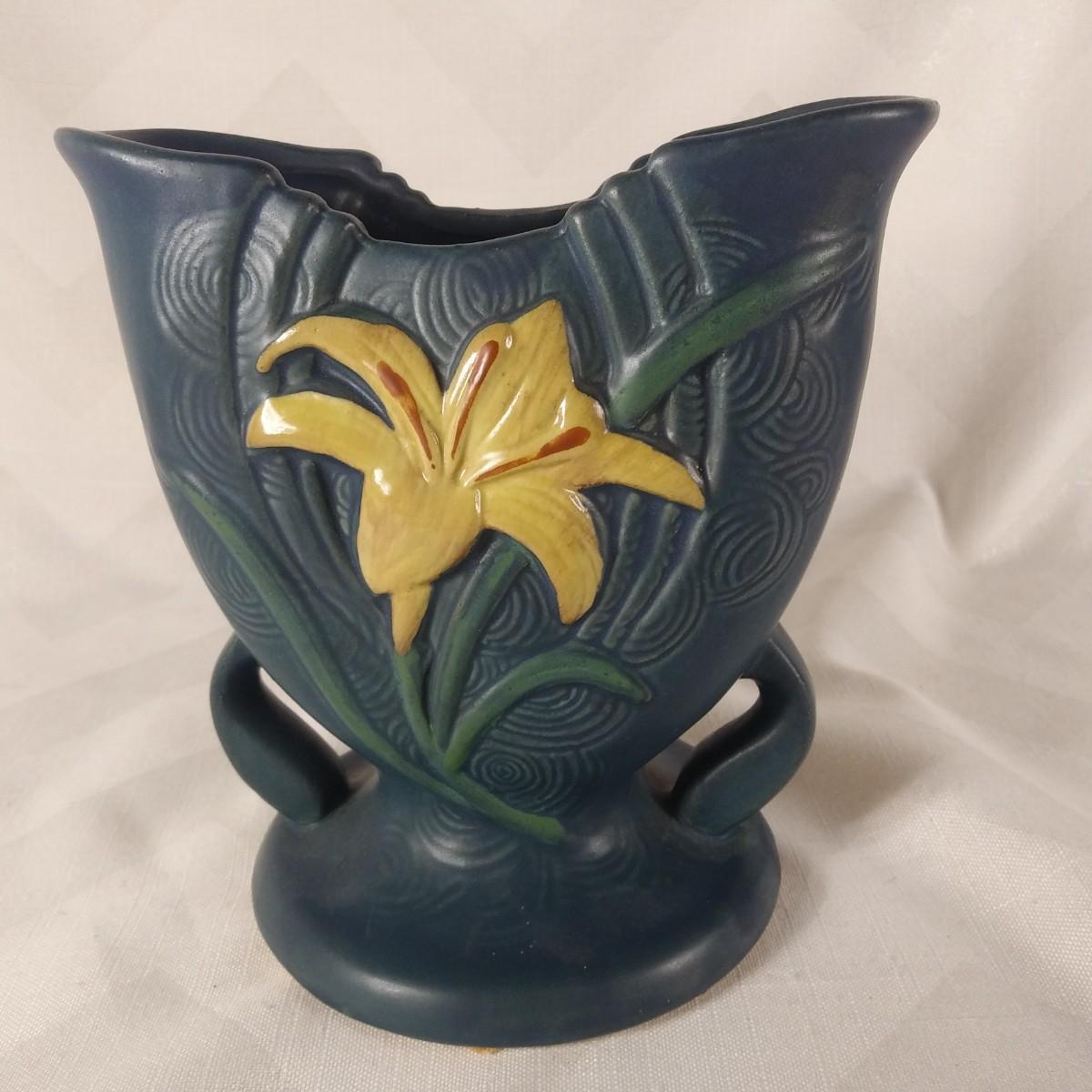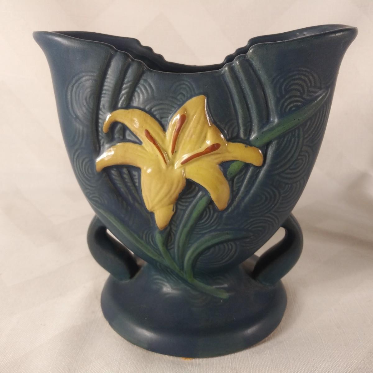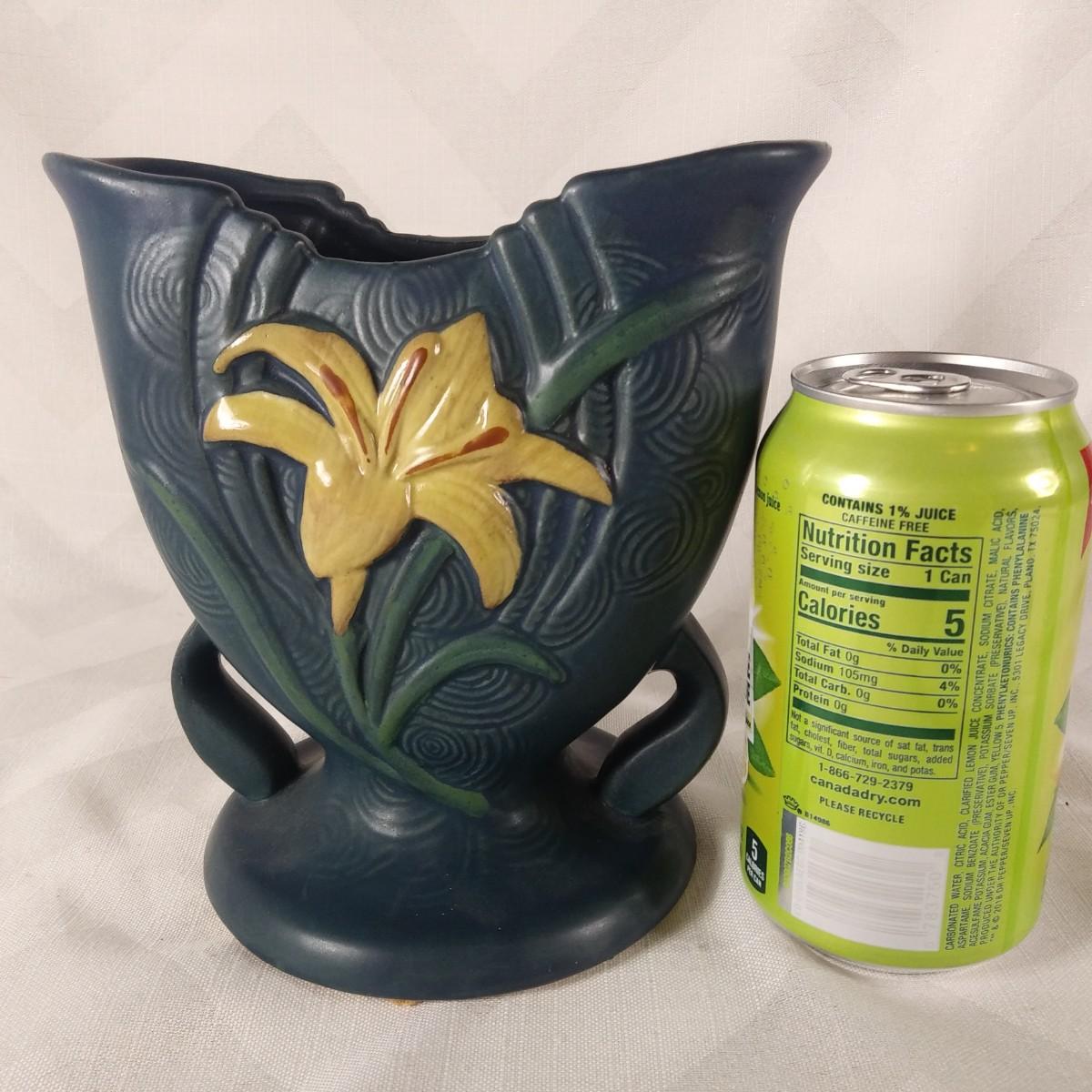 This auction lot is for a Roseville Zephyr Lilly Fan Vase. The vase is marked in raised lettering Roseville 205-6" on bottom. In very good condition - not chips or cracks. See photo with can for sizing. We had someone tell us it was a reproduction and another said it was authentic - no guarantees - you be the judge.