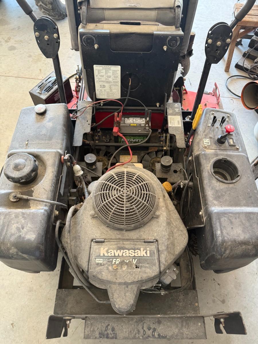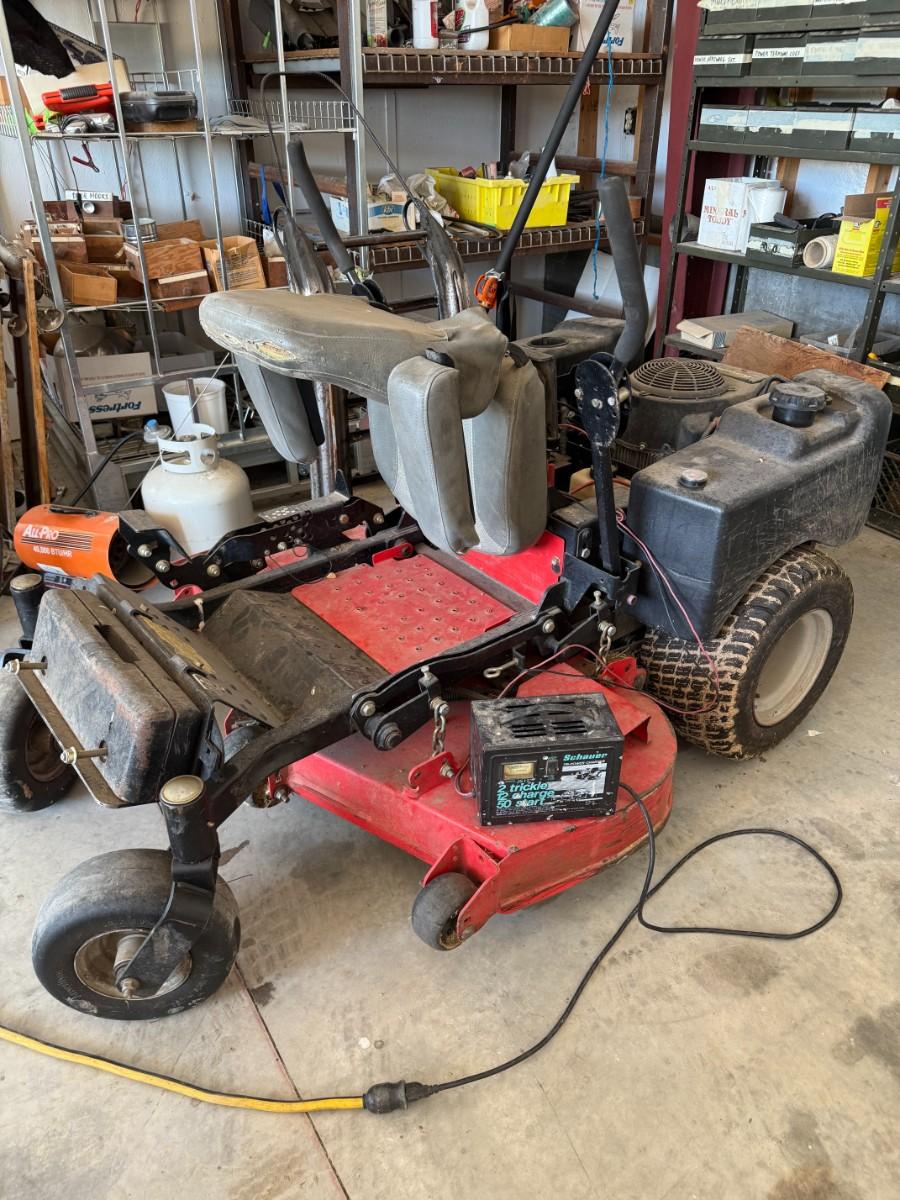 Heavy-duty zero-turn mower. Some wear on the seat. Includes charger unit.
