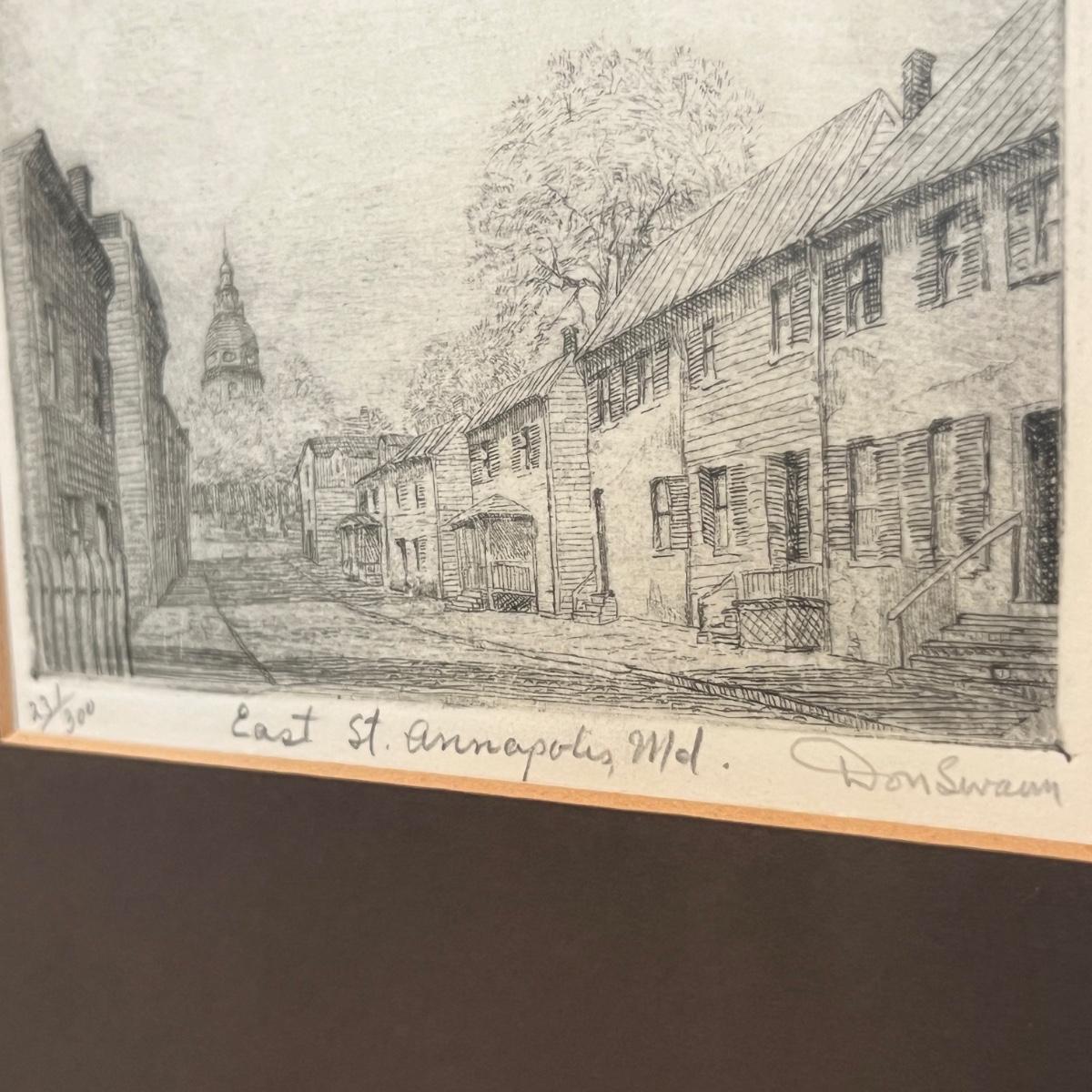 Limited edition numbered and signed, professionaly framed and matted etching by Don Swann (1889-1954) of East Street in Annapolis Maryland.