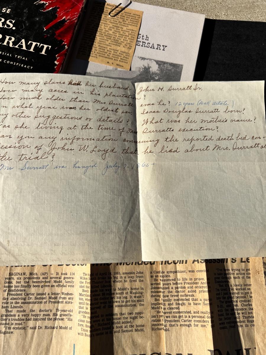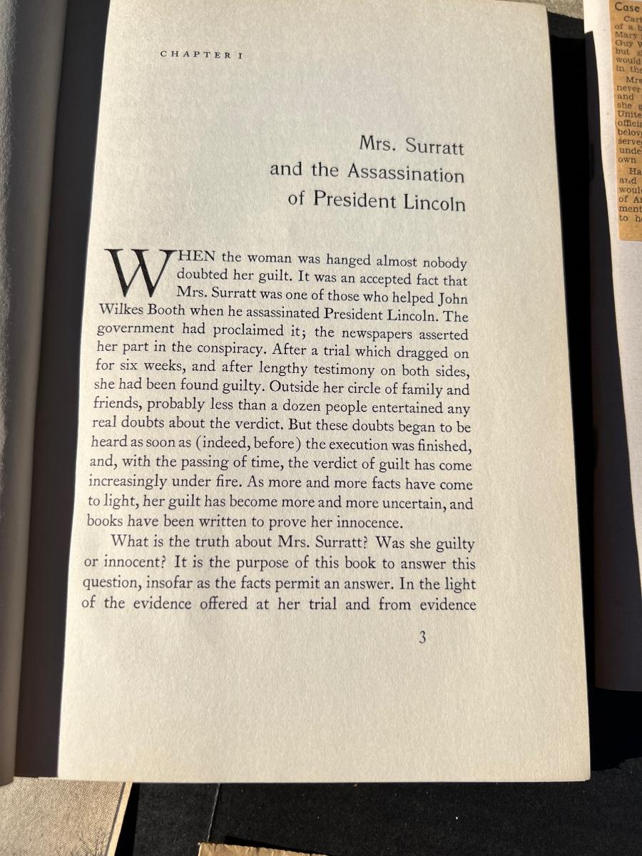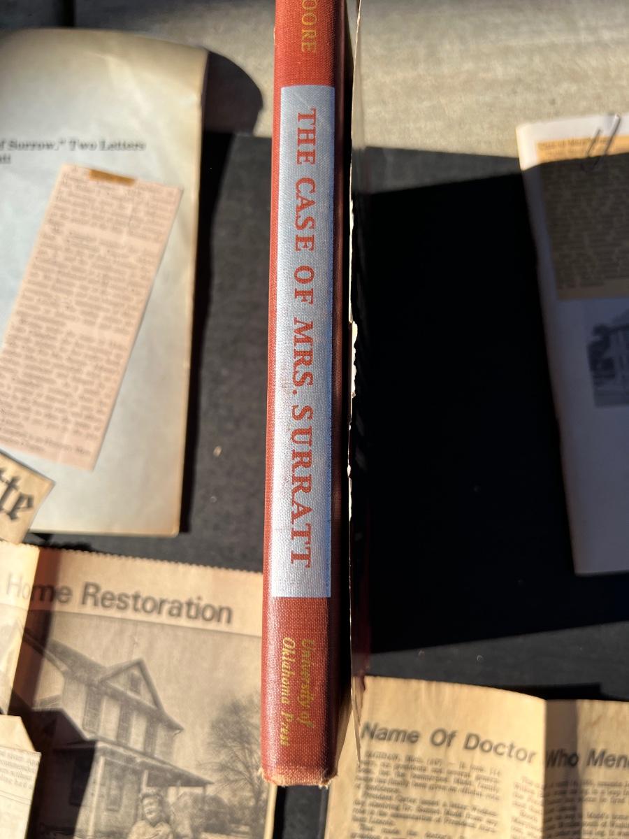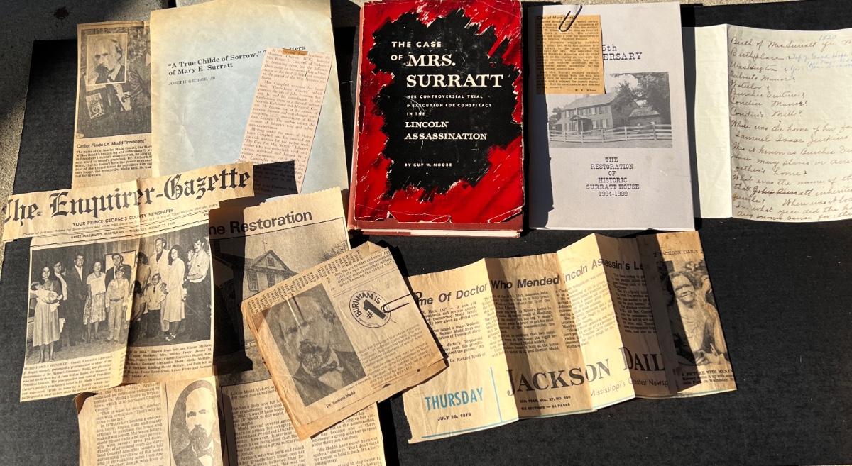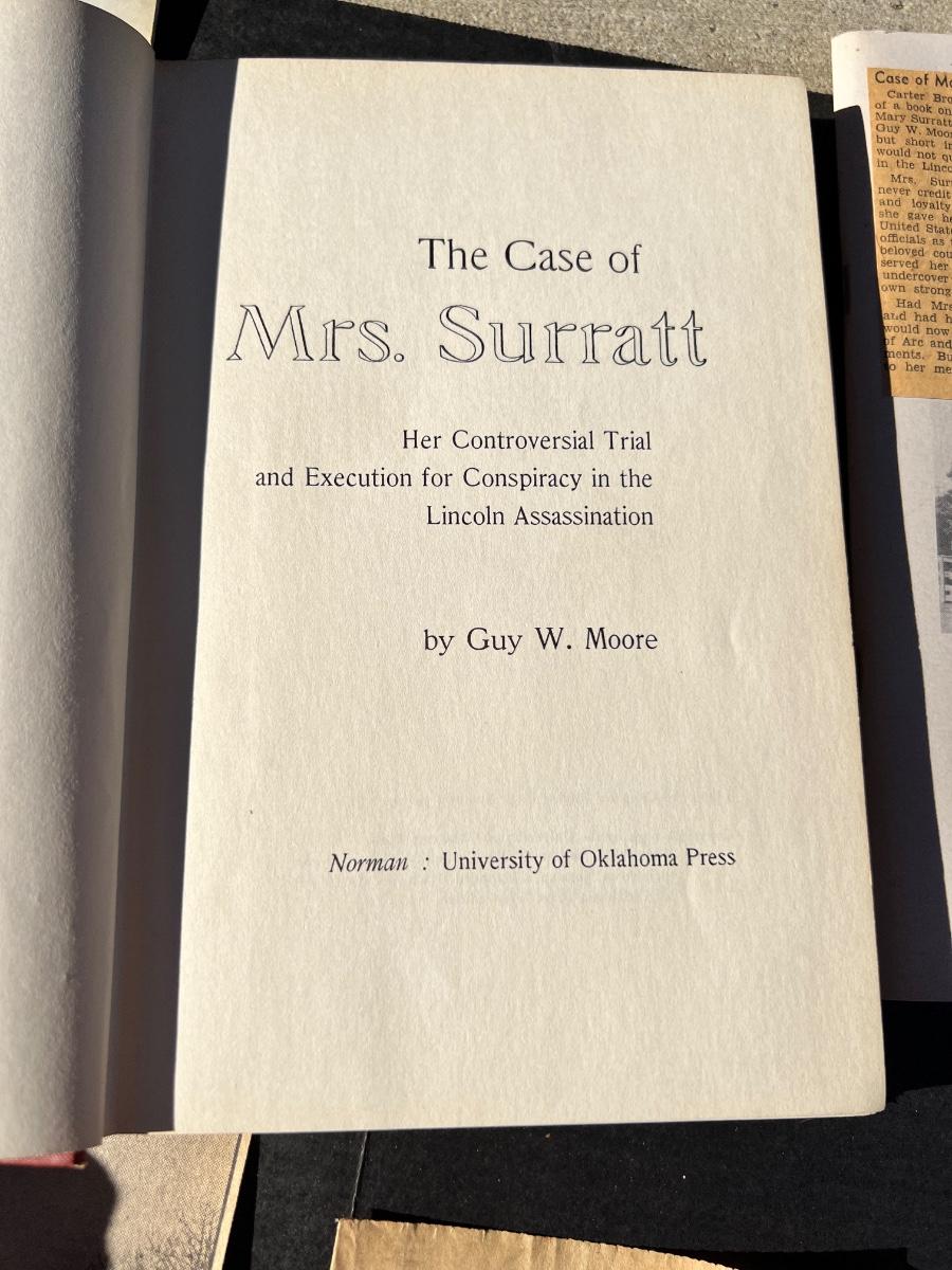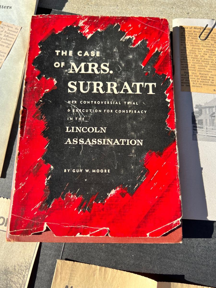 The Case of Mrs. Surratt: Her Controversial Trial and Execution for Conspiracy in the Lincoln Assassination hardcover book, soft cover THE RESTORATION OF HISTORIC SURRATT HOUSE 1964-1989, A True Childe of Sorrow" Two Letters of Mary E. Surratt. Newpaper clippings, notes about Mary Surratt that look to be antique.