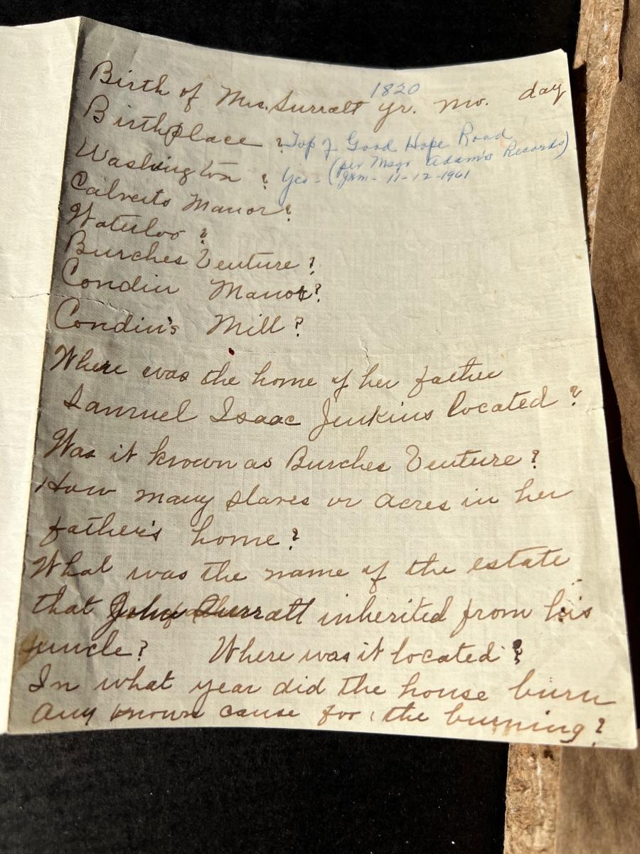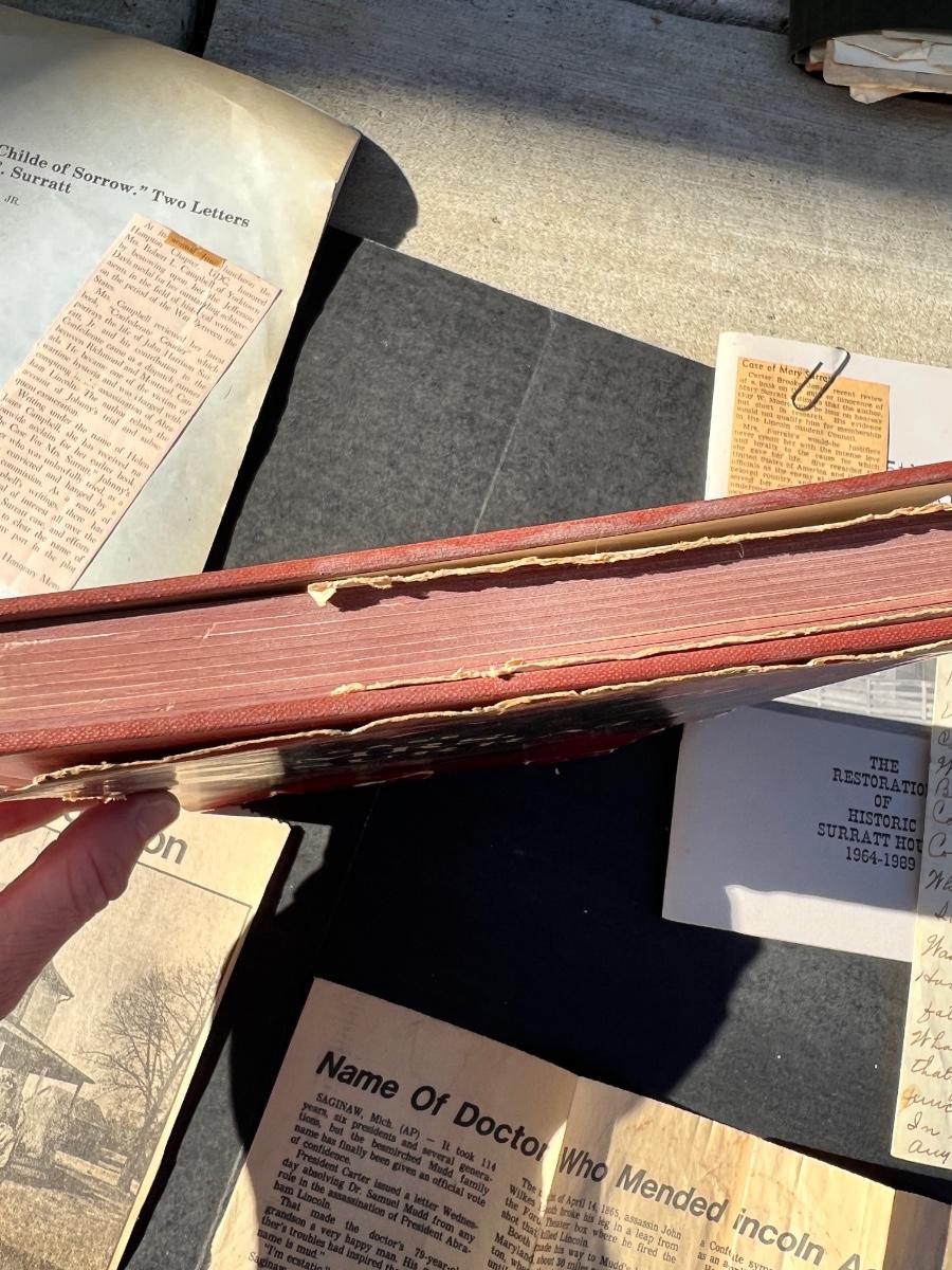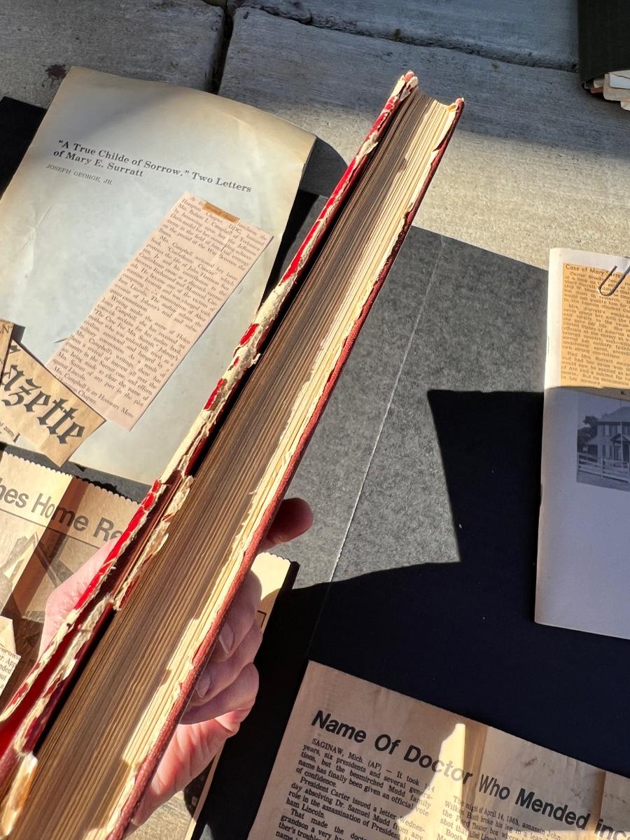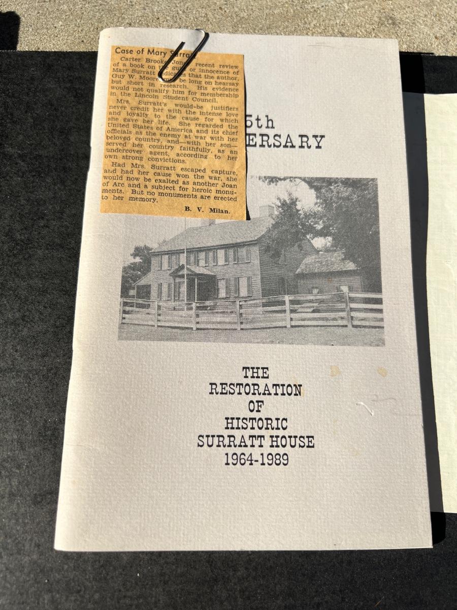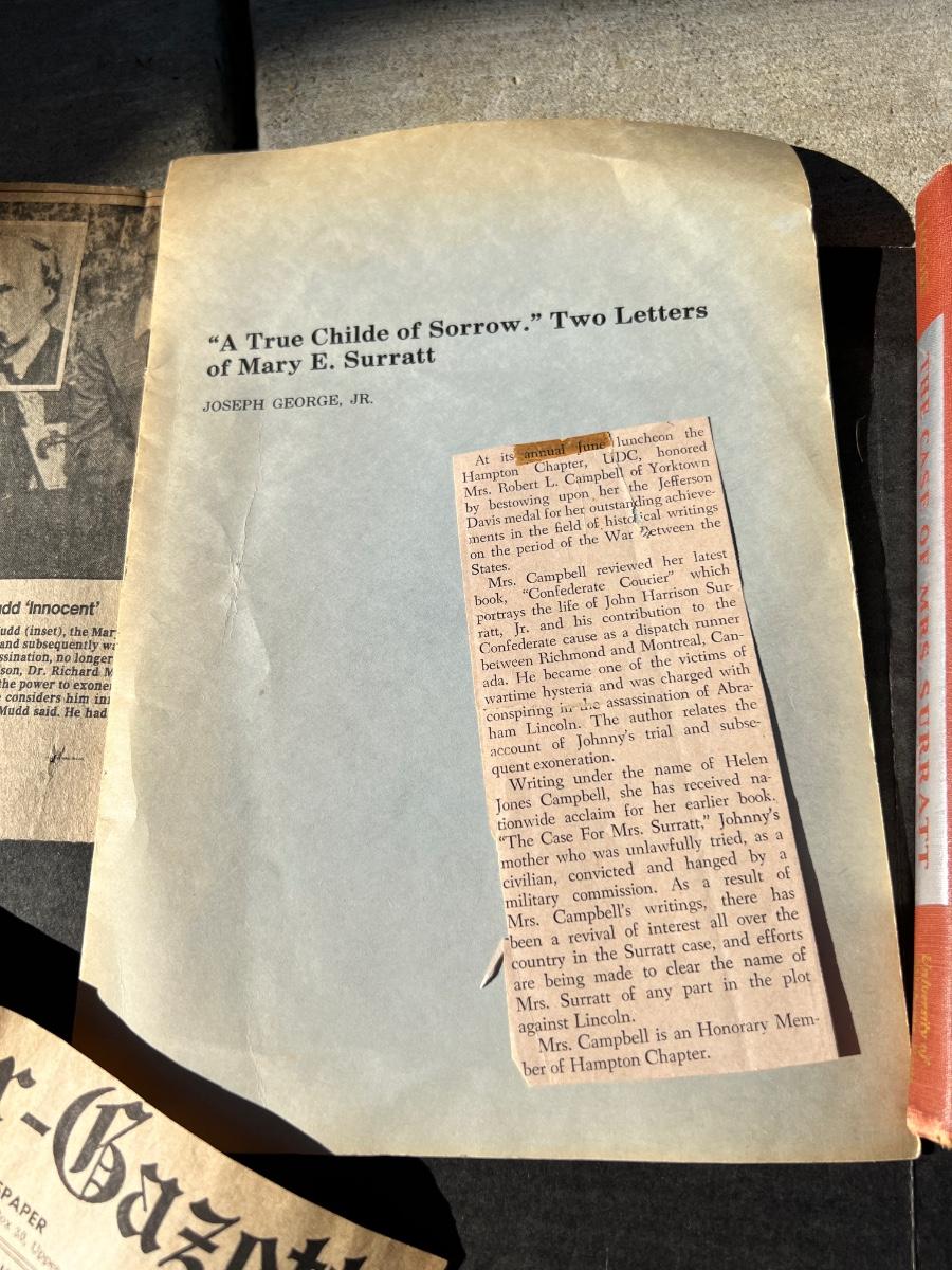 The Case of Mrs. Surratt: Her Controversial Trial and Execution for Conspiracy in the Lincoln Assassination hardcover book, soft cover THE RESTORATION OF HISTORIC SURRATT HOUSE 1964-1989, A True Childe of Sorrow" Two Letters of Mary E. Surratt. Newpaper clippings, notes about Mary Surratt that look to be antique.
