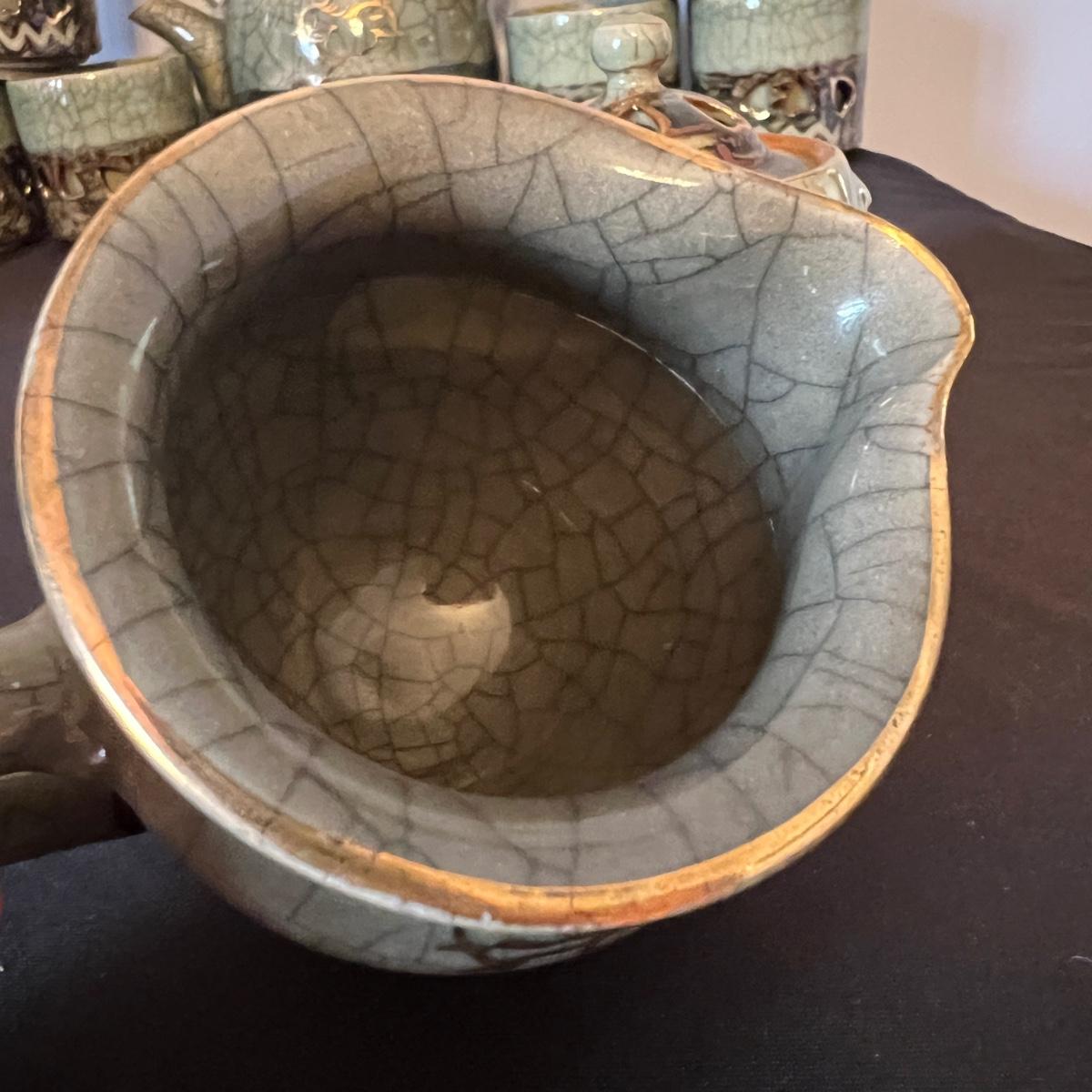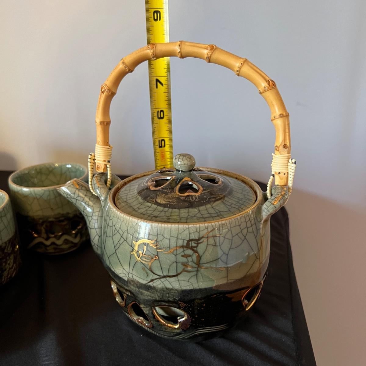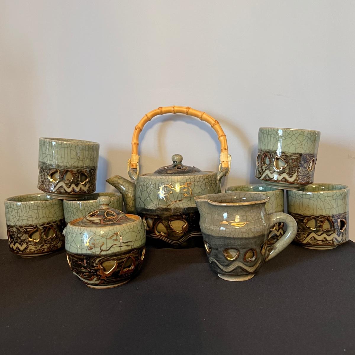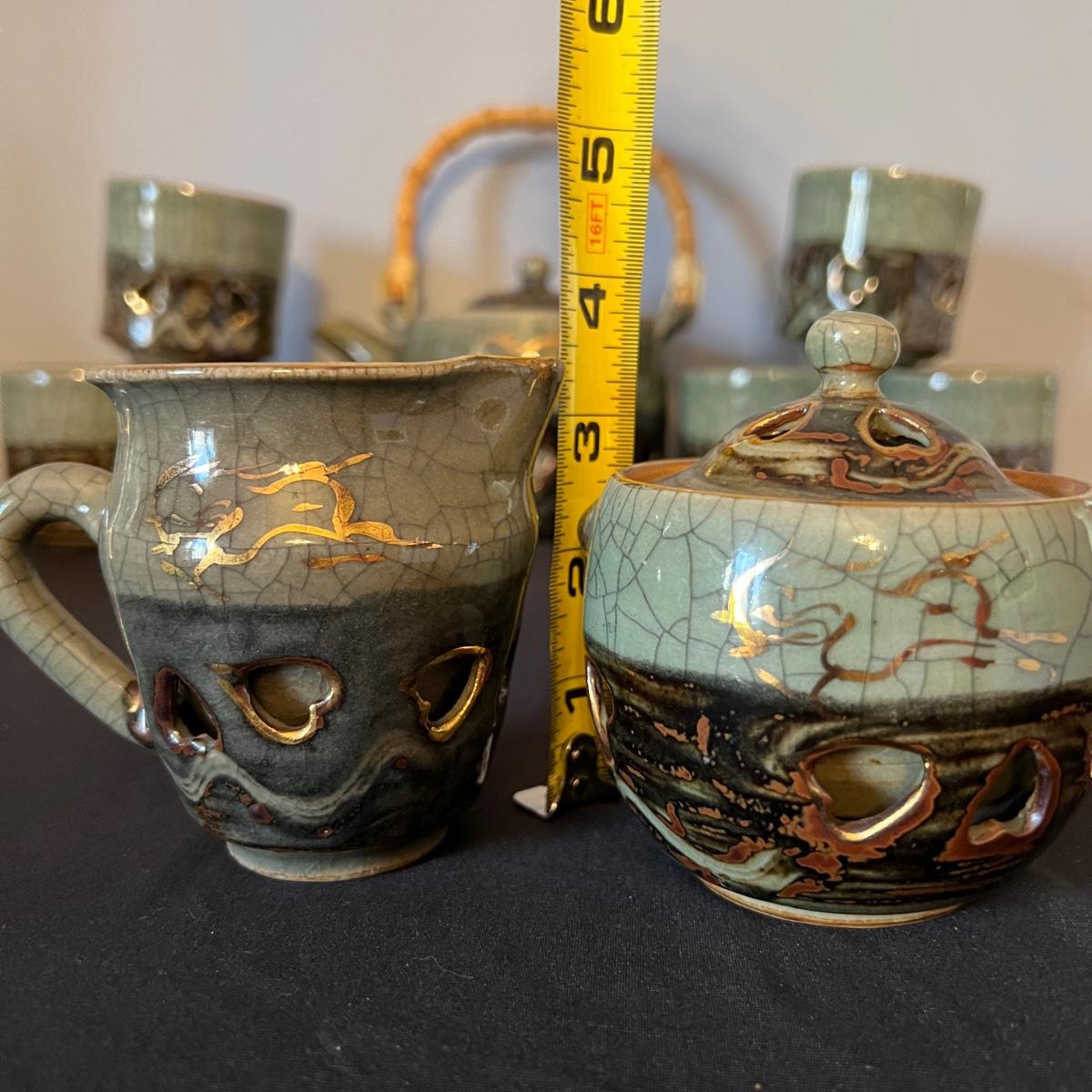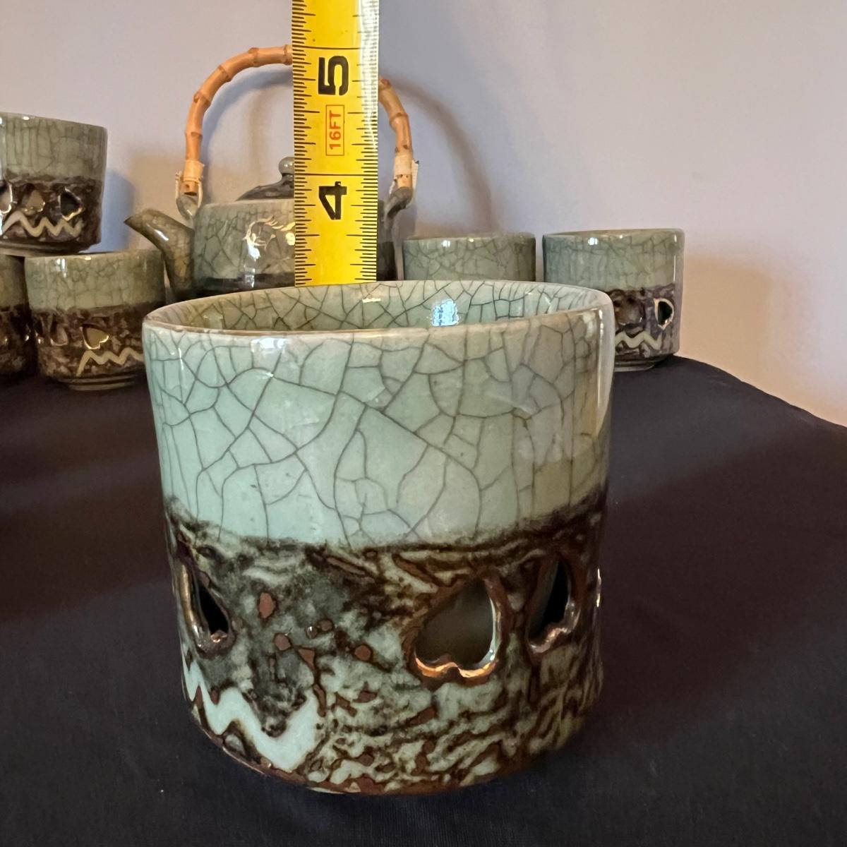 1960 Somayaki Soma Ware Green Crackle Ceramic Tea Set Vintage