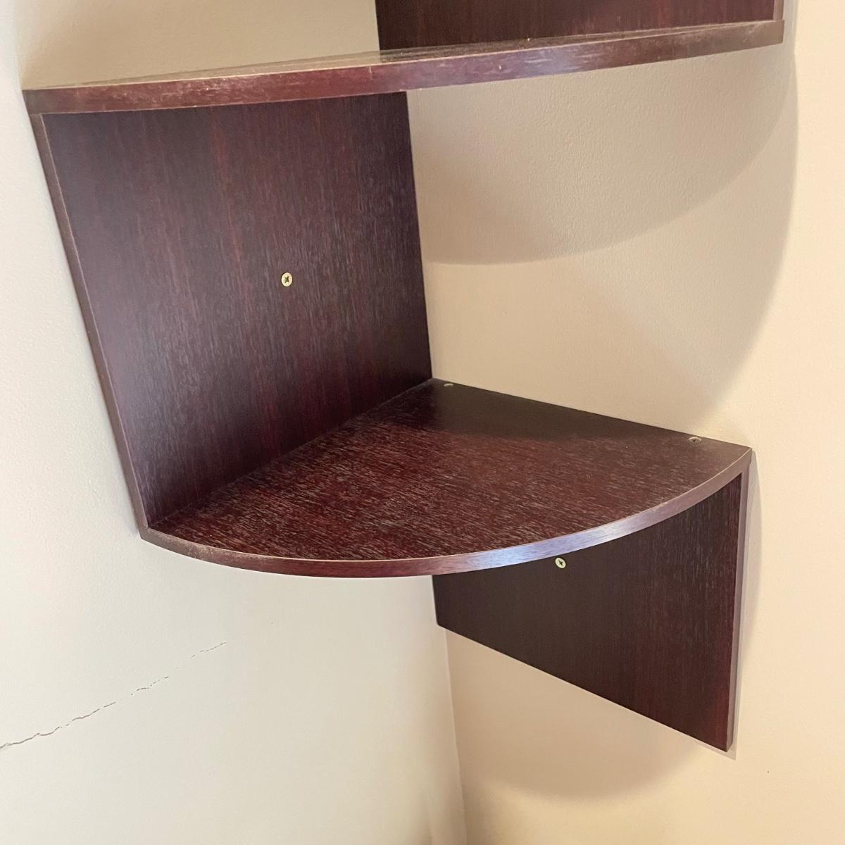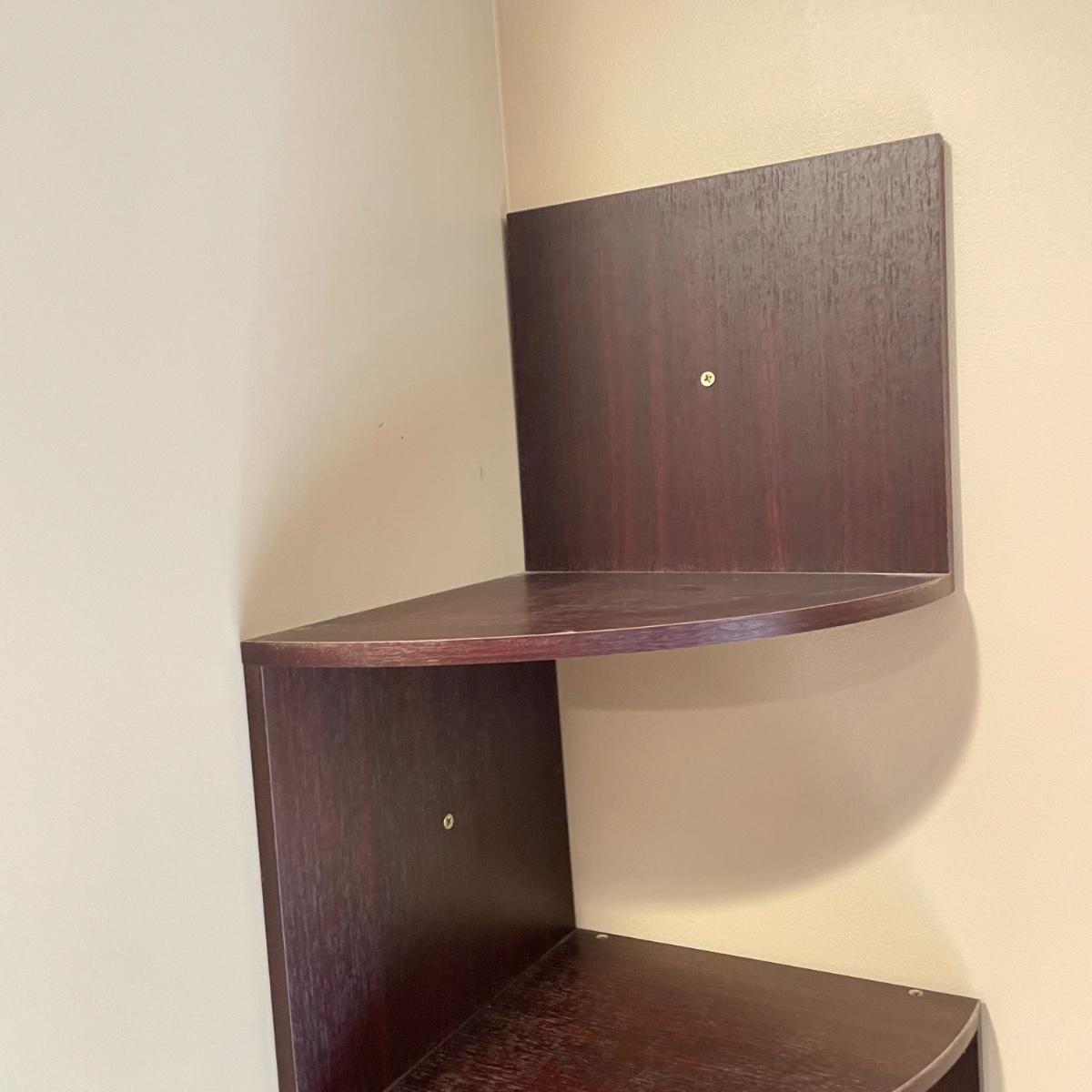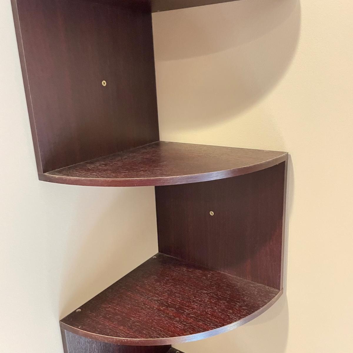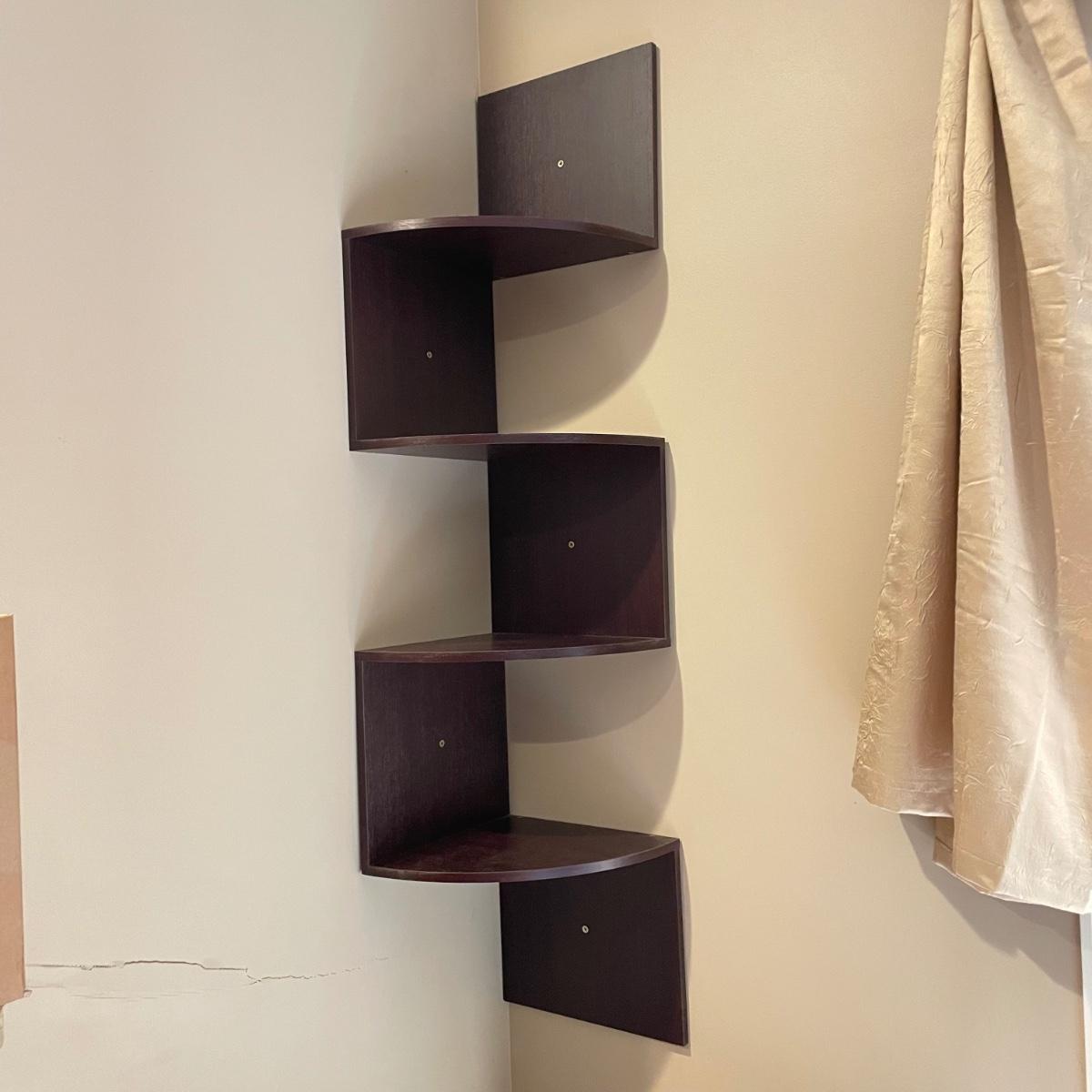 A walnut-colored stained corner shelf appears to be manufactured wood with alternating backs. This four-shelf unit measures 12” x 12” x 53”H and is currently mounted with five screws. Buyer will need a Phillips head screwdriver to remove from wall. See images. Local pick up only.