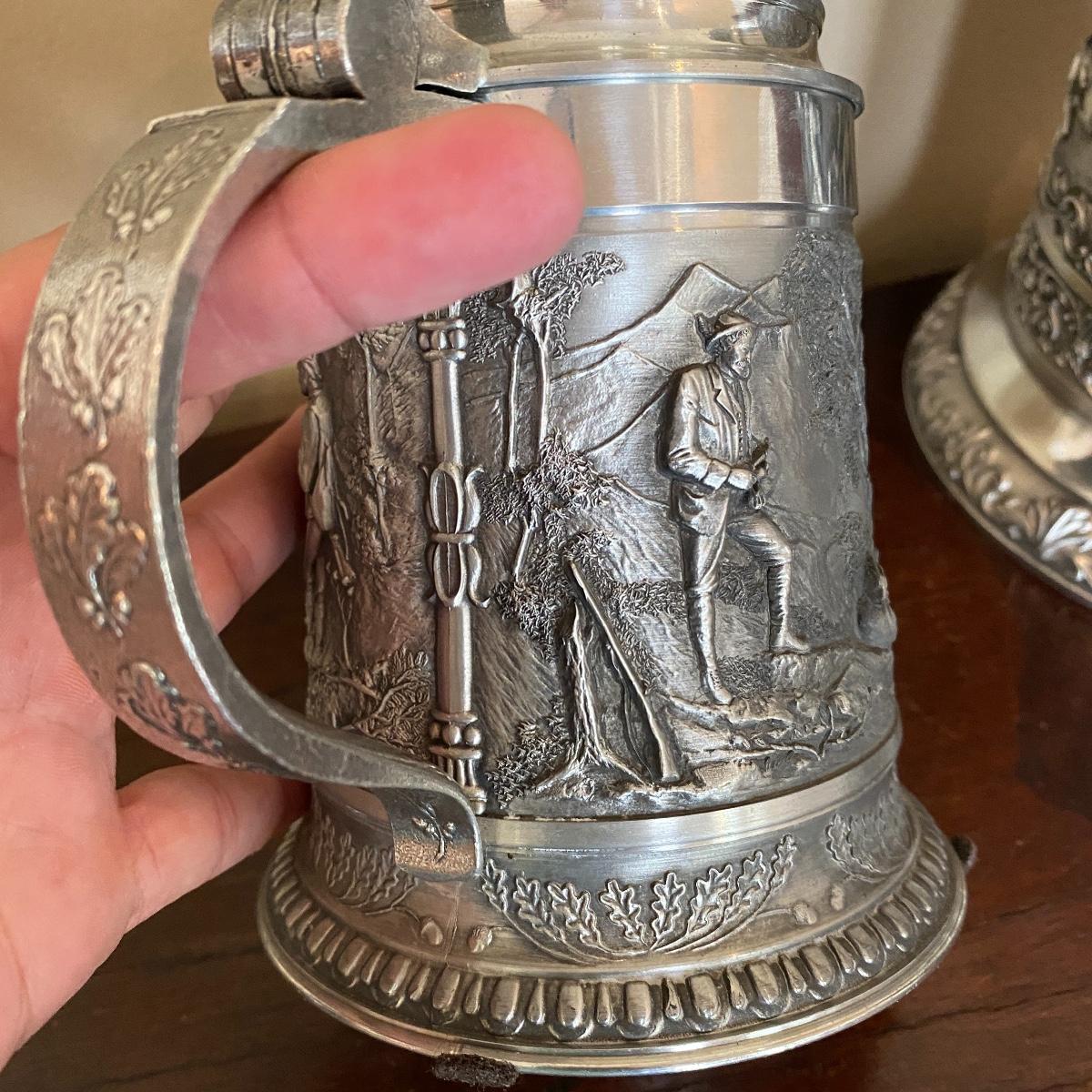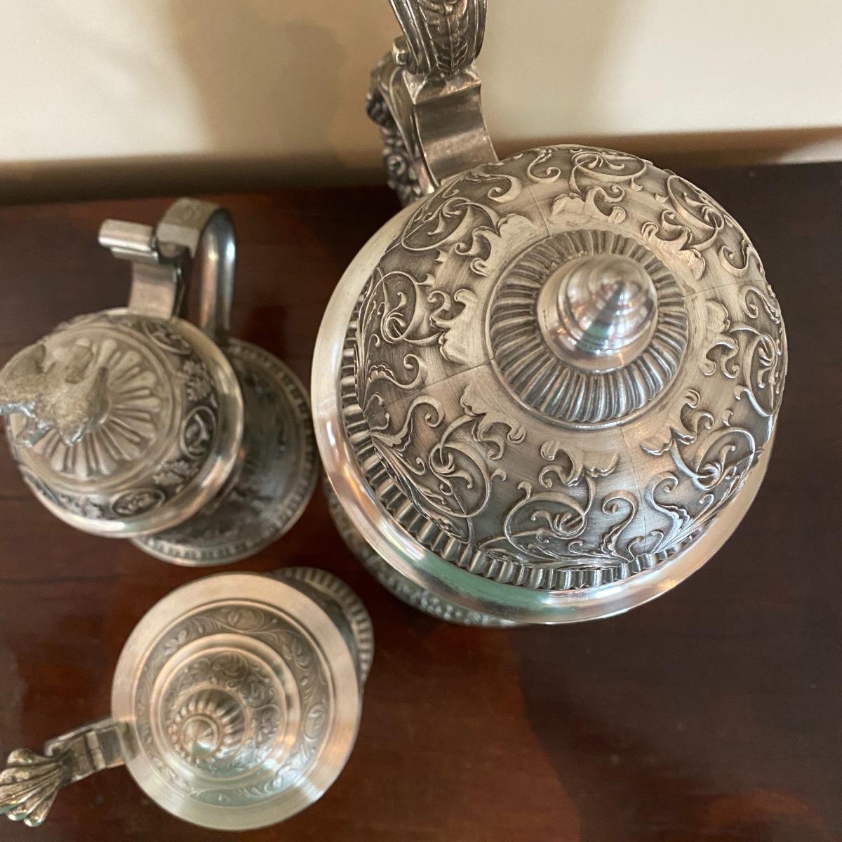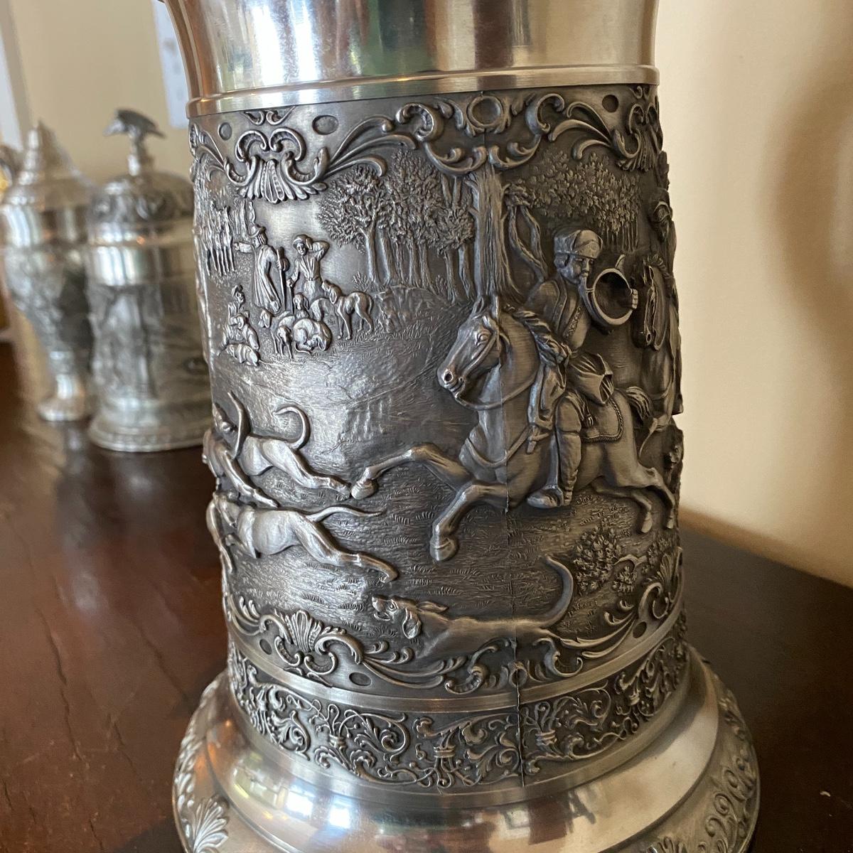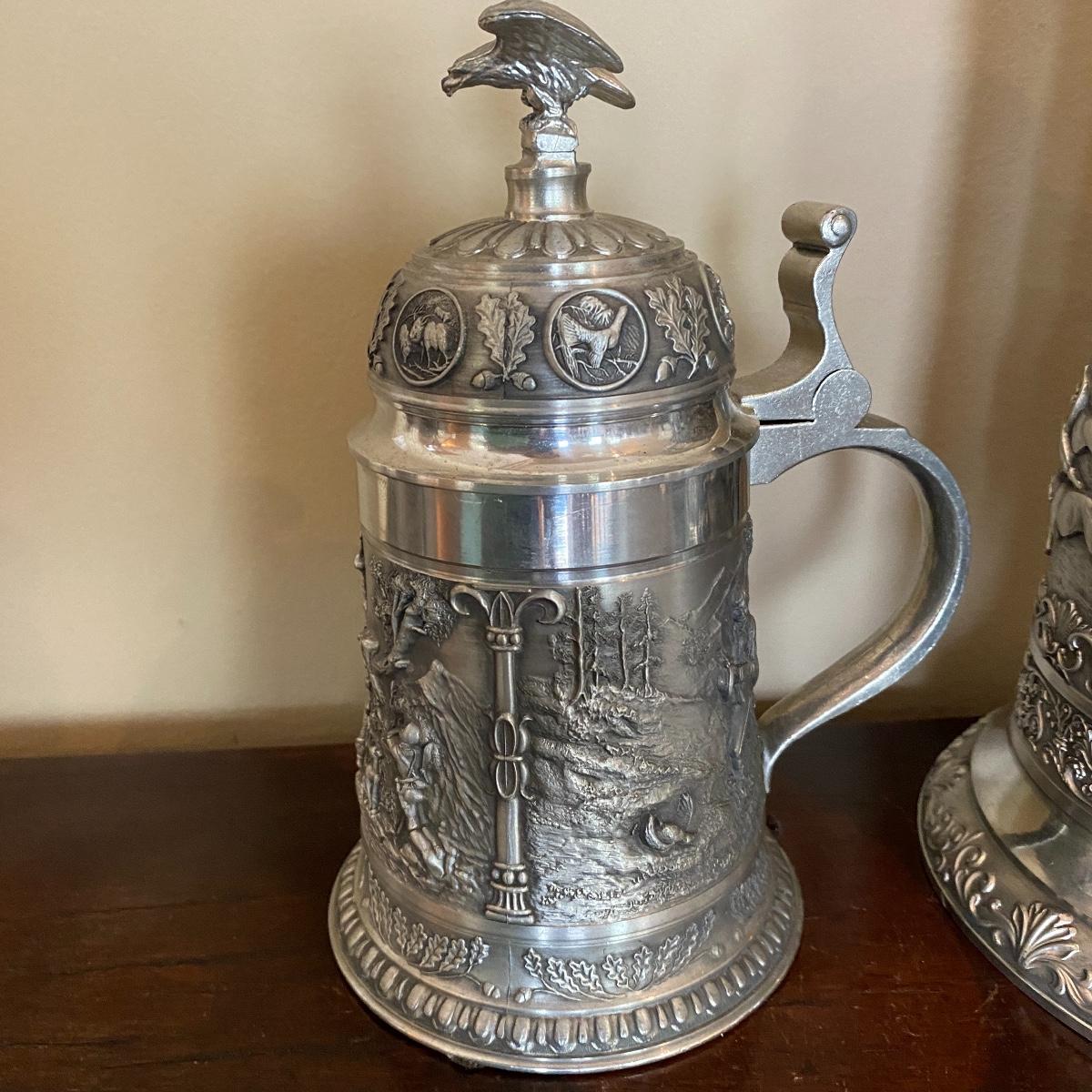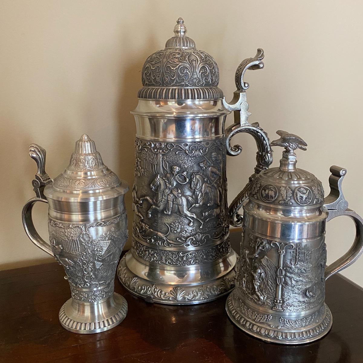 Three pewter steins. All are stamped 95% zinn pewter. Tallest measures 12” tall and 8”wide at handle. Shipping available