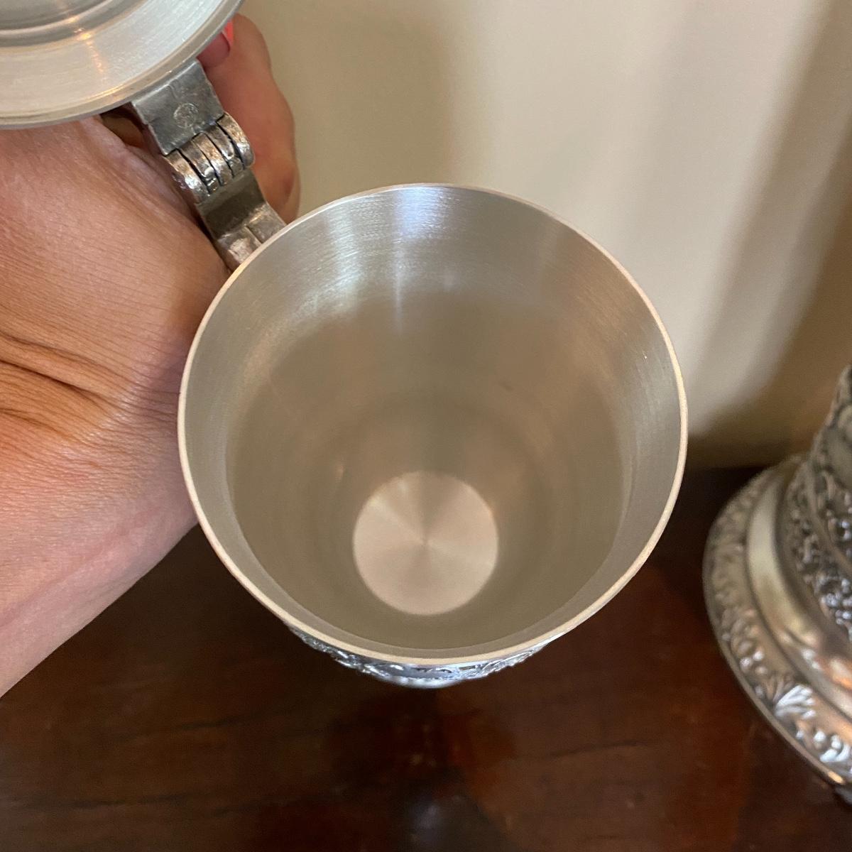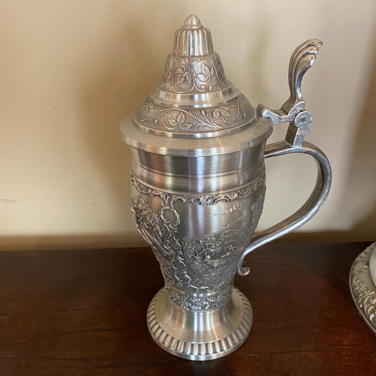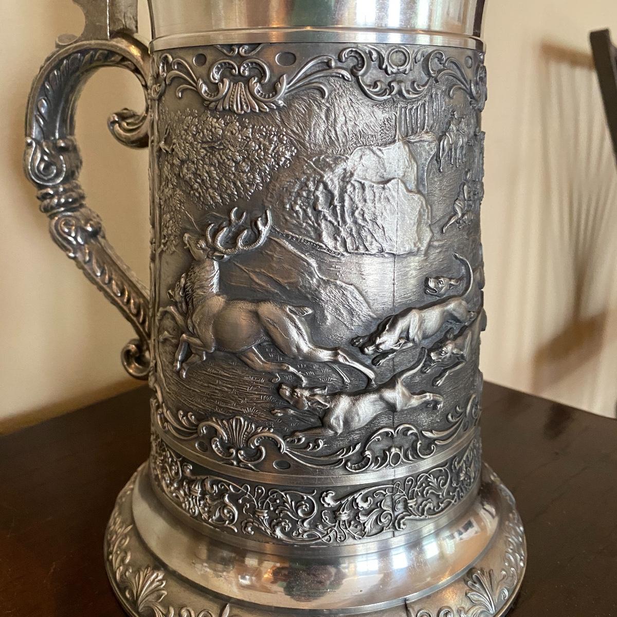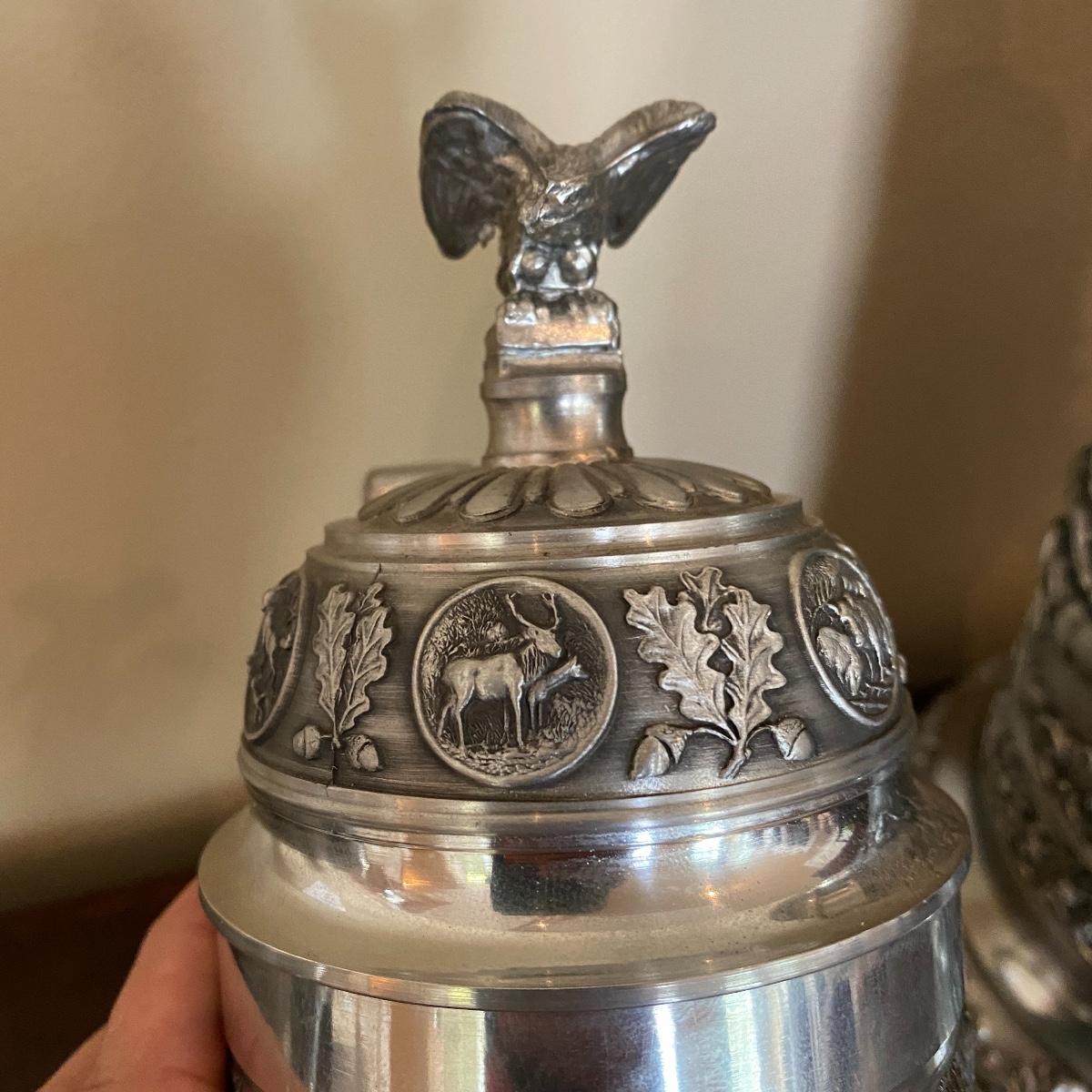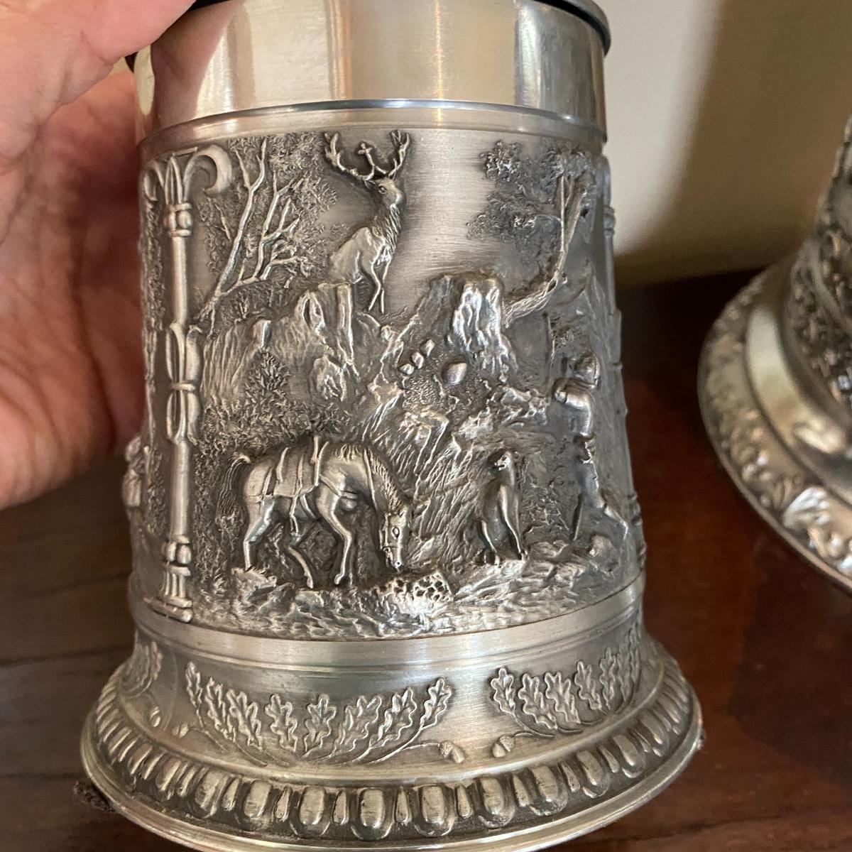 Three pewter steins. All are stamped 95% zinn pewter. Tallest measures 12” tall and 8”wide at handle. Shipping available
