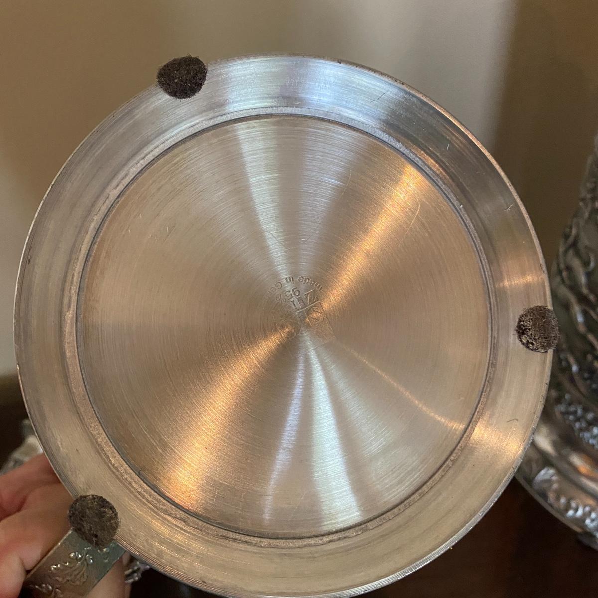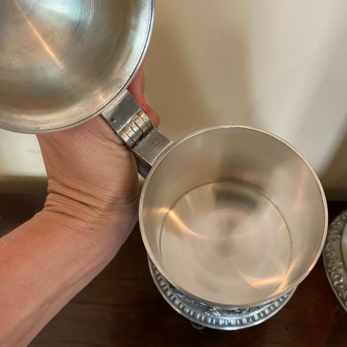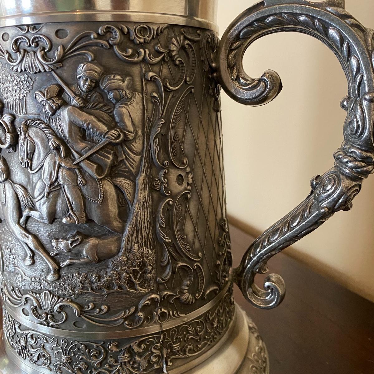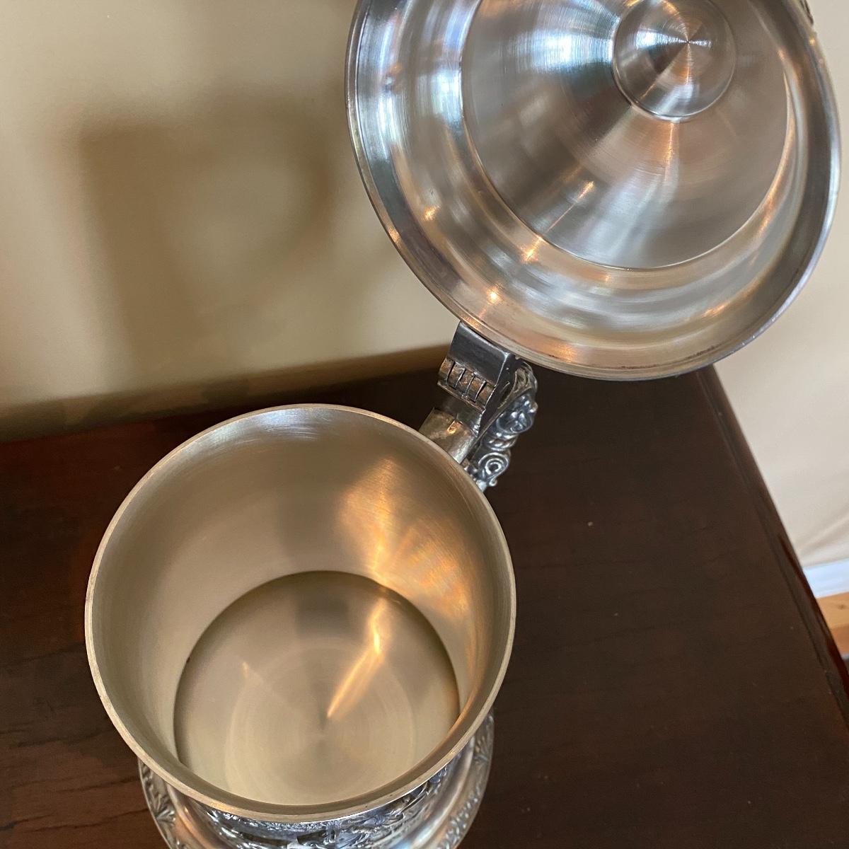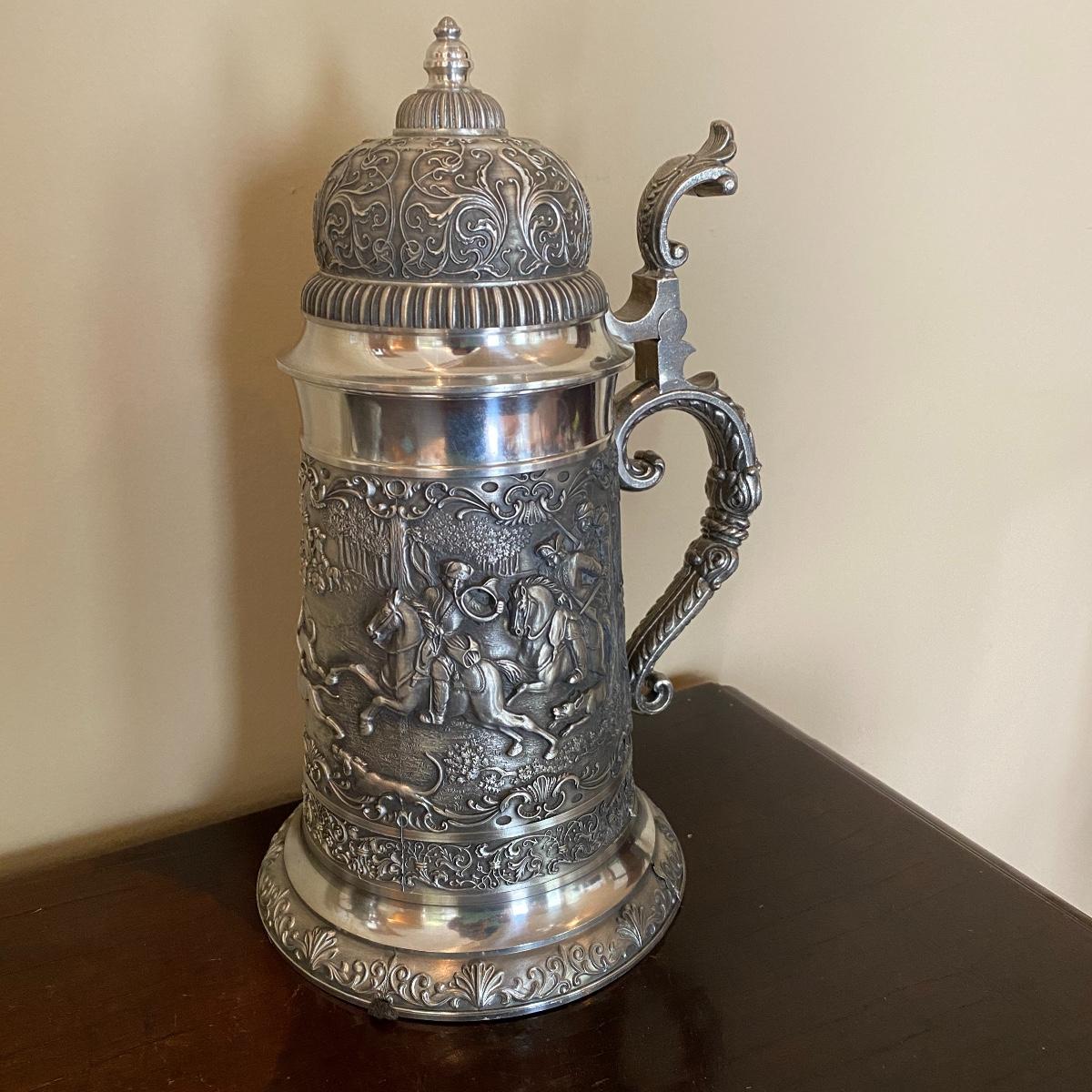 Three pewter steins. All are stamped 95% zinn pewter. Tallest measures 12” tall and 8”wide at handle. Shipping available
