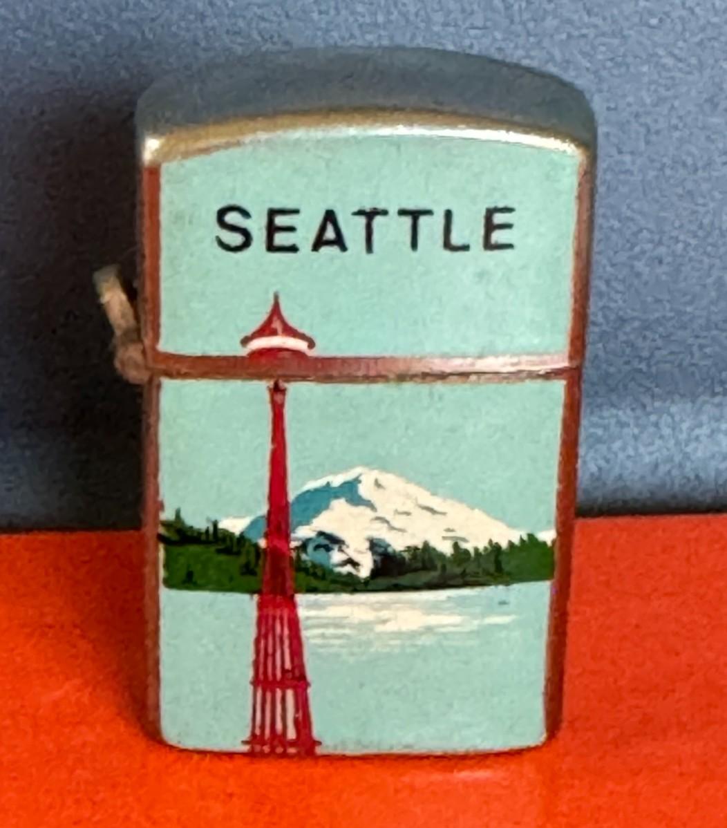 Zippo lighter featuring the Seattle Space Needle and the word "SEATTLE". where it is described as "The Space Needle and downtown Seattle Zippo Lighter"