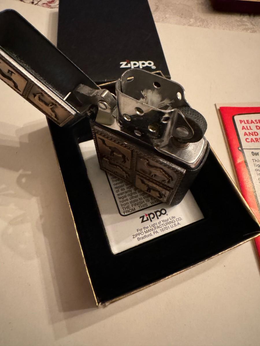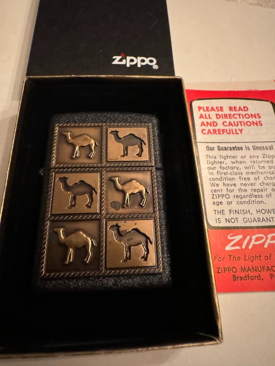 Zippo lighter with a black crackle finish and a raised brass emblem depicting a herd of camels.