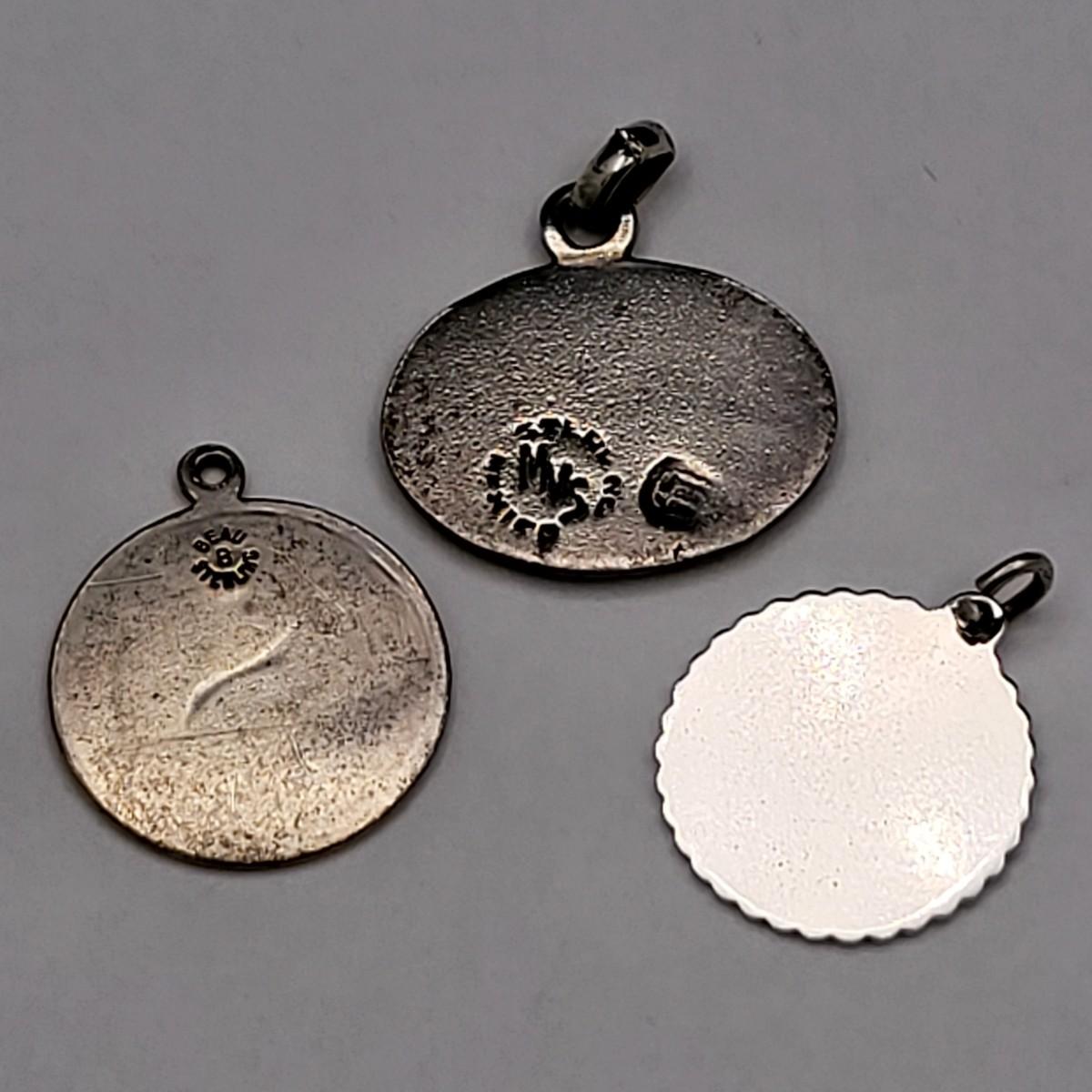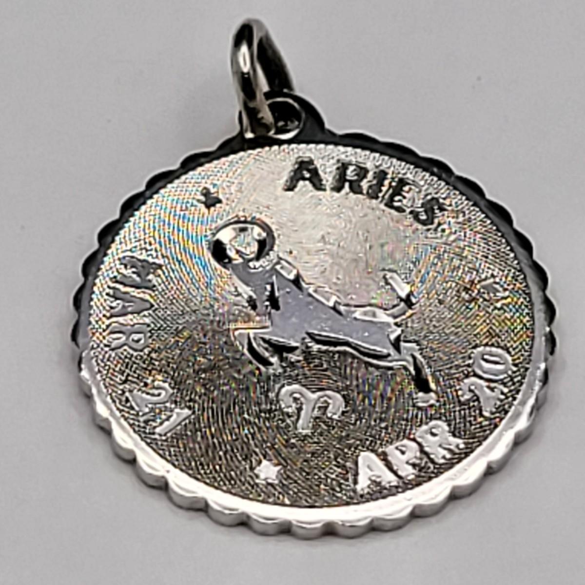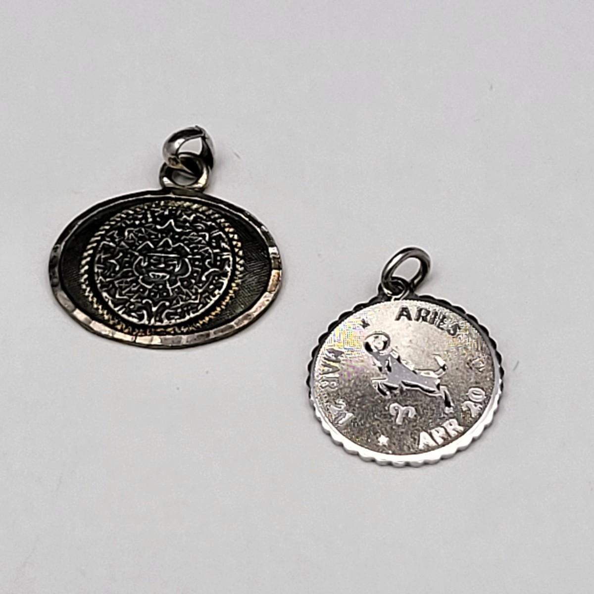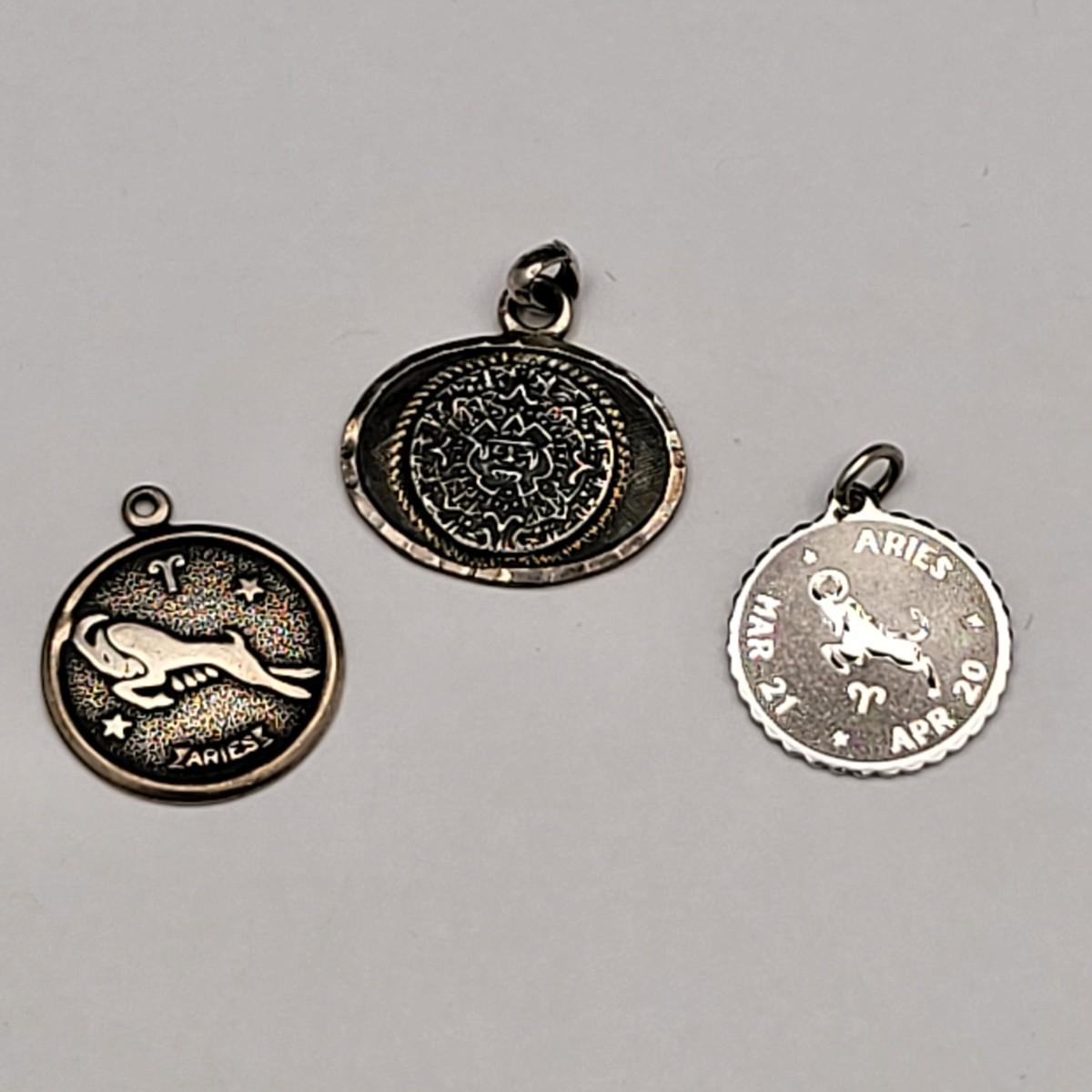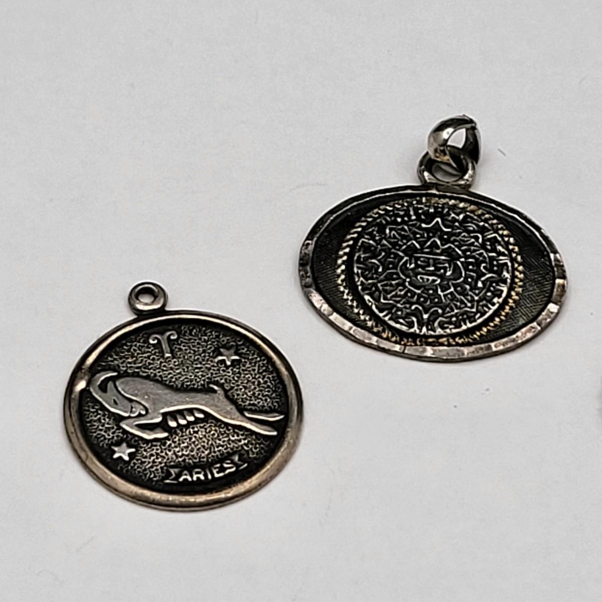 One of the Aries charms is stamped, the shiny one is of unknown metal. Vintage oval Mexico/Mayan sterling pendant.