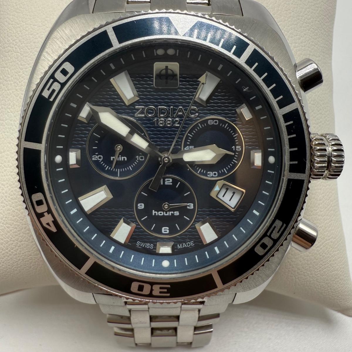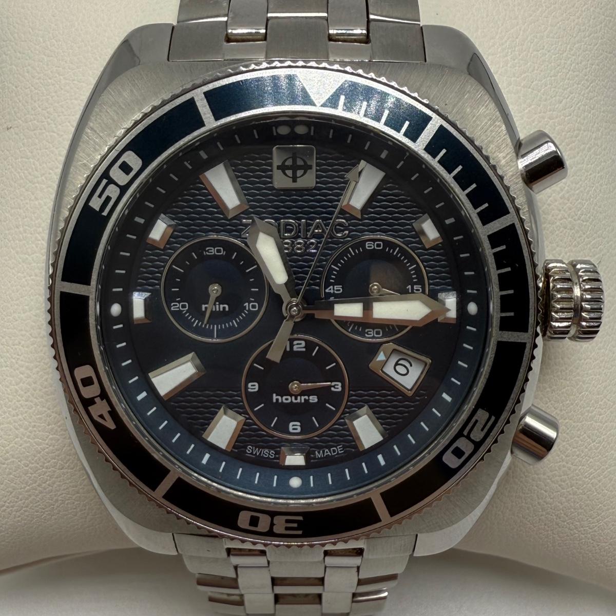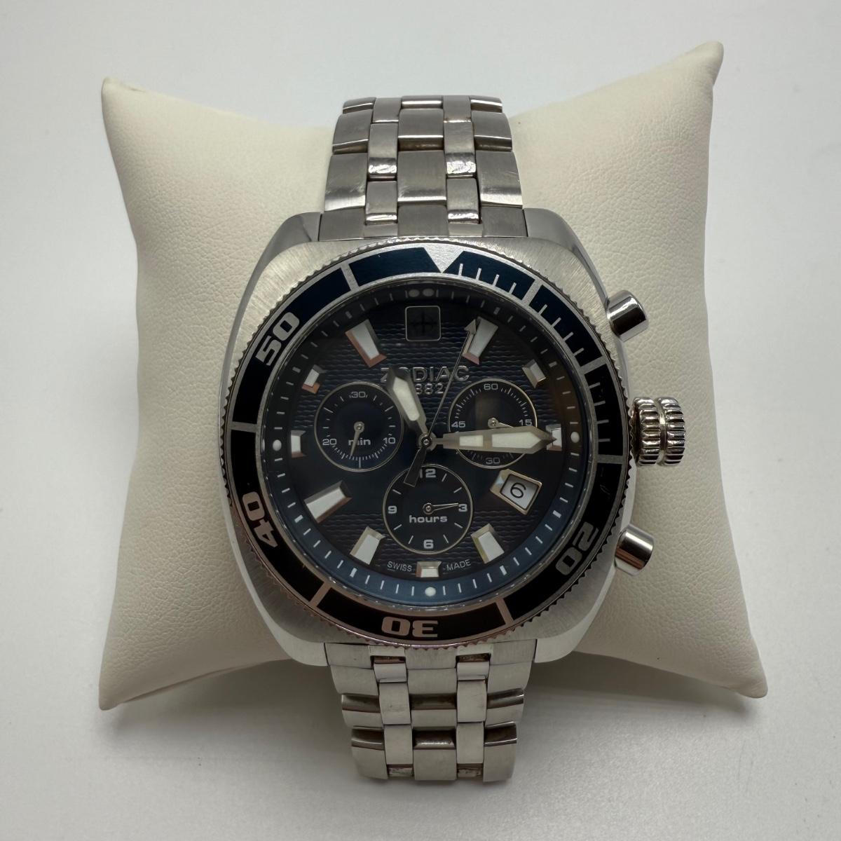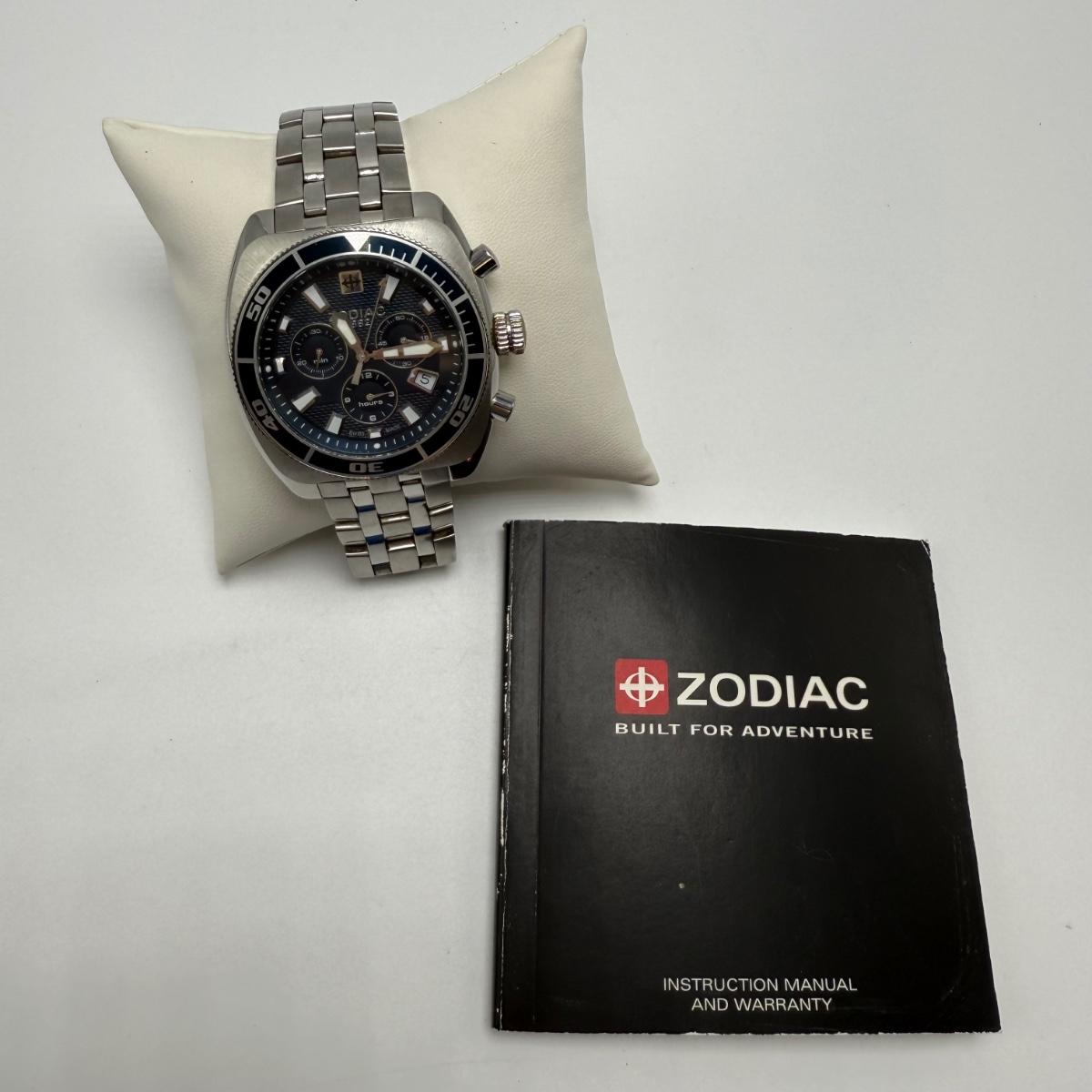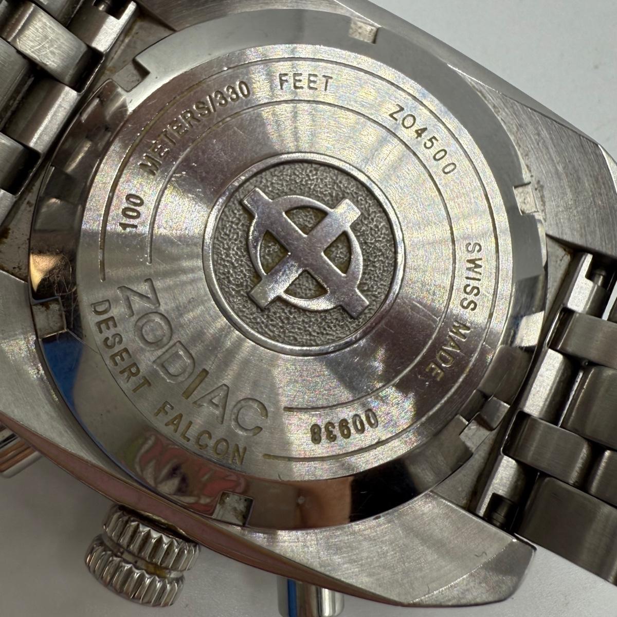 Men’s Zodiac Desert Falcon Watch, model ZO4500. The watch features a hefty stainless steel band and watch case. It has multiple functions and glows in the dark! This watch is not currently ticking. No blemishes noted other than some light scratches on the metal. It could use a gentle cleaning. Instruction manual and warranty booklet is included.