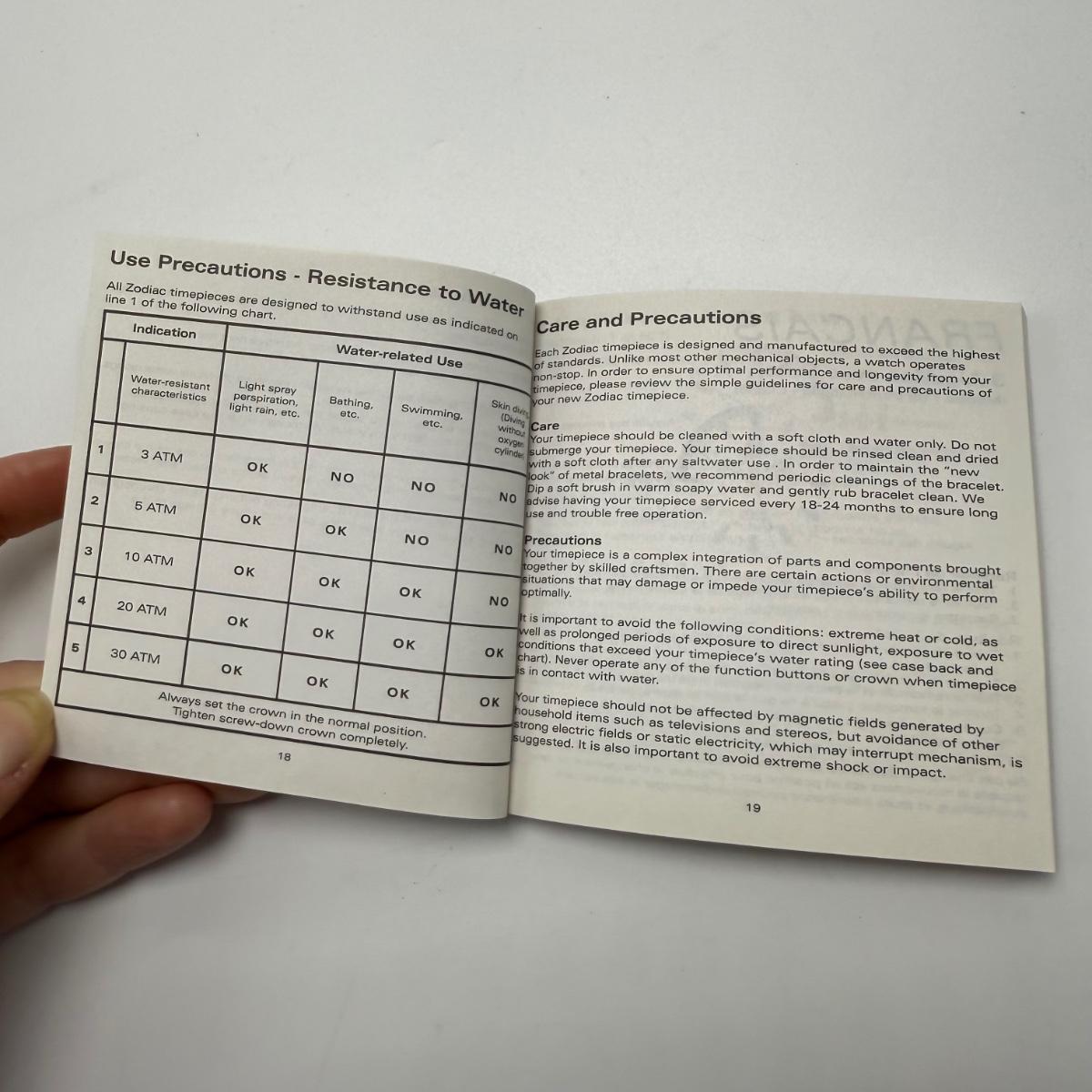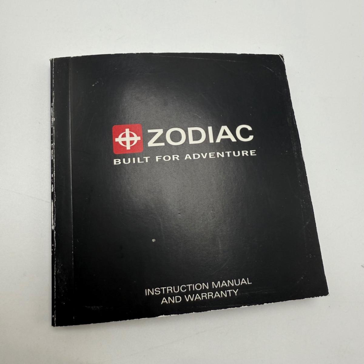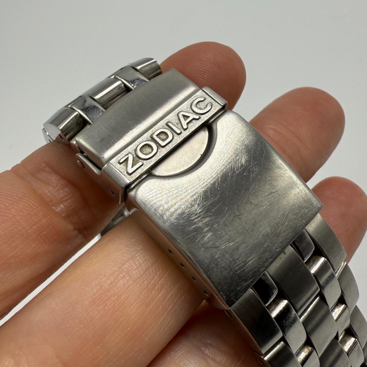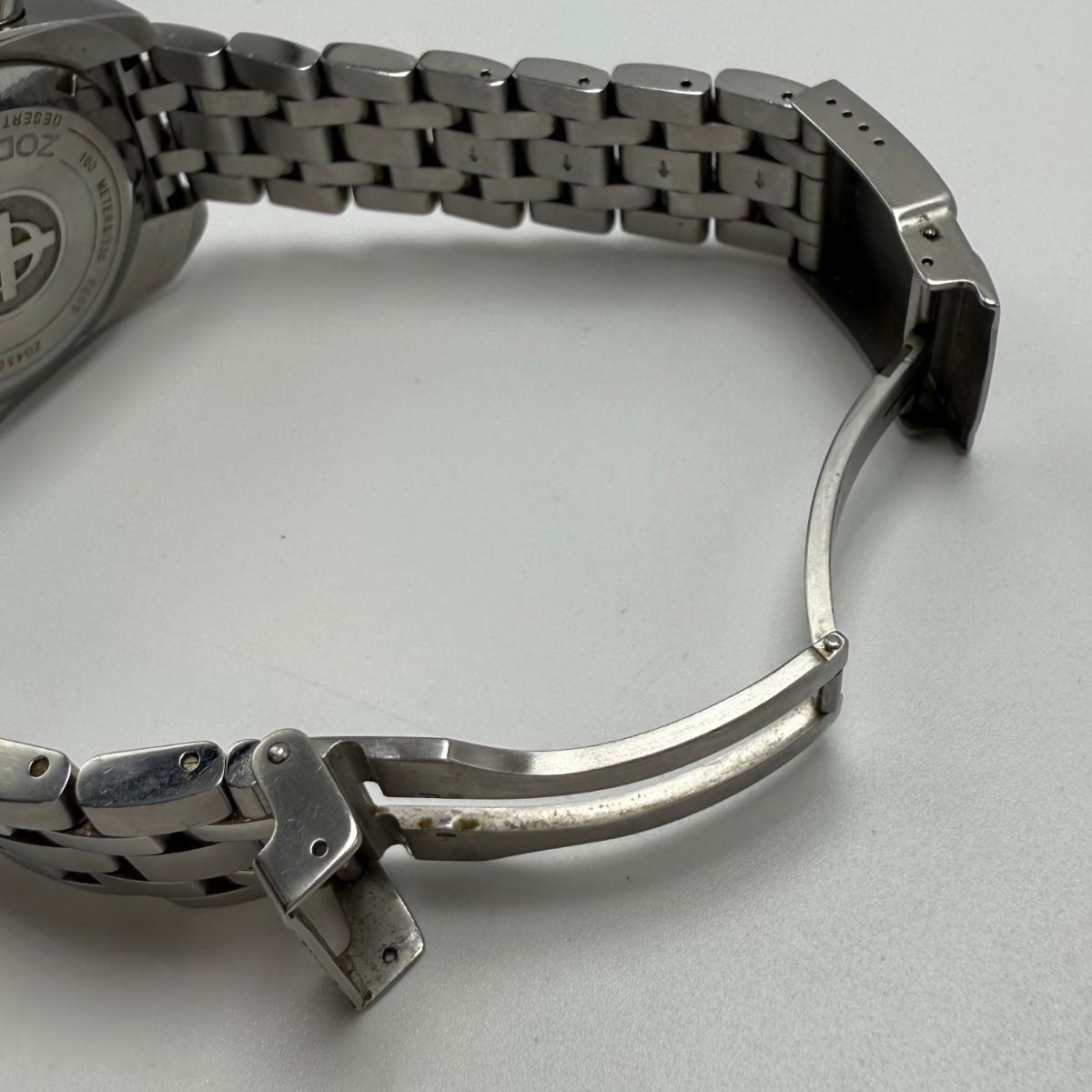 Men’s Zodiac Desert Falcon Watch, model ZO4500. The watch features a hefty stainless steel band and watch case. It has multiple functions and glows in the dark! This watch is not currently ticking. No blemishes noted other than some light scratches on the metal. It could use a gentle cleaning. Instruction manual and warranty booklet is included.