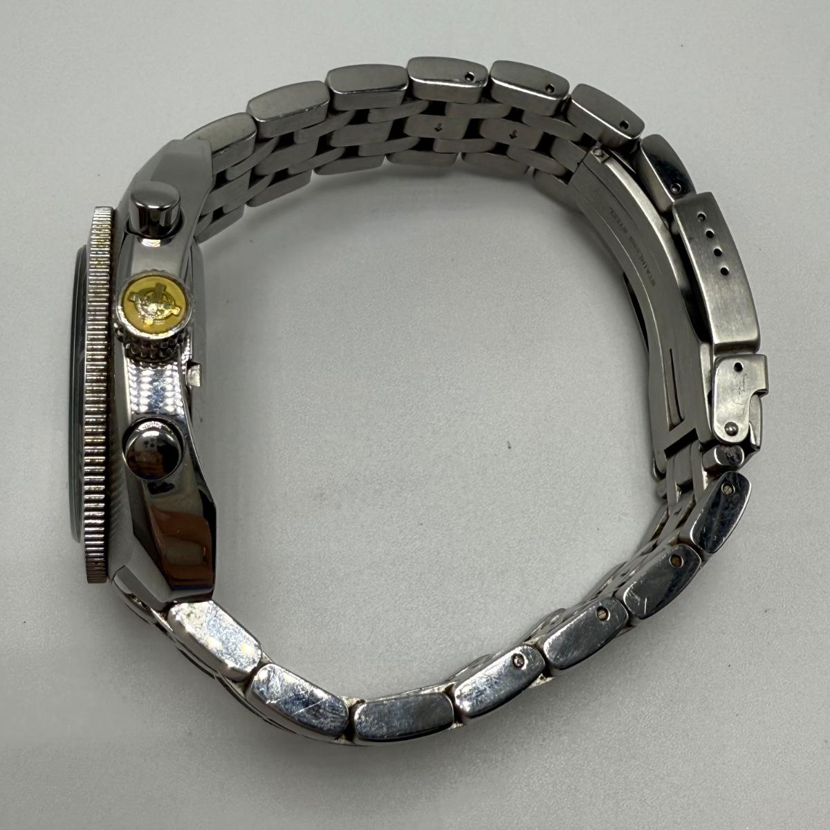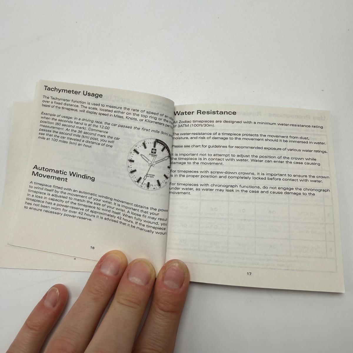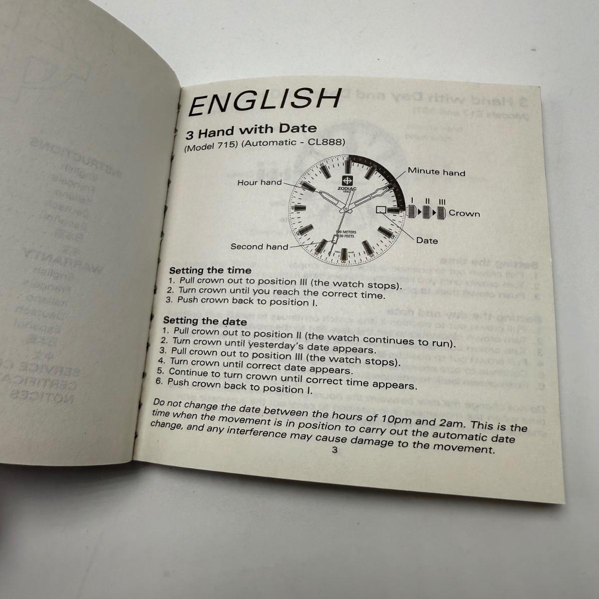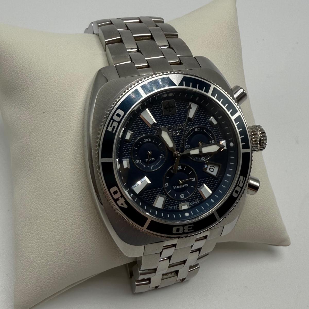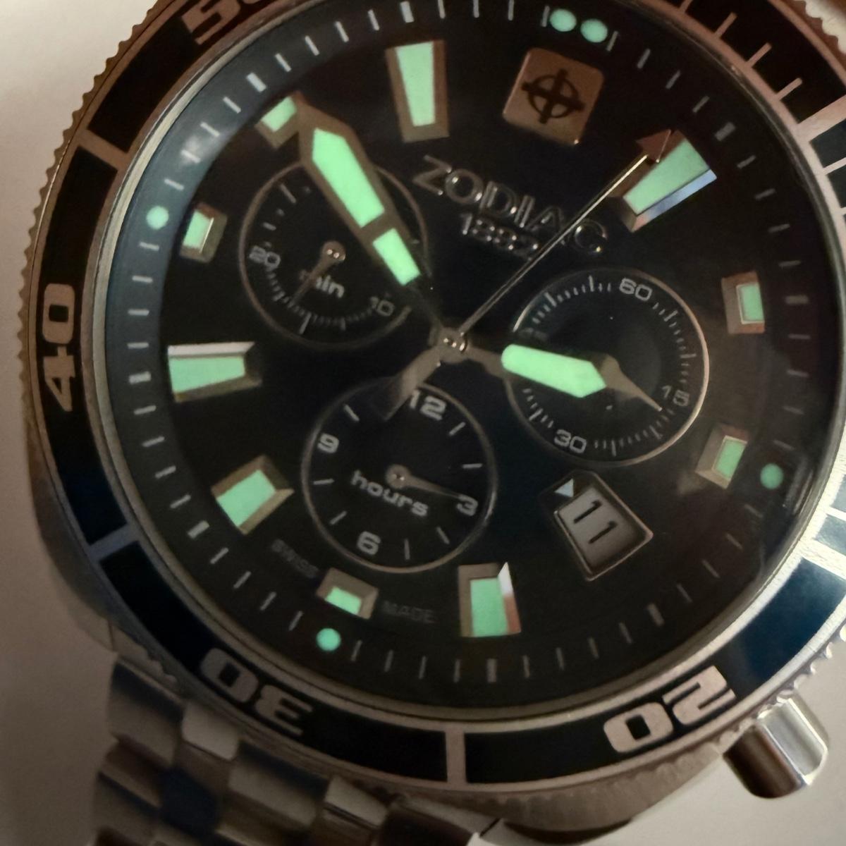 Men’s Zodiac Desert Falcon Watch, model ZO4500. The watch features a hefty stainless steel band and watch case. It has multiple functions and glows in the dark! This watch is not currently ticking. No blemishes noted other than some light scratches on the metal. It could use a gentle cleaning. Instruction manual and warranty booklet is included.