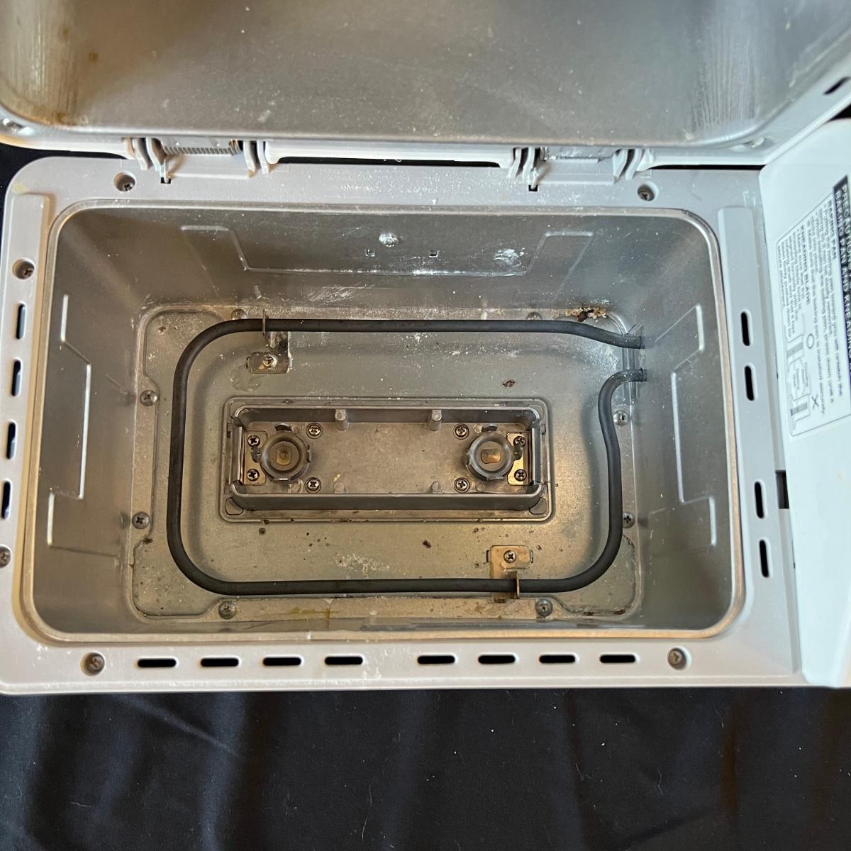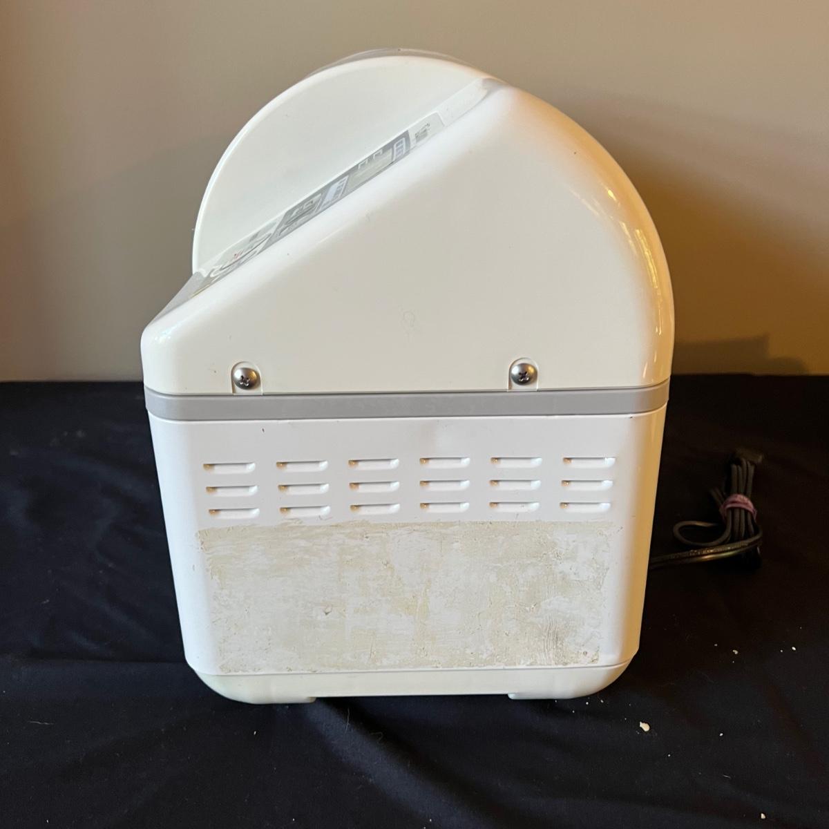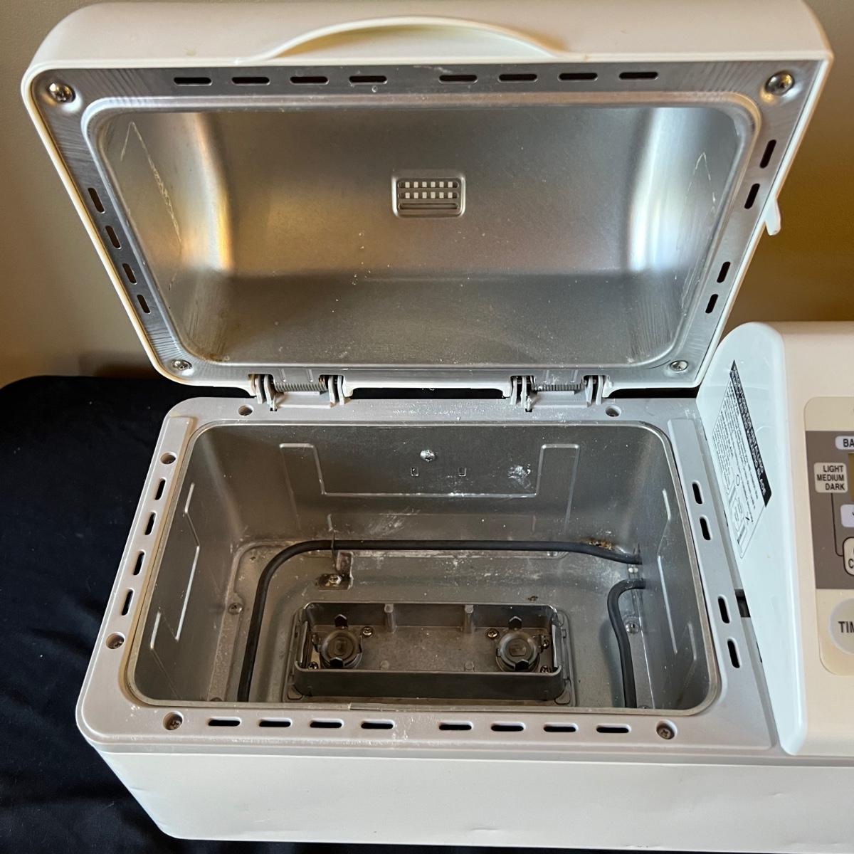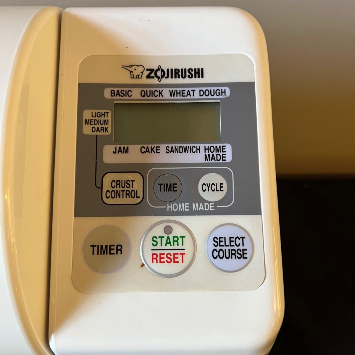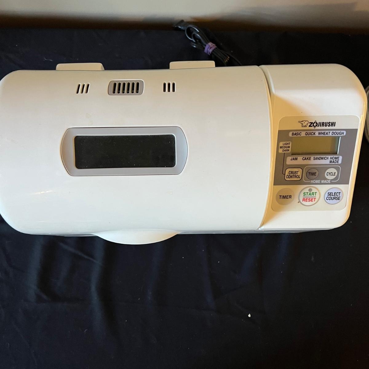 Zojirushi bread machine. Model includes eight settings; Basic, quick, wheat, dough, jam, cake, sandwich and homemade (customizable and programmable). Minor scratches on paddles and bin.