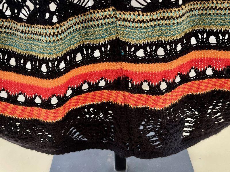 Black crocheted design with borders of bright orange and olive