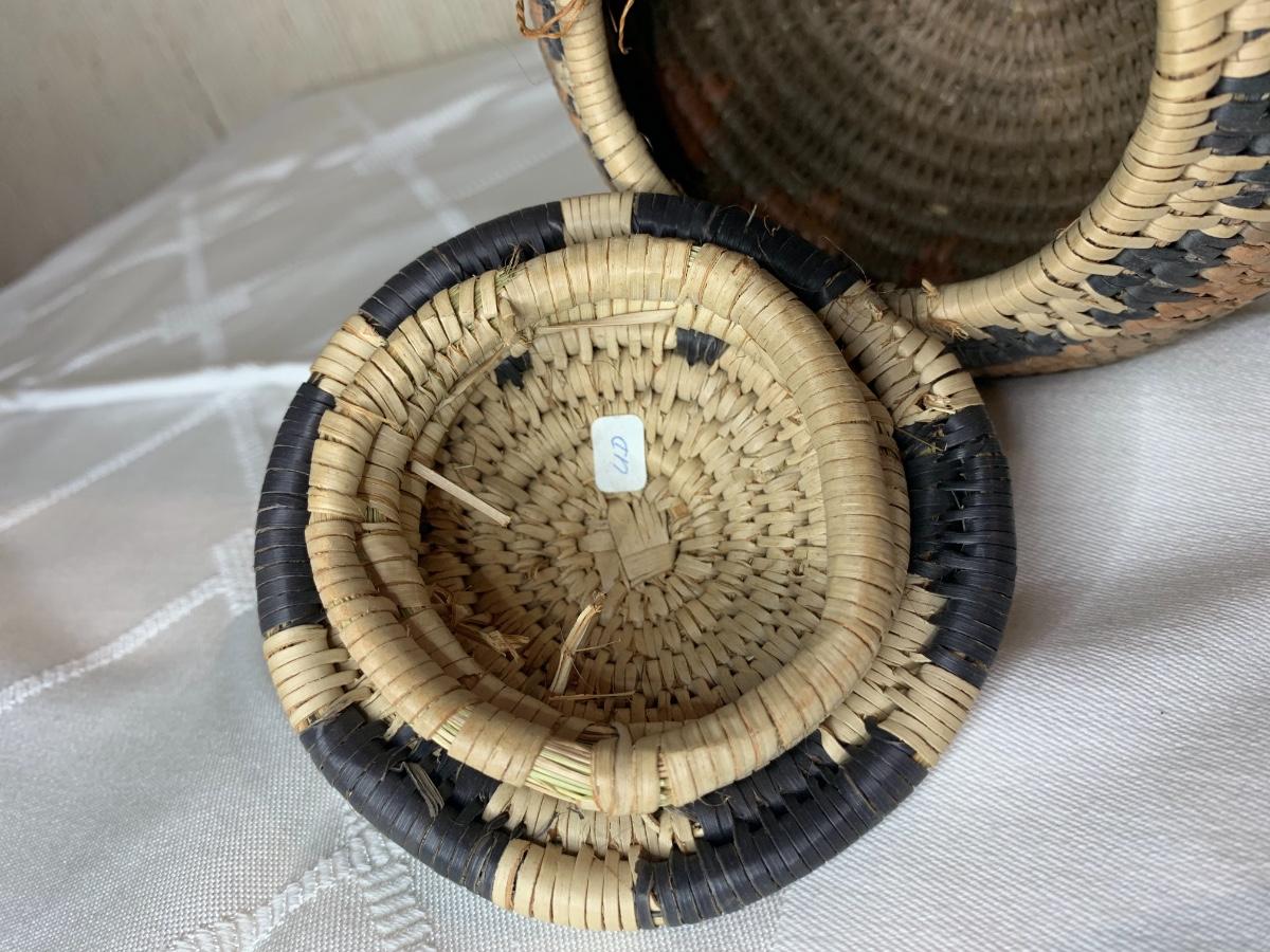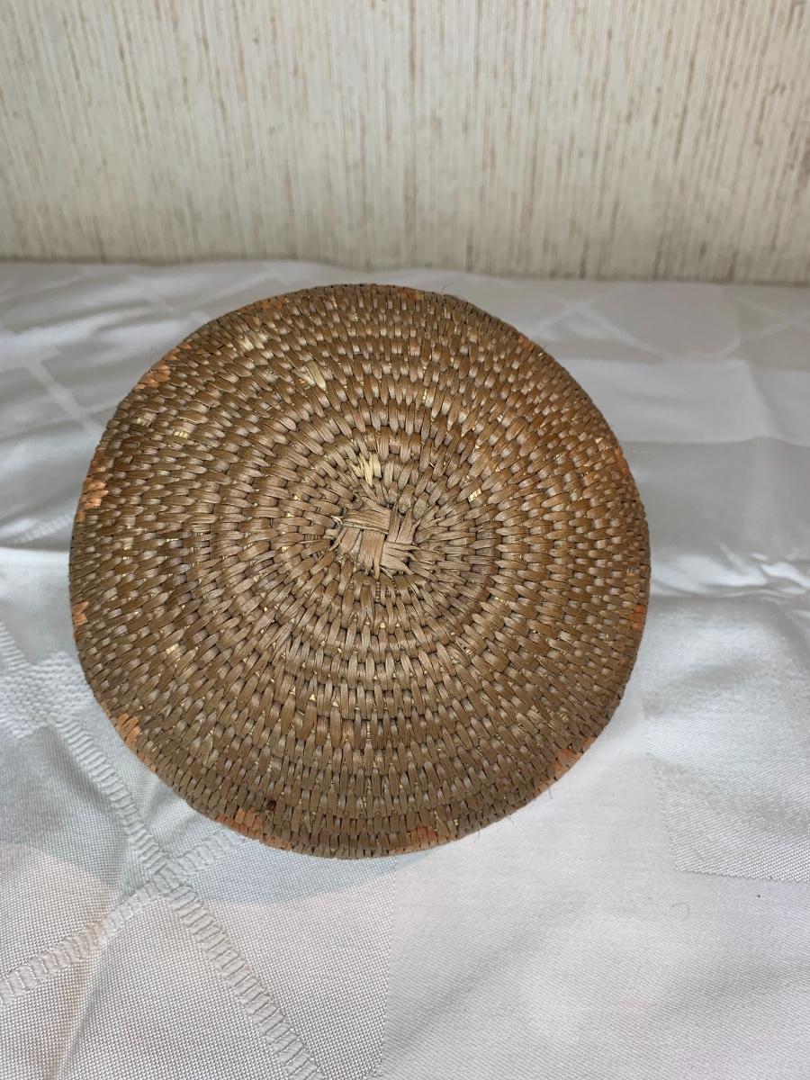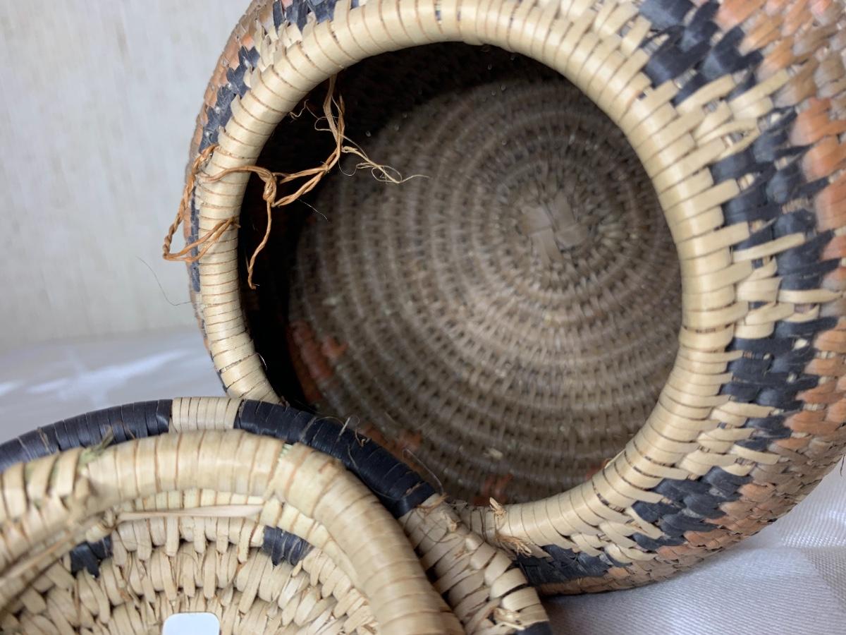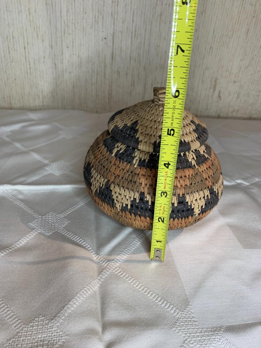 6” tall x 51/2” diam. Dark brown, orange and tan triangle design. Excellent condition.