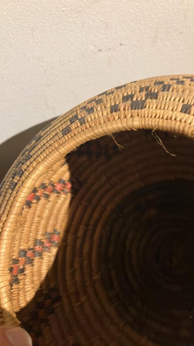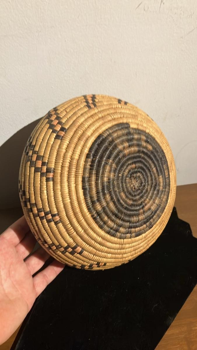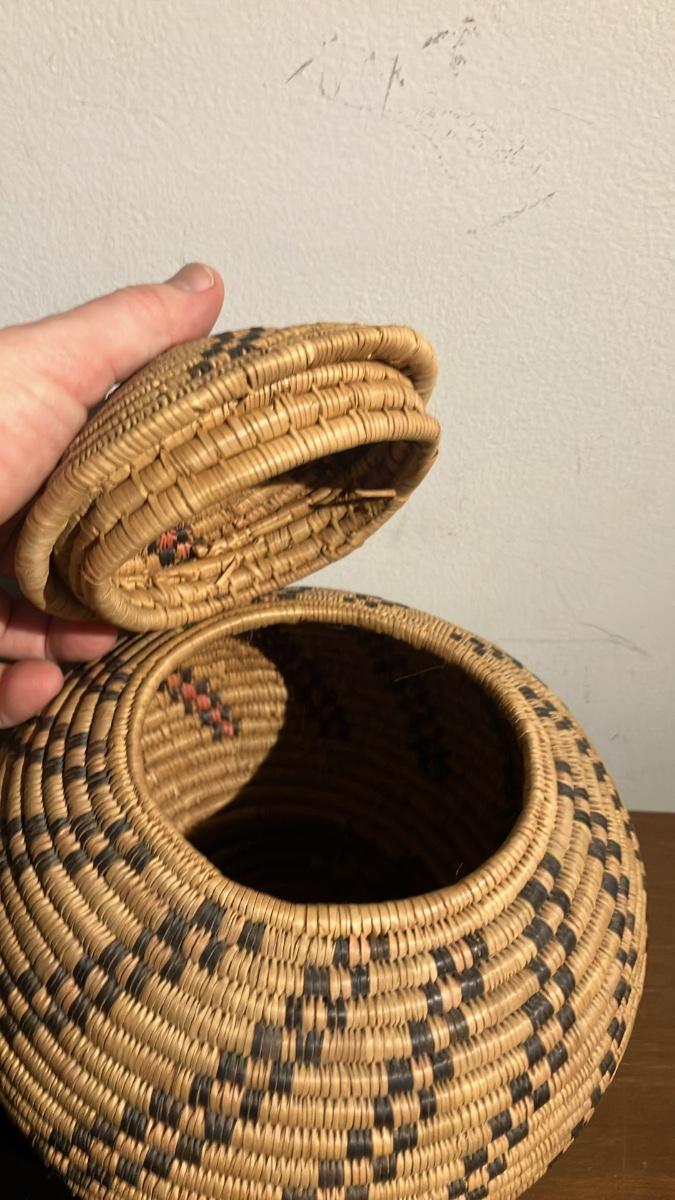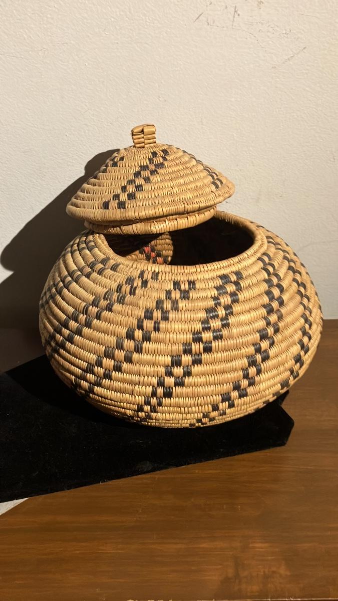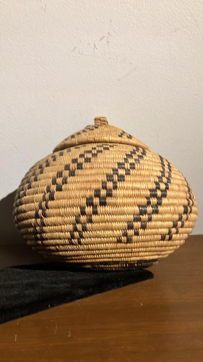Measures approx. 9 inches at widest point and 8 inches tall (with lid). Excellent condition – tight weave, no damage. Authentic African craftsmanship!