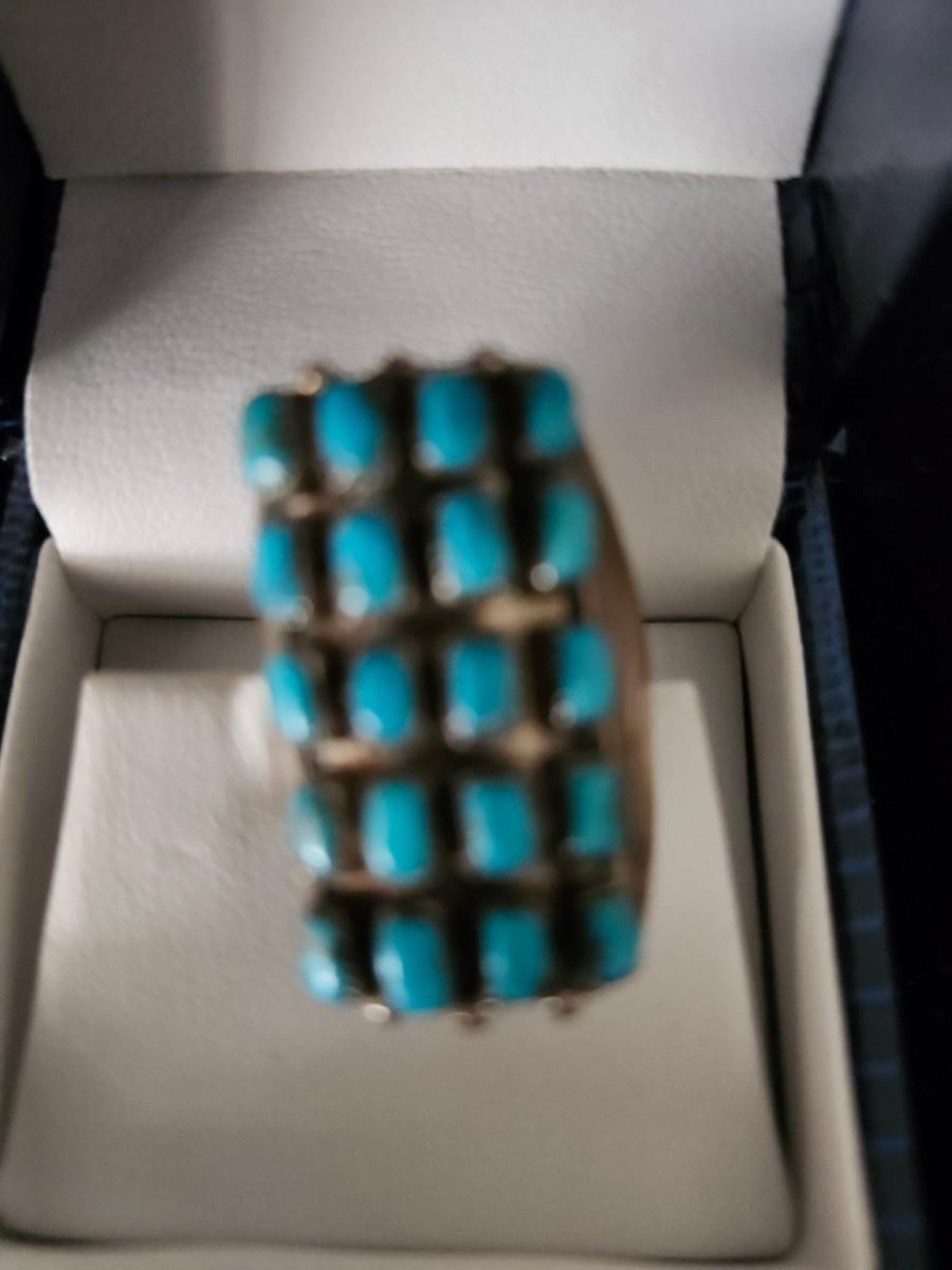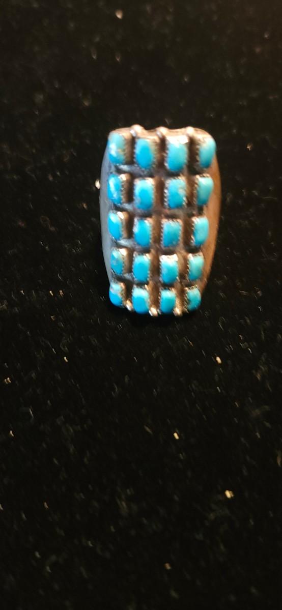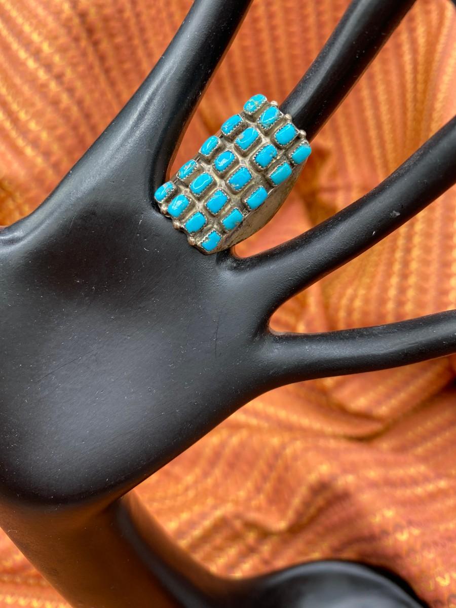 1930s style, well matched hand cut square turquoise stones. Size 6.5. Retail ranges from $230 to $600.