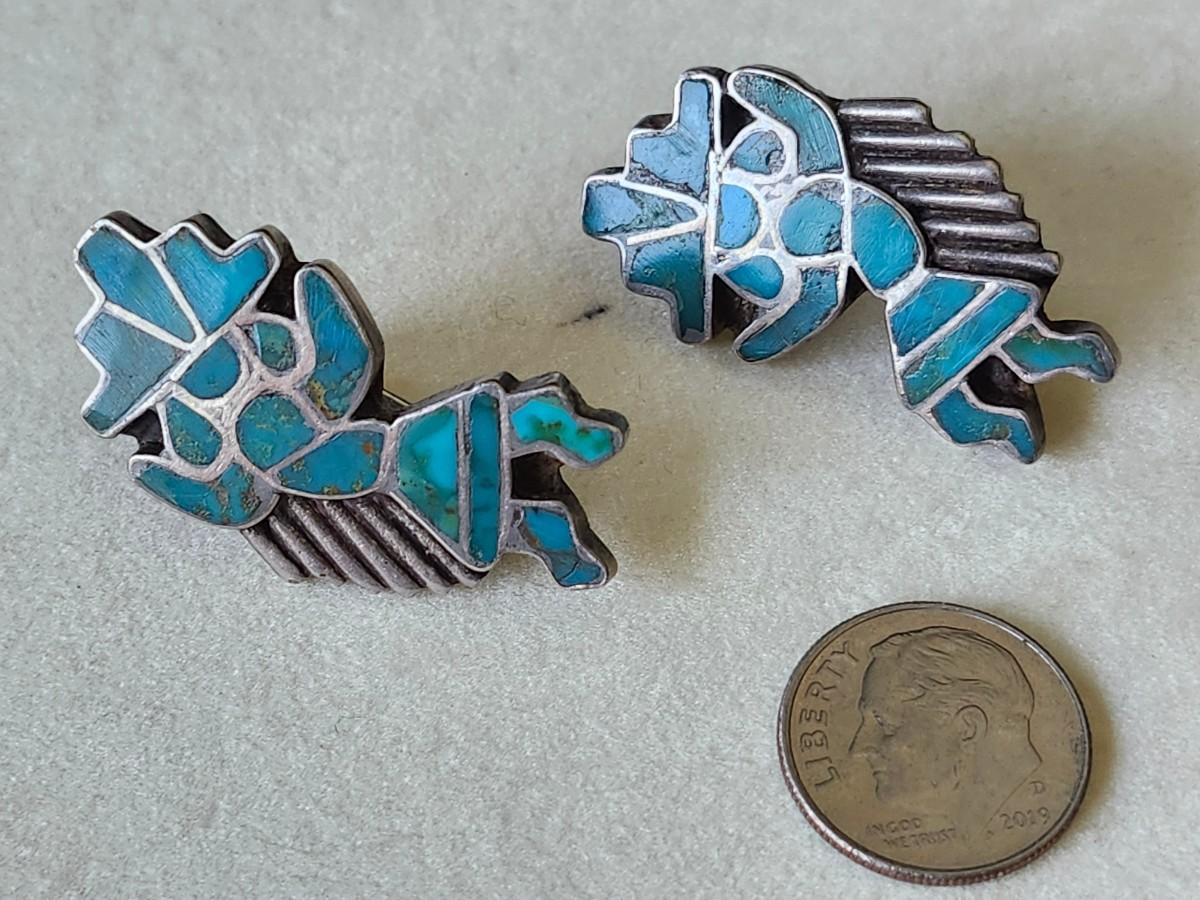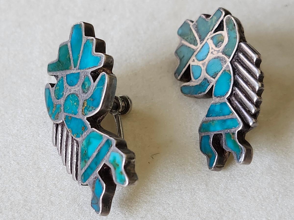 These are hard to find on the market. Zuni Pueblo mosaic inlay of the Rainbow Man, a guardian spirit and the symbol of protection. Screwback. Similar are listed at over $500 online.