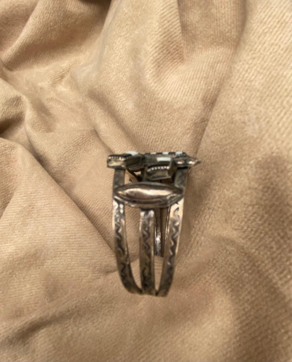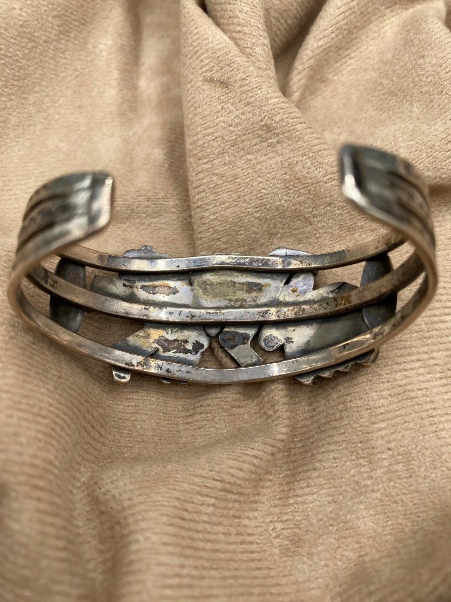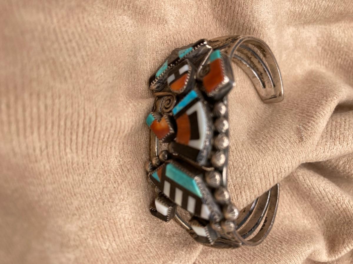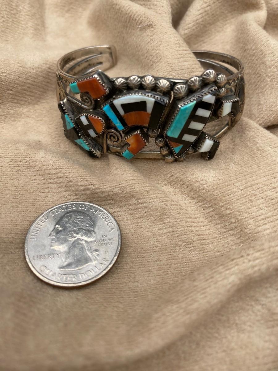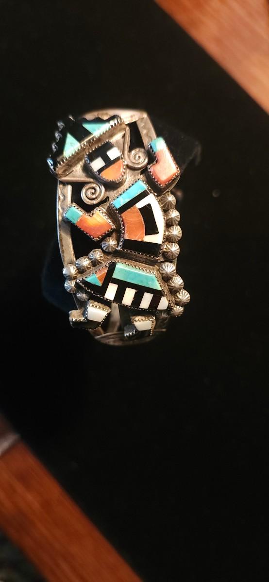 This high quality artistry bracelet is precisely stone to stone inlaid. The gems are turquoise, jet, mother of pearl, and spiny oyster. It could possibly be by Leo Pablano as it is in his exquisitely complex early style, the bracelet is not signed, and Leo Poblano did not sign his work. Few artists can match his advanced intricate inlay work.
