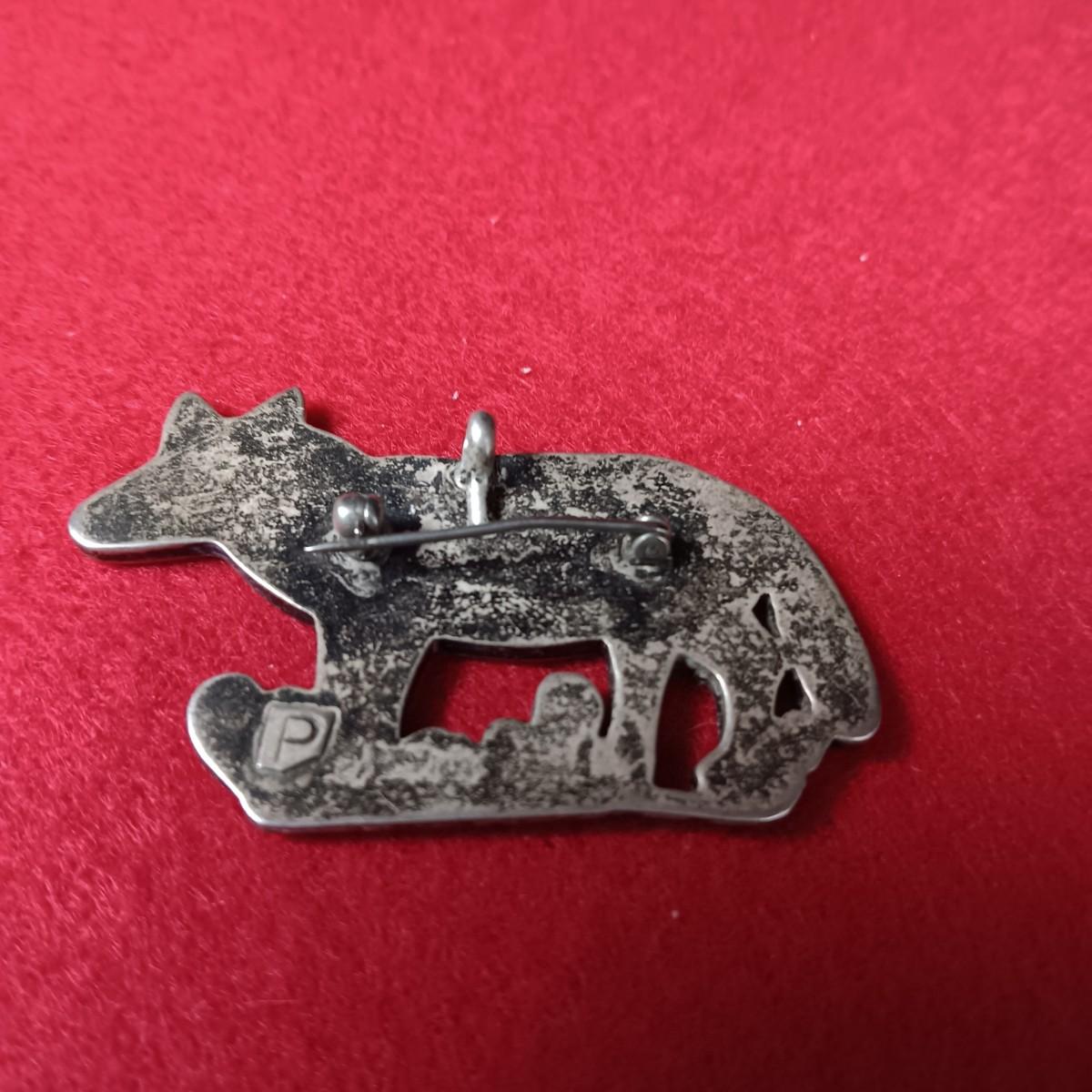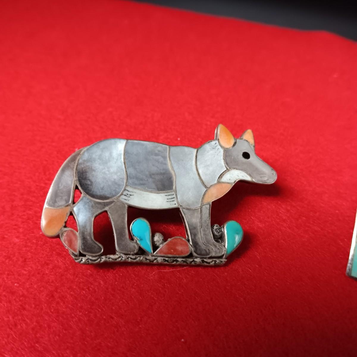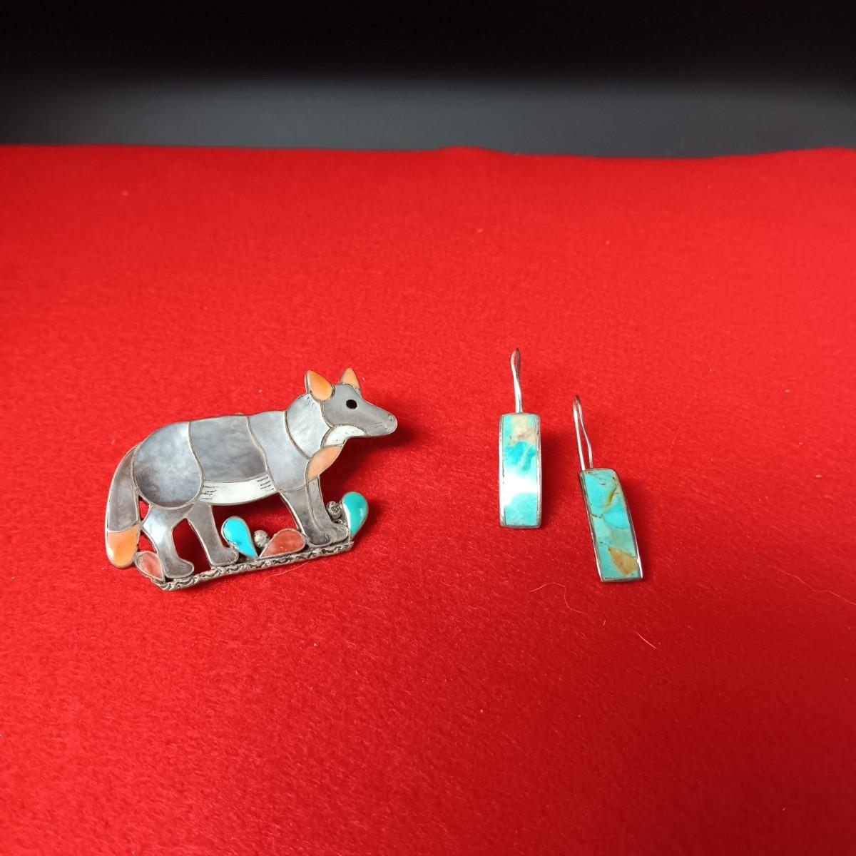 ZUNI WOLF BROOCH OR PENDANT BY PORFILIO SHEYKA AND TURQUOISE AND STERLING EARRINGS