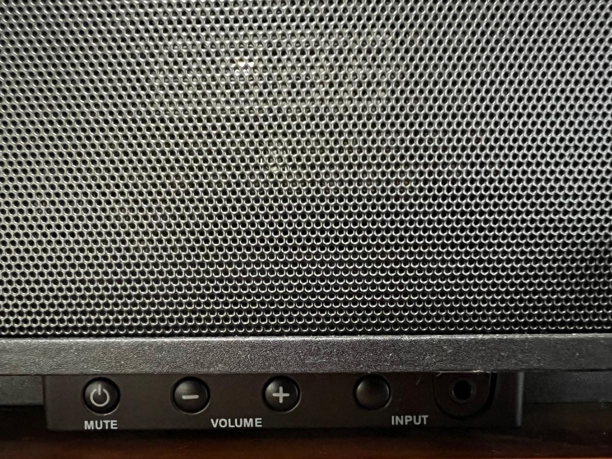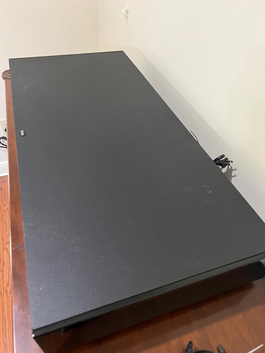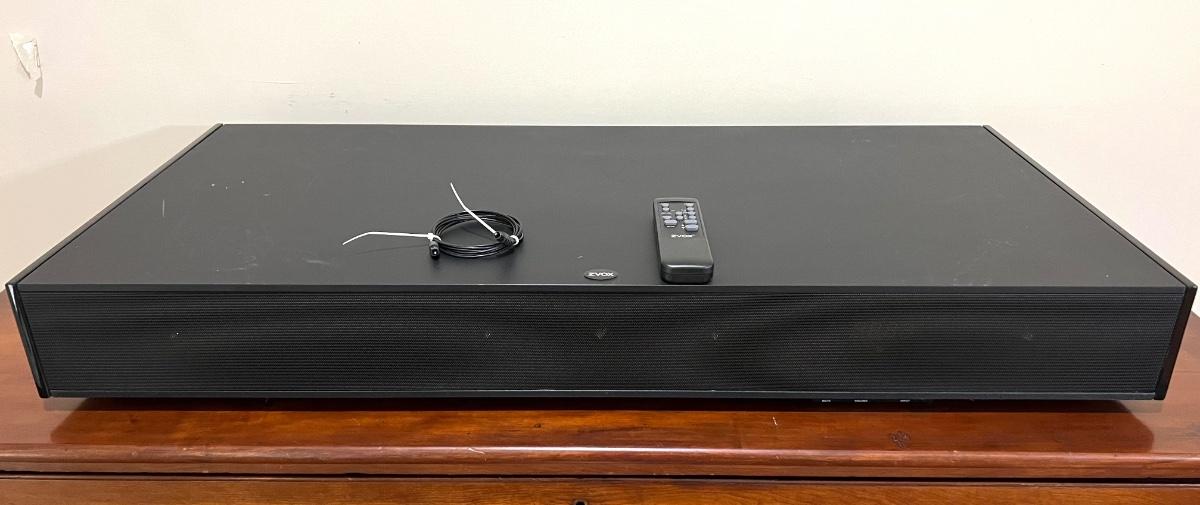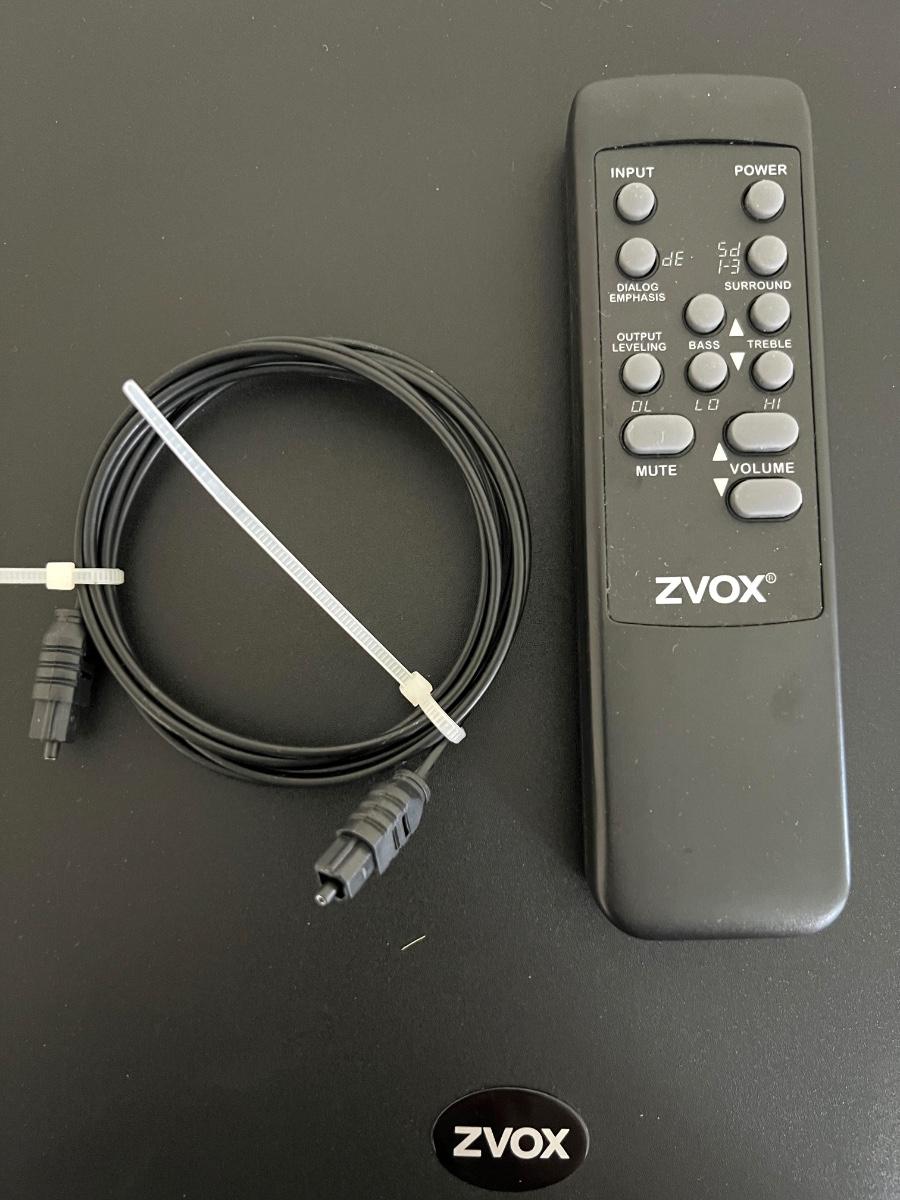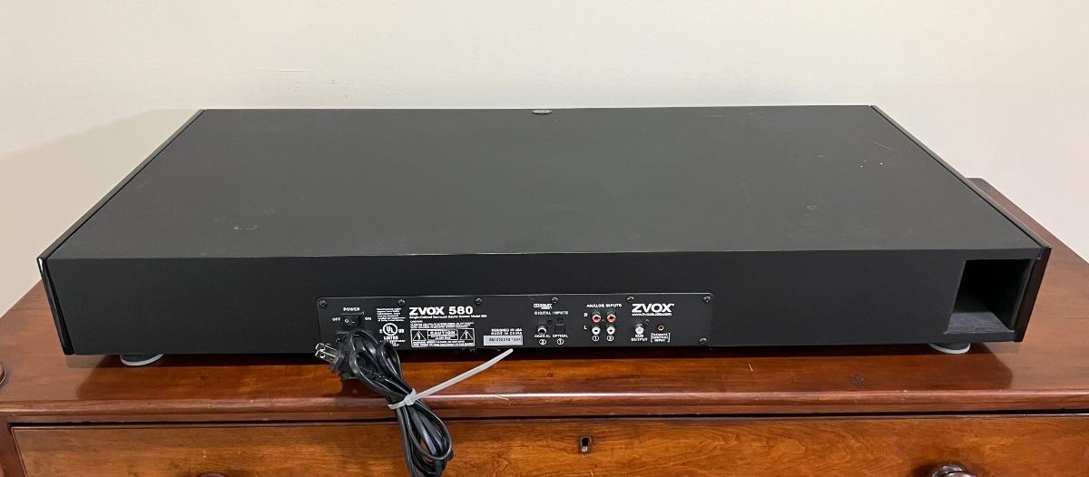 ZVOX Model 580 single cabinet surround sound system. Tested and works as it should. Sounds great. Comes with remote and optical cable. Measures 36”W x 16.5”D x 5”T.