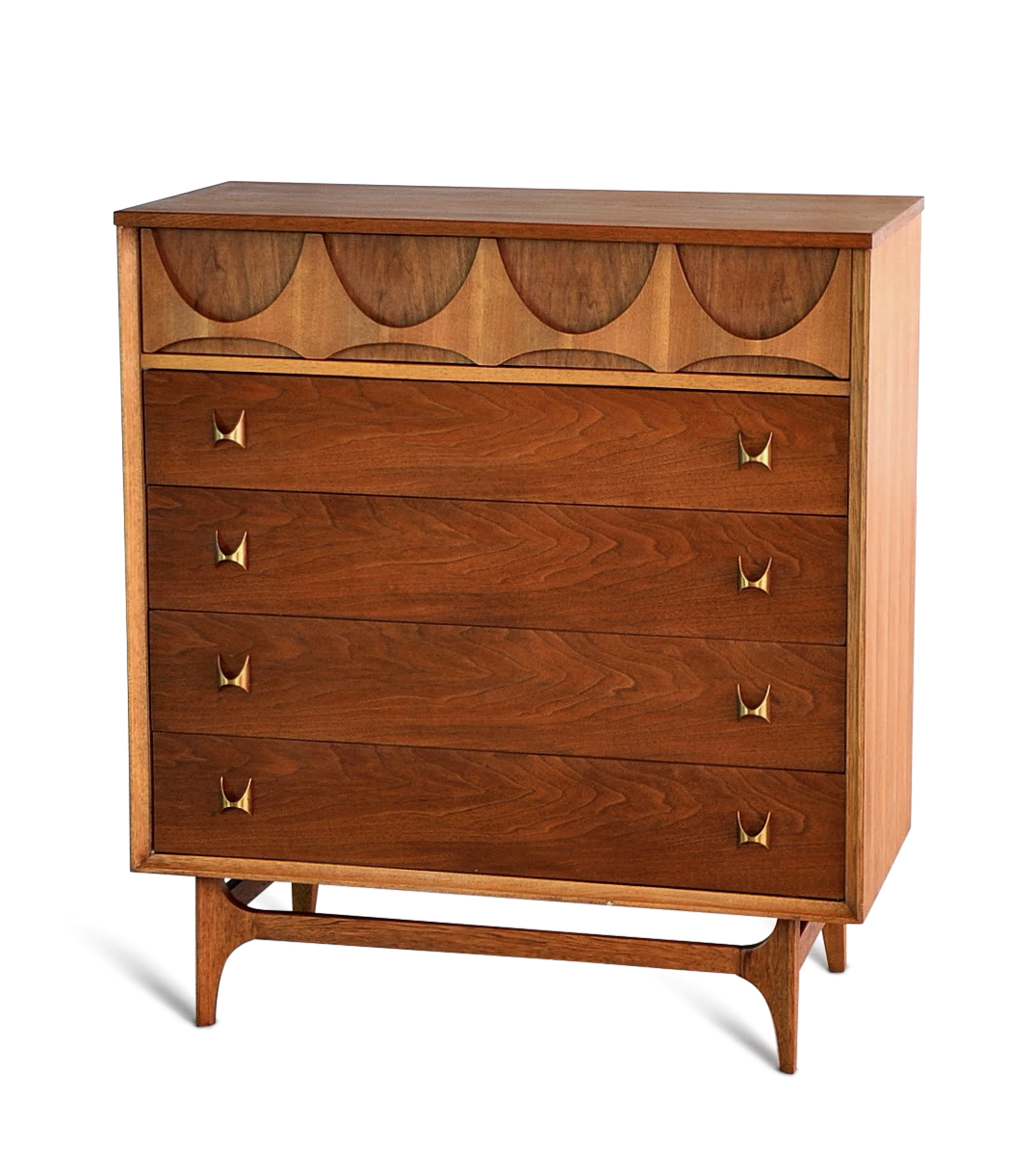 An old Broyhill brochure calls the Brasilia wood “softly shaded walnut” and you’ll want to keep the wood in good condition in if you’re lucky enough to come across any. In any case, messing with the wood by way of painting or staining could affect the resale value of the piece. Be on the lookout for pieces with the original brass Brasilia hardware, like the ones in the highboy pictured below.