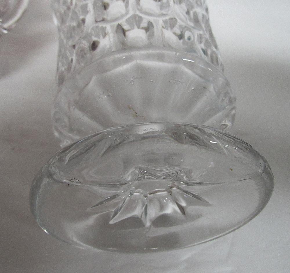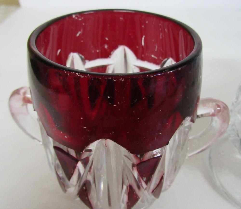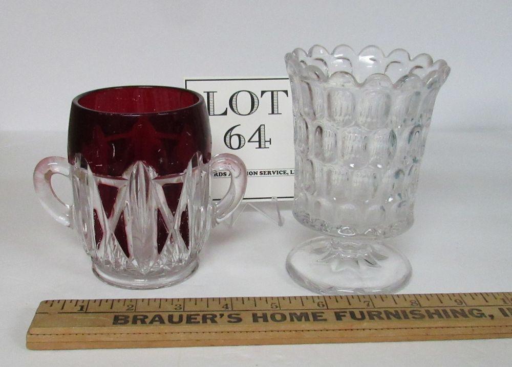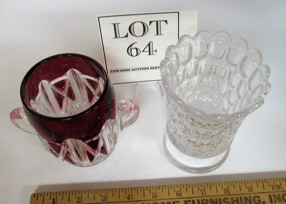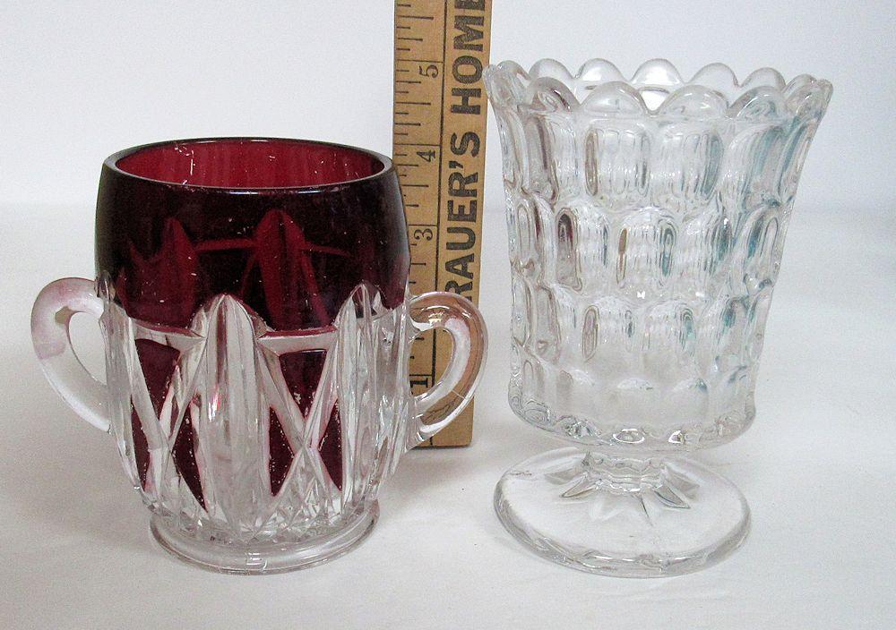 Appears to be pattern glass spooners. The ruby flashed one has scratches in the color. The clear one has some wear and discoloration on the inside bottom.