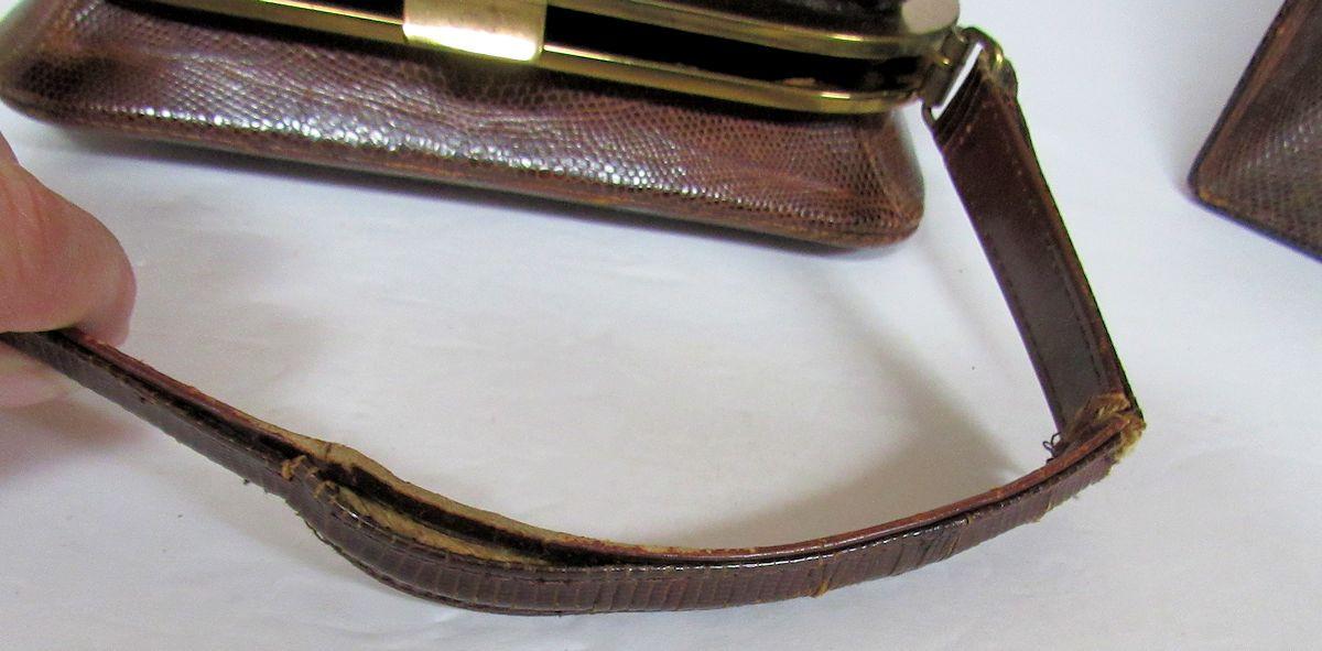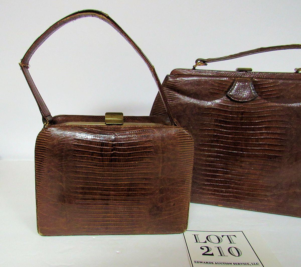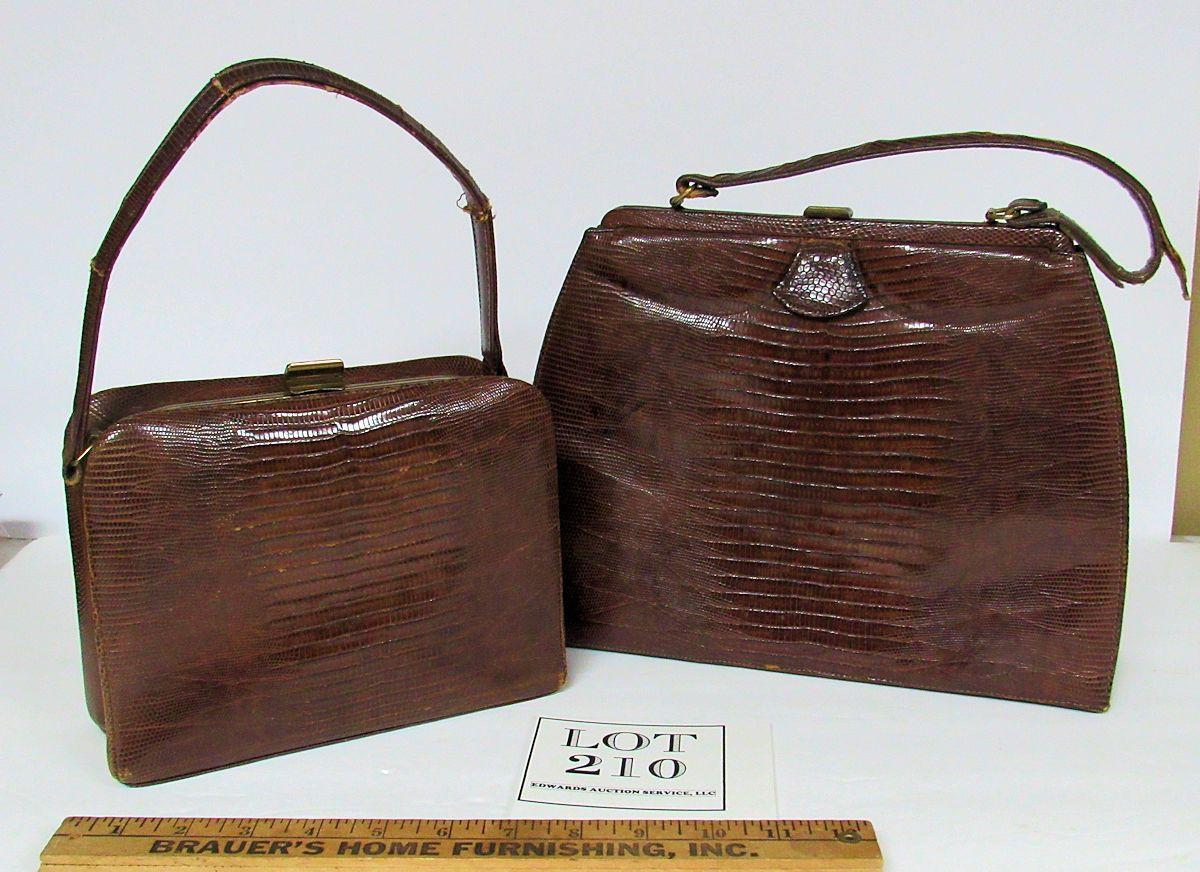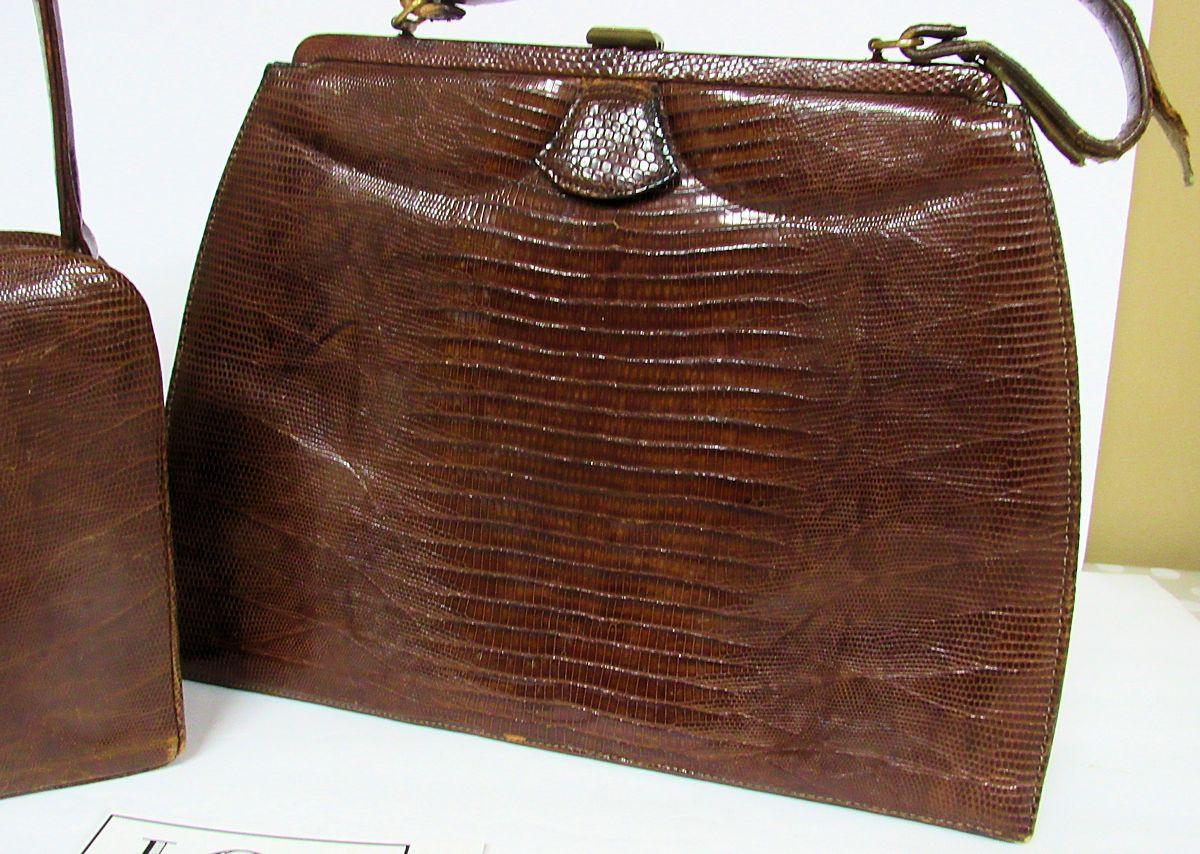 I think, but am not sure, they are alligator or lizard skin. Both handles are as is, torn, worn and in bad shape. The rest of the bags are ok but are soiled inside. One has a little change purse and pocket mirror. See all photos. All sales final.