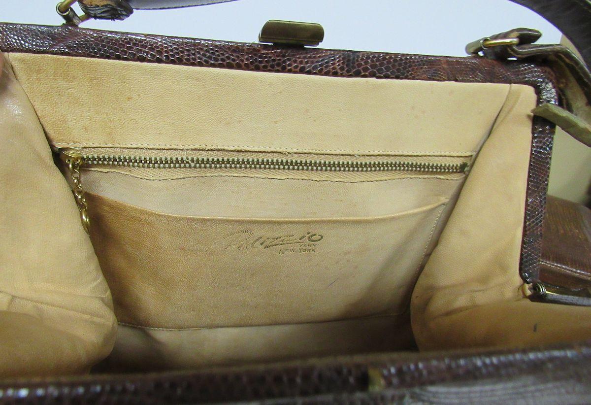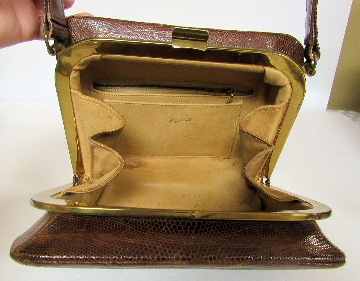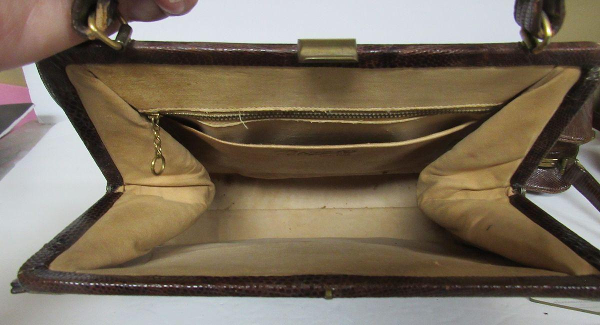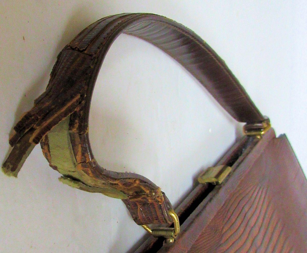 I think, but am not sure, they are alligator or lizard skin. Both handles are as is, torn, worn and in bad shape. The rest of the bags are ok but are soiled inside. One has a little change purse and pocket mirror. See all photos. All sales final.