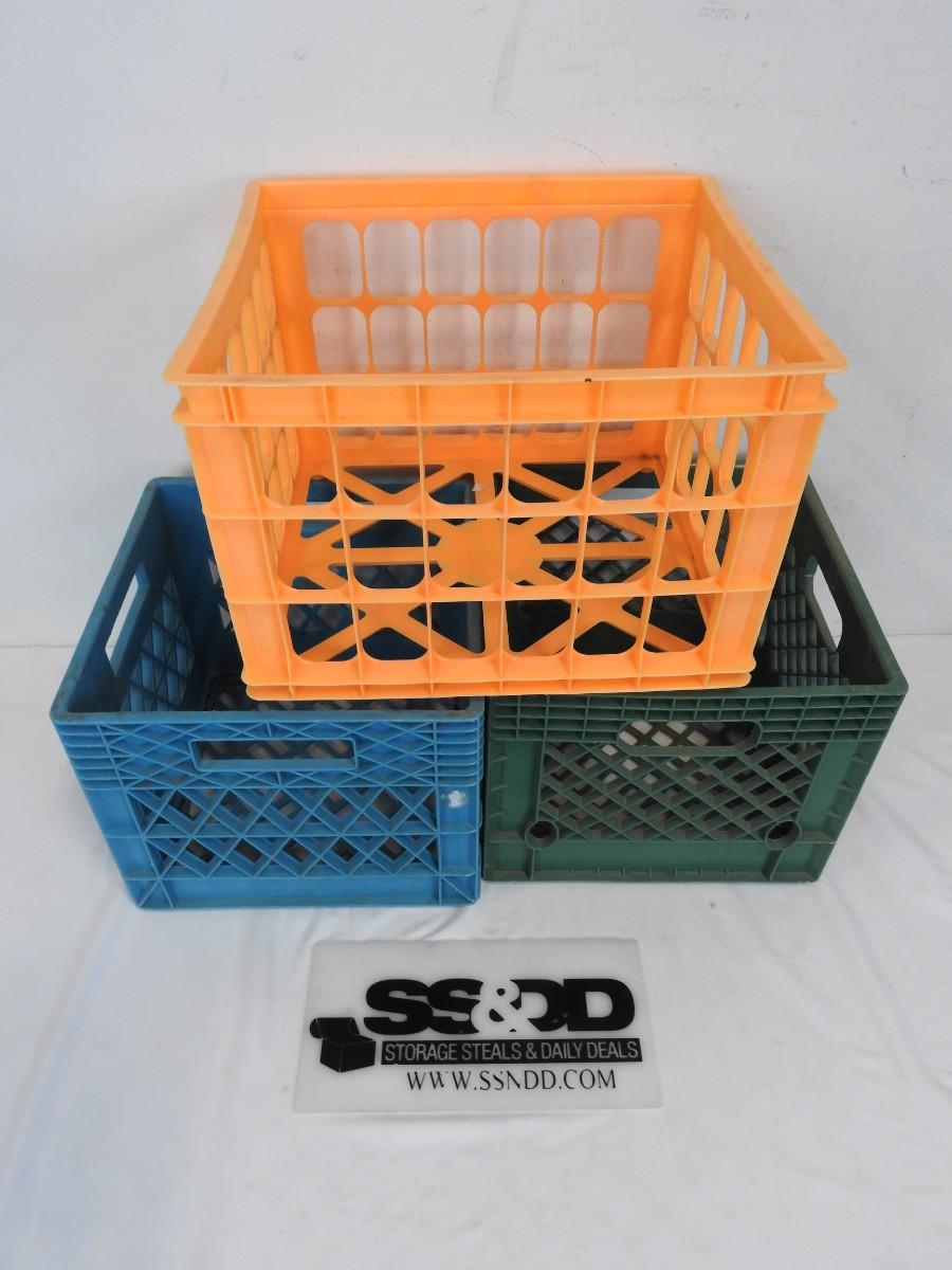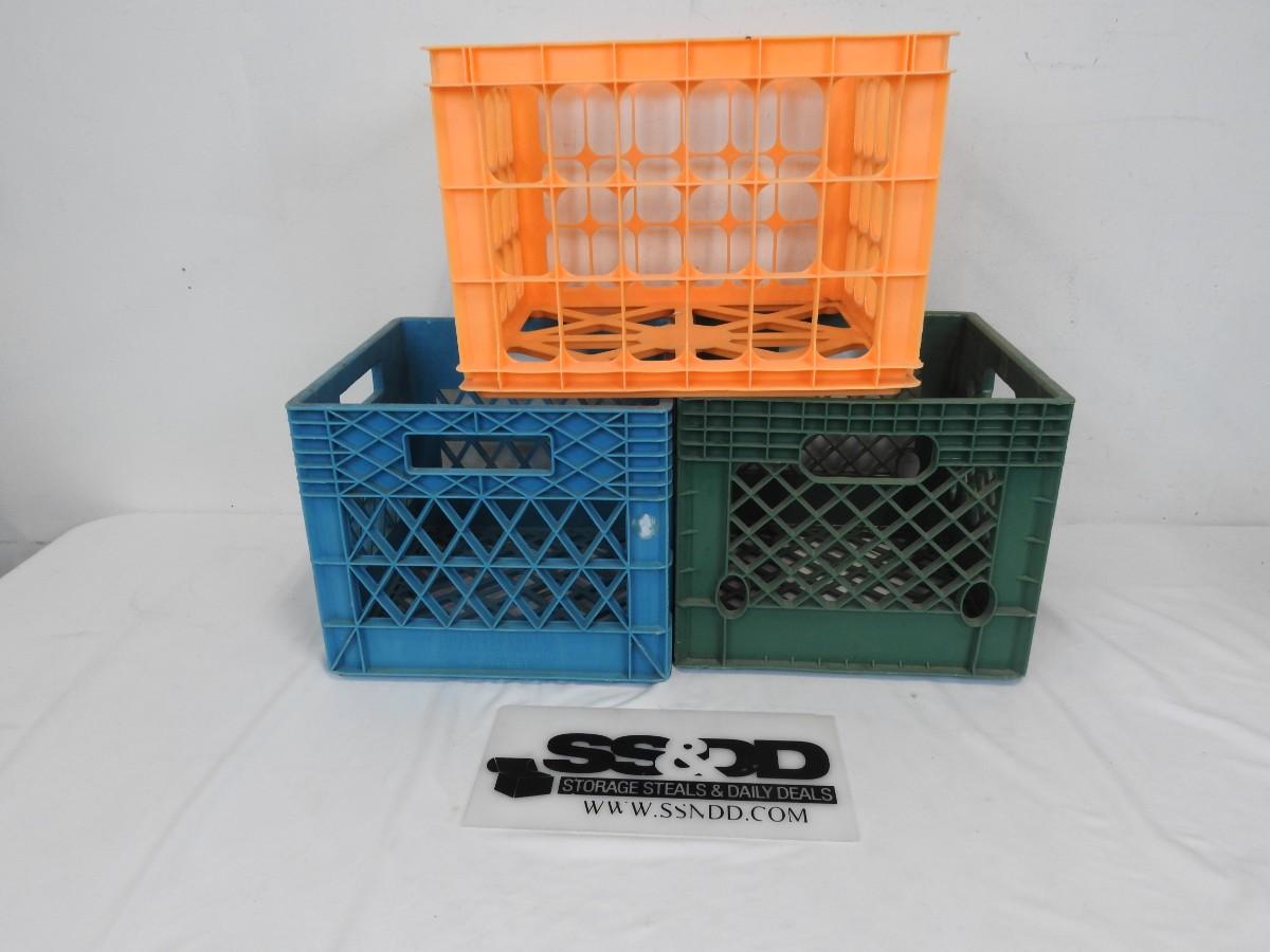 3 Plastic Milk Crates: Blue & Green are square, Orange is rectangle